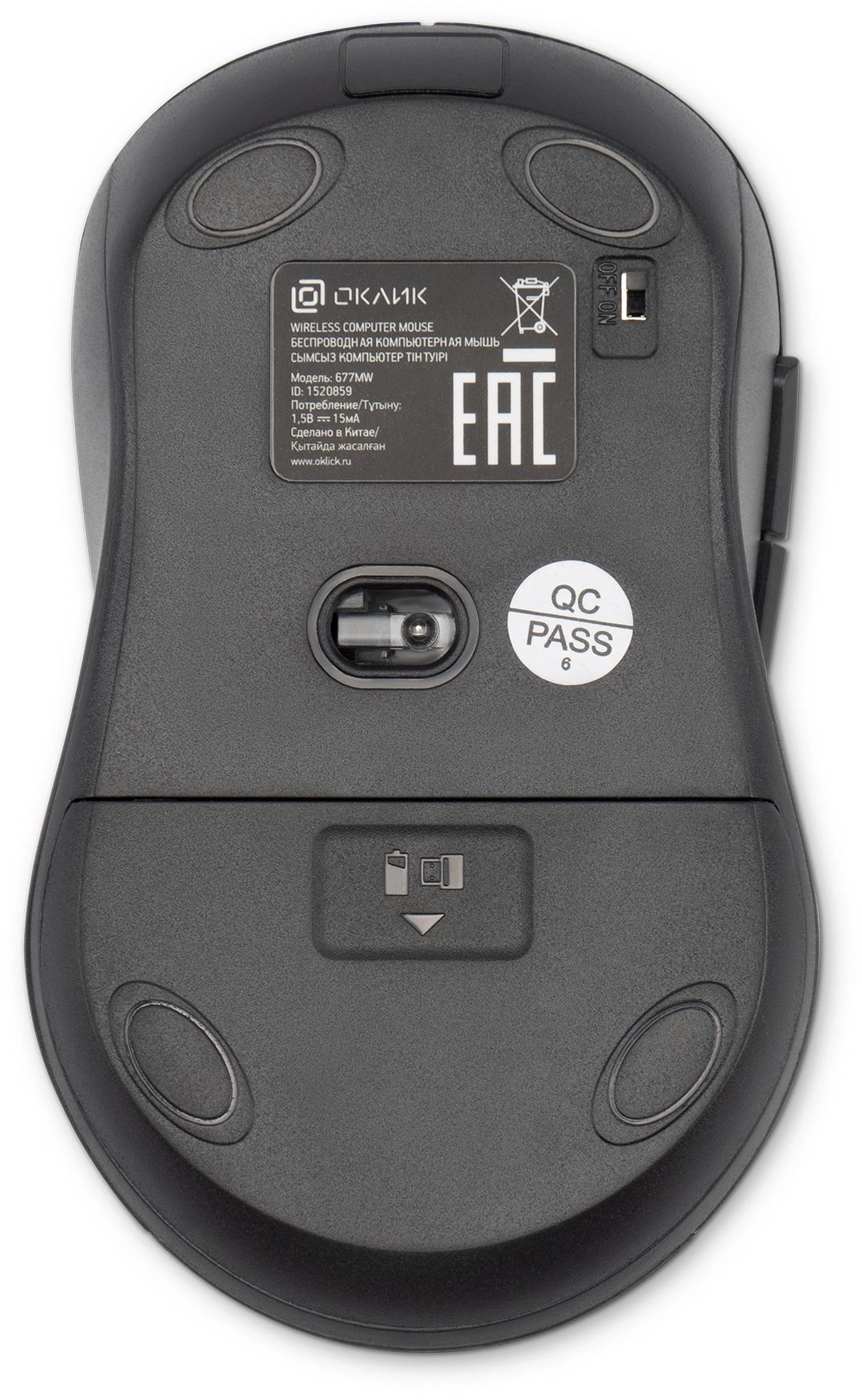 Oklick 677MW подключается к компьютеру по радиоканалу 2,4 ГГц. В комплекте идет USB-ресивер с радиусом действия 10 м, а также пальчиковая батарейка типа АА.