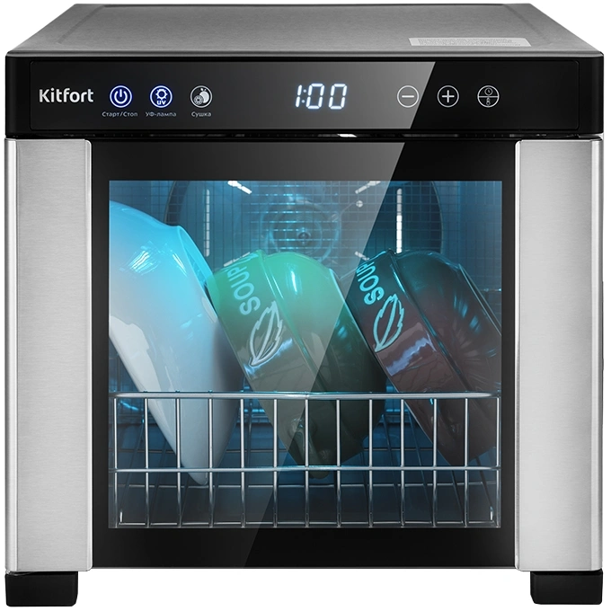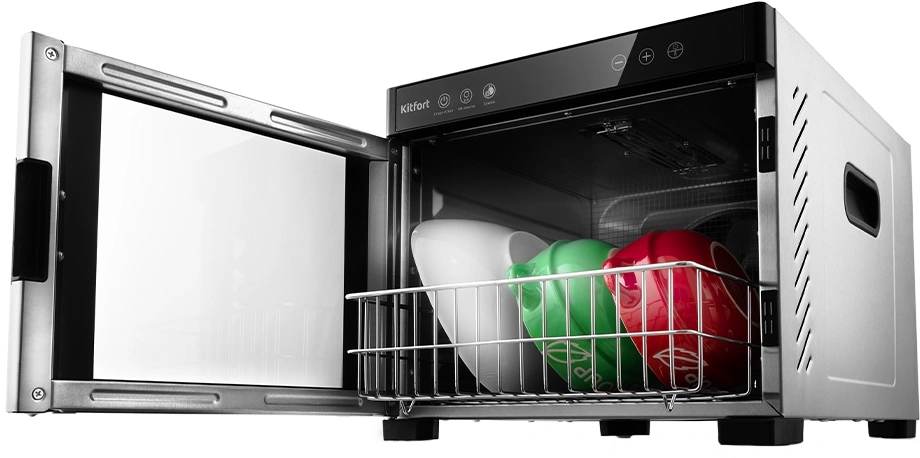 Помимо сушки в КТ-1916 можно сушить и одновременно дезинфицировать посуду ультрафиолетовым излучением с помощью УФ-лампы.