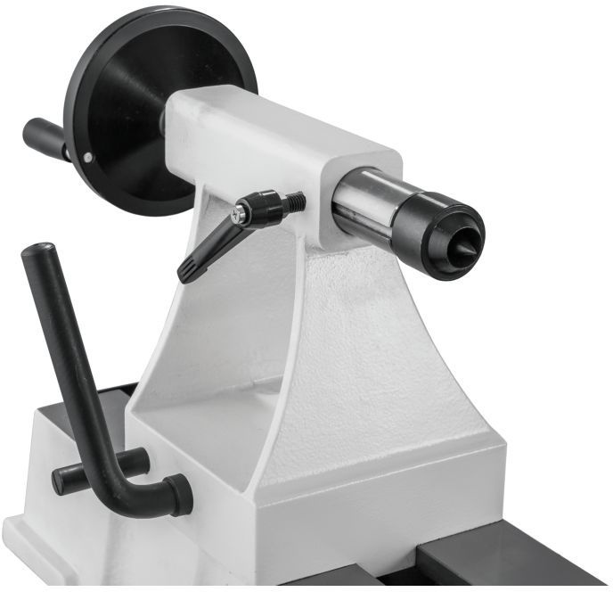 Массивная чугунная станина. Поворотная и подвижная передняя бабка. Жесткая фиксация углов поворота передней бабки через 45°. Цифровое отображение частоты вращения. Клиноременный вариатор (10 фиксированных скоростей). Эксцентриковая фиксация подручника и задней бабки.