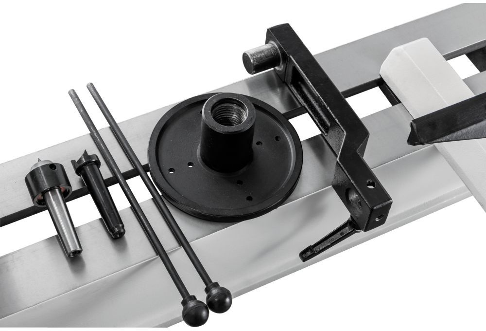 Подручник шириной 300 мм для токарного инструмента, Планшайба диаметром 150 мм, Четырехзубцовый поводковый центр МК-2, Вращающийся упорный центр, Выбивной шток.