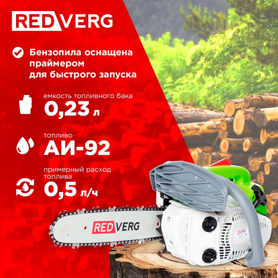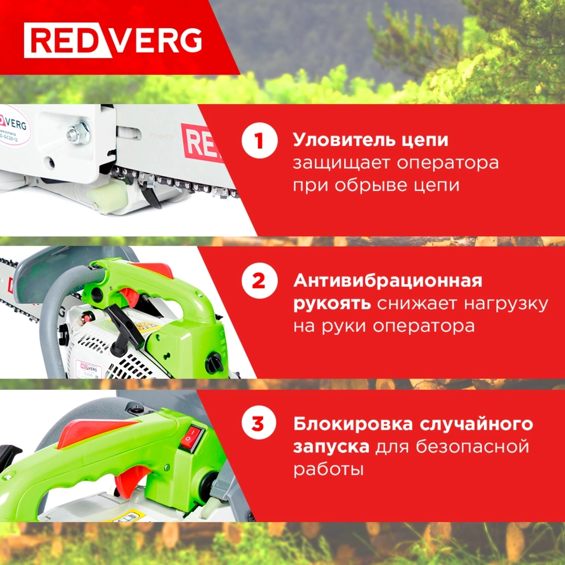 Бензопила RedVerg RD-GC25-12 предназначена для нечастого использования в домашнем или приусадебном хозяйстве в таких общих областях применения, как расчистка зарослей кустарника, обрезка ветвей, распиливание дров и т. д. Эта бензопила не предназначена для интенсивного использования.