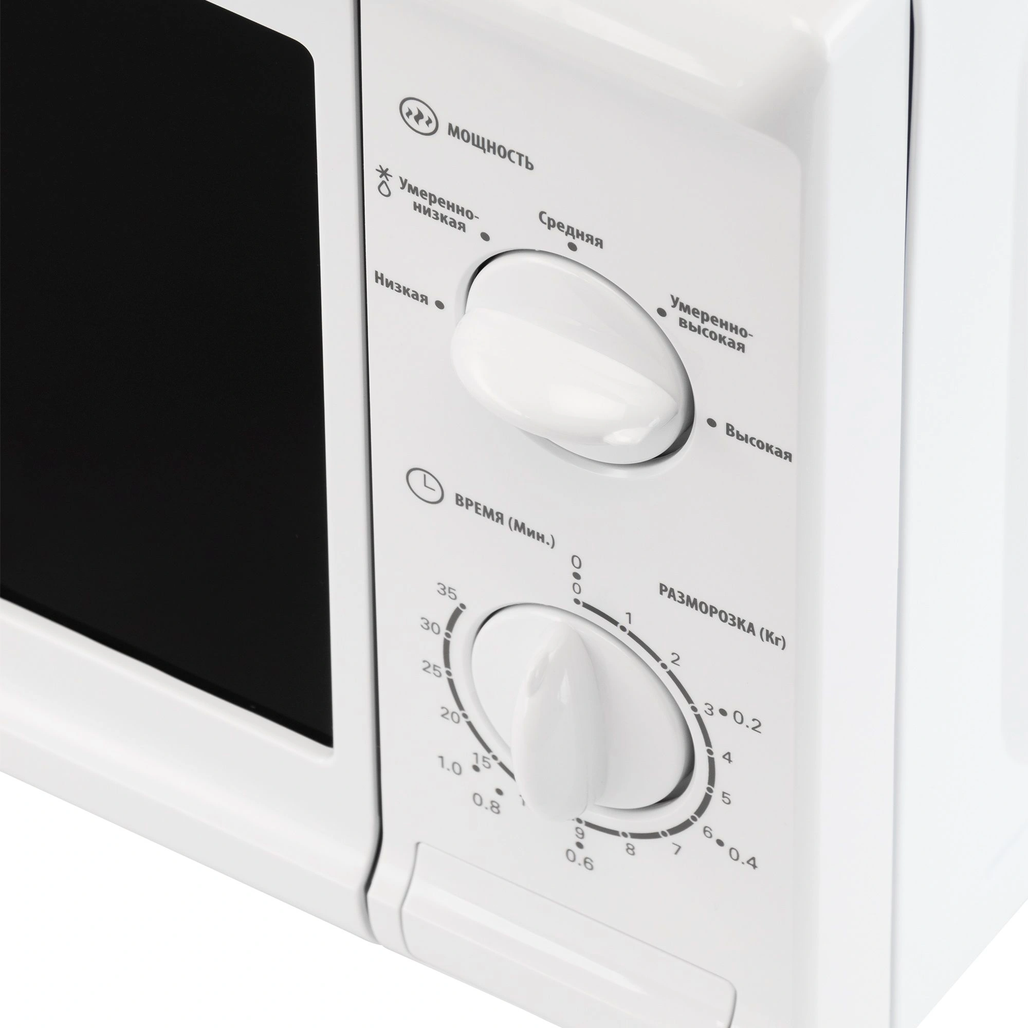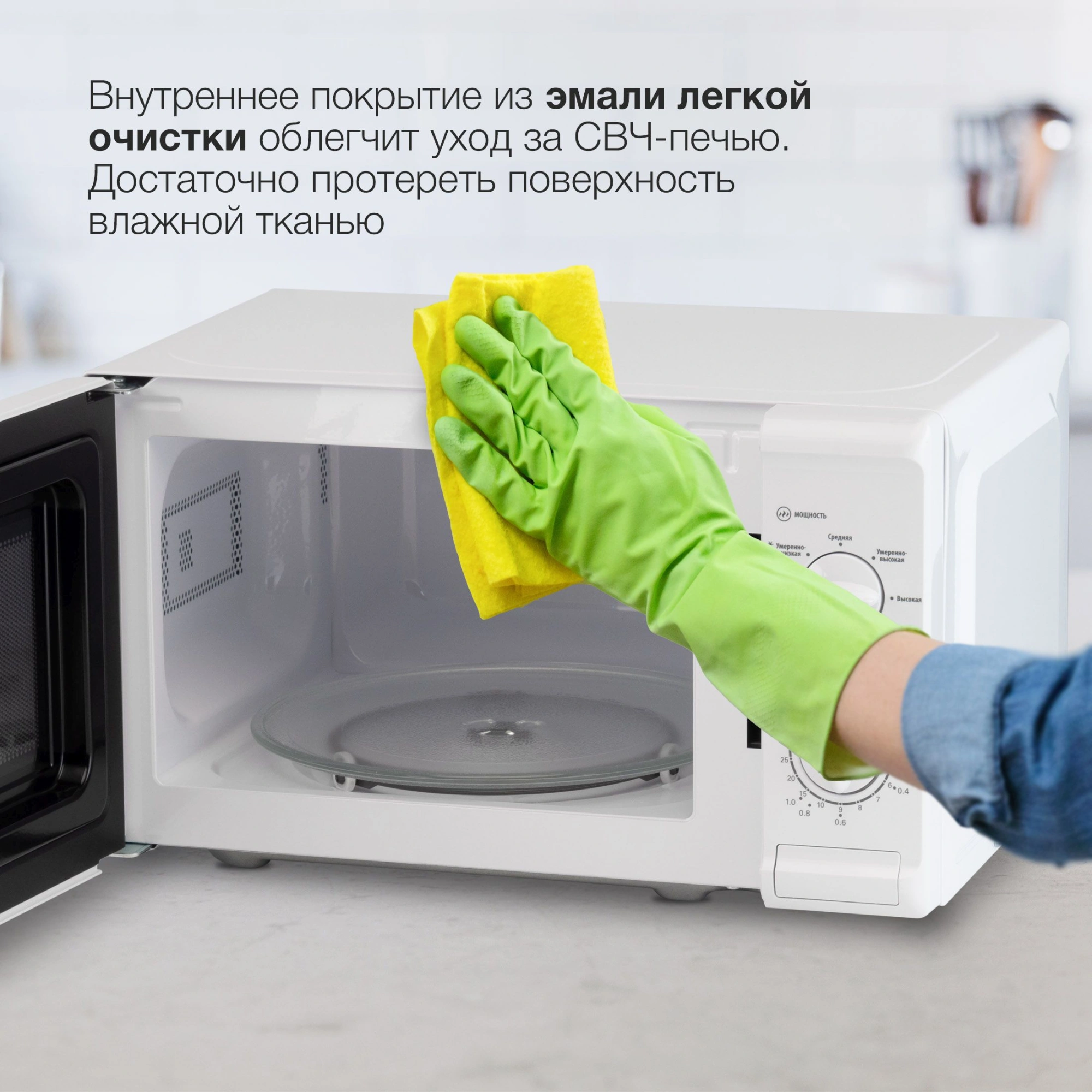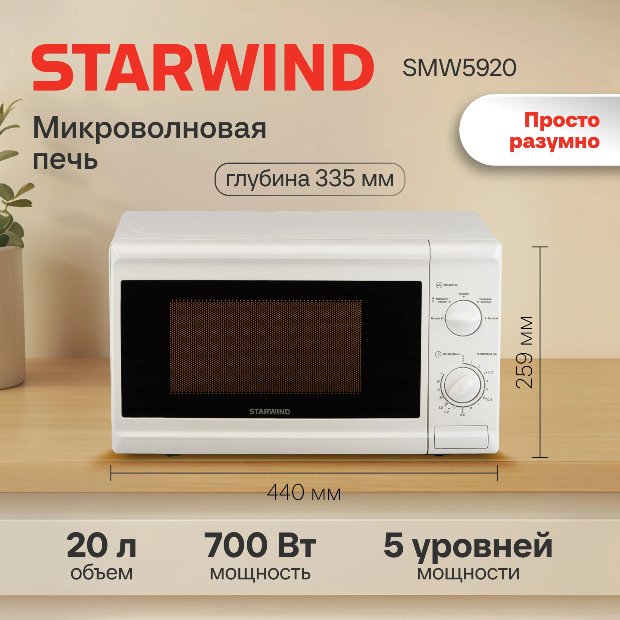 Микроволновая печь Starwind SWM5920 обладает мощностью в 700 Ватт, а объем камеры для приготовления пищи составляет 20 литров. У оборудования предусмотрена подвесная дверка, которая открывается простым нажатием кнопки. Стекло у прибора жаропрочное, черного цвета, при этом сам корпус белый. Микроволновая печь выглядит стильно и привлекательно. Для выбора режима работы, установки таймера есть два механических переключателя круглой формы, которые отличаются надежностью и долговечностью эксплуатации. Покрытие внутренней камеры у микроволновой печи создано из термостойкой эмали. Она легко моется при помощи обычной воды и чистящего средства. Для удобства эксплуатации в оборудовании предусмотрена функция автоматического размораживания.
