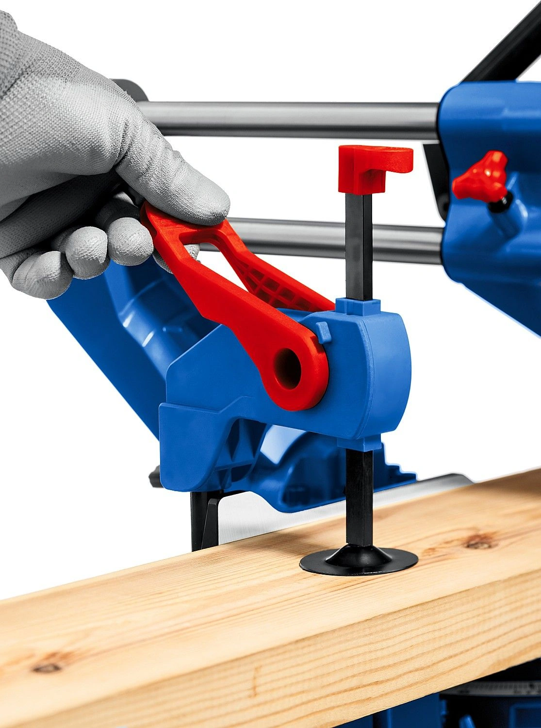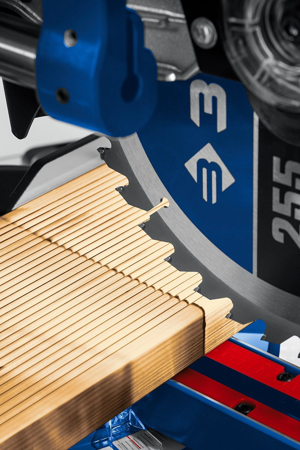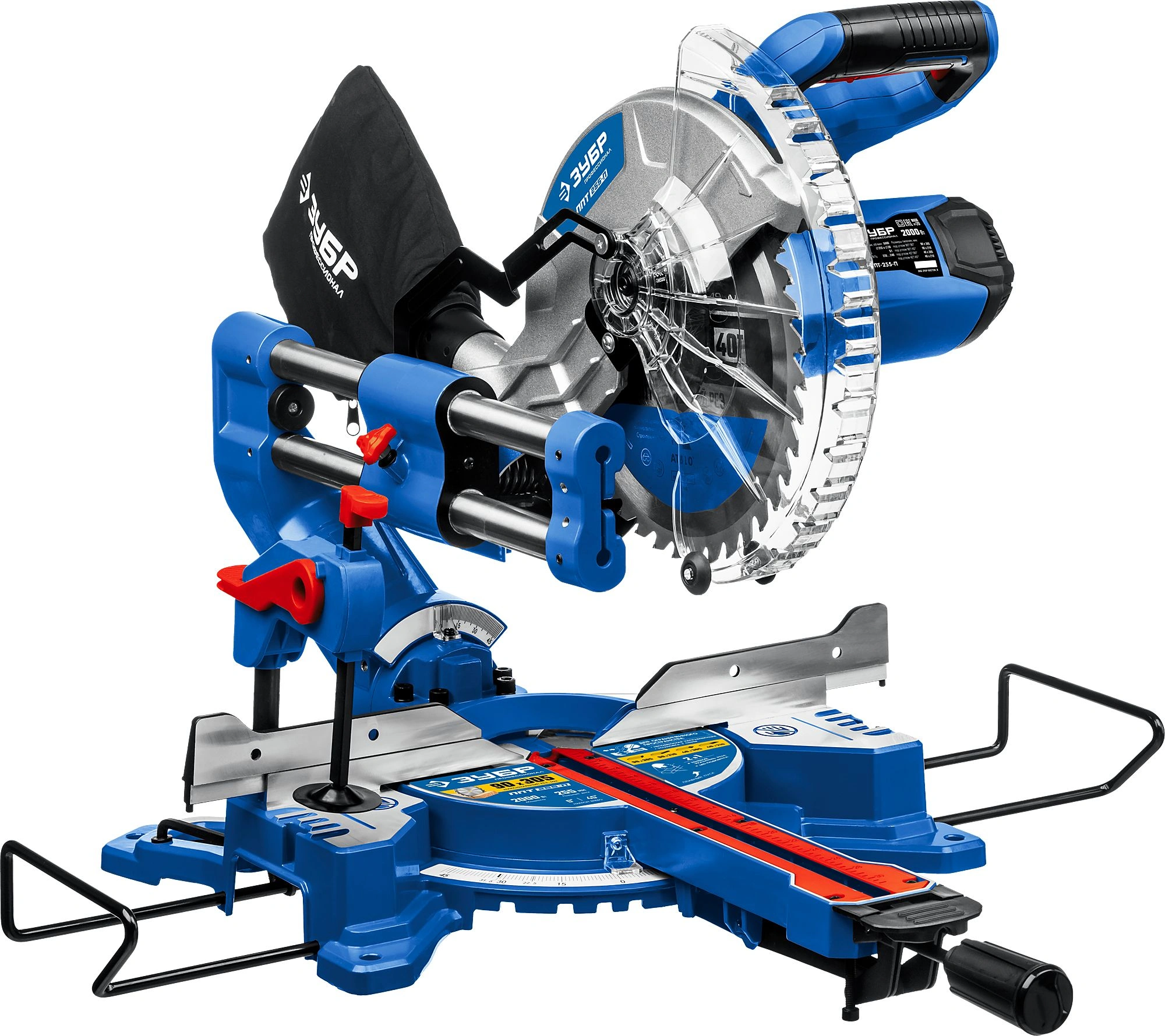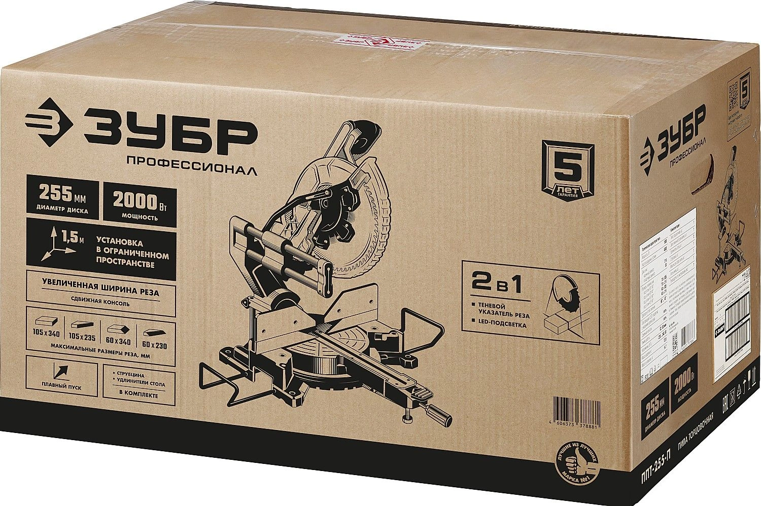 Высокая точность реза. Сдвижная консоль. Плавный пуск. Удобная регулировка наклона. LED-подсветка с указателем реза. Автоматически закрывающийся кожух. Удлинители стола.