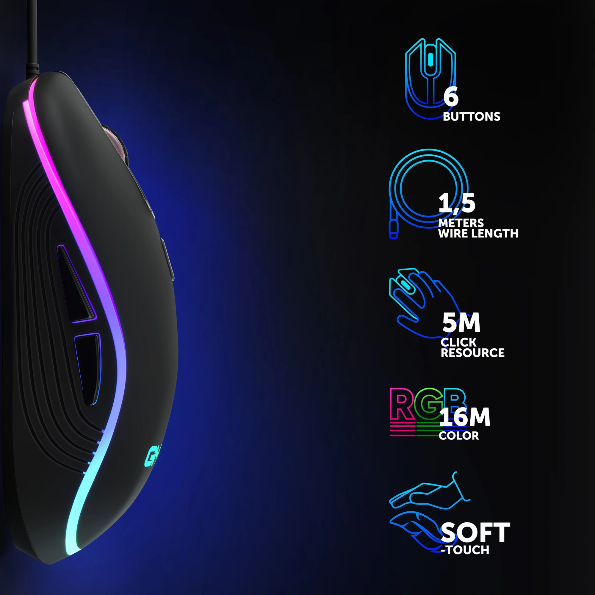 6 кнопок, включая колесо прокрутки с прорезиненной поверхностью для улучшенного сцепления, расширяют функциональные возможности устройства. Каждая кнопка отличается четким и отзывчивым нажатием, чтобы быстро реагировать на события в игре.