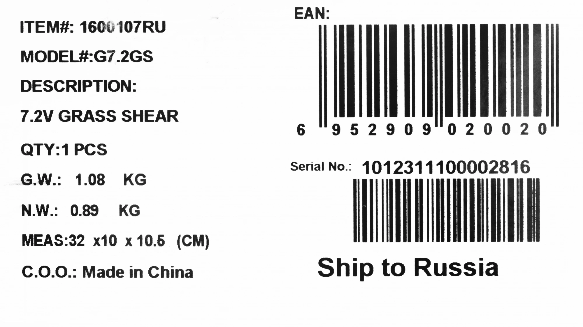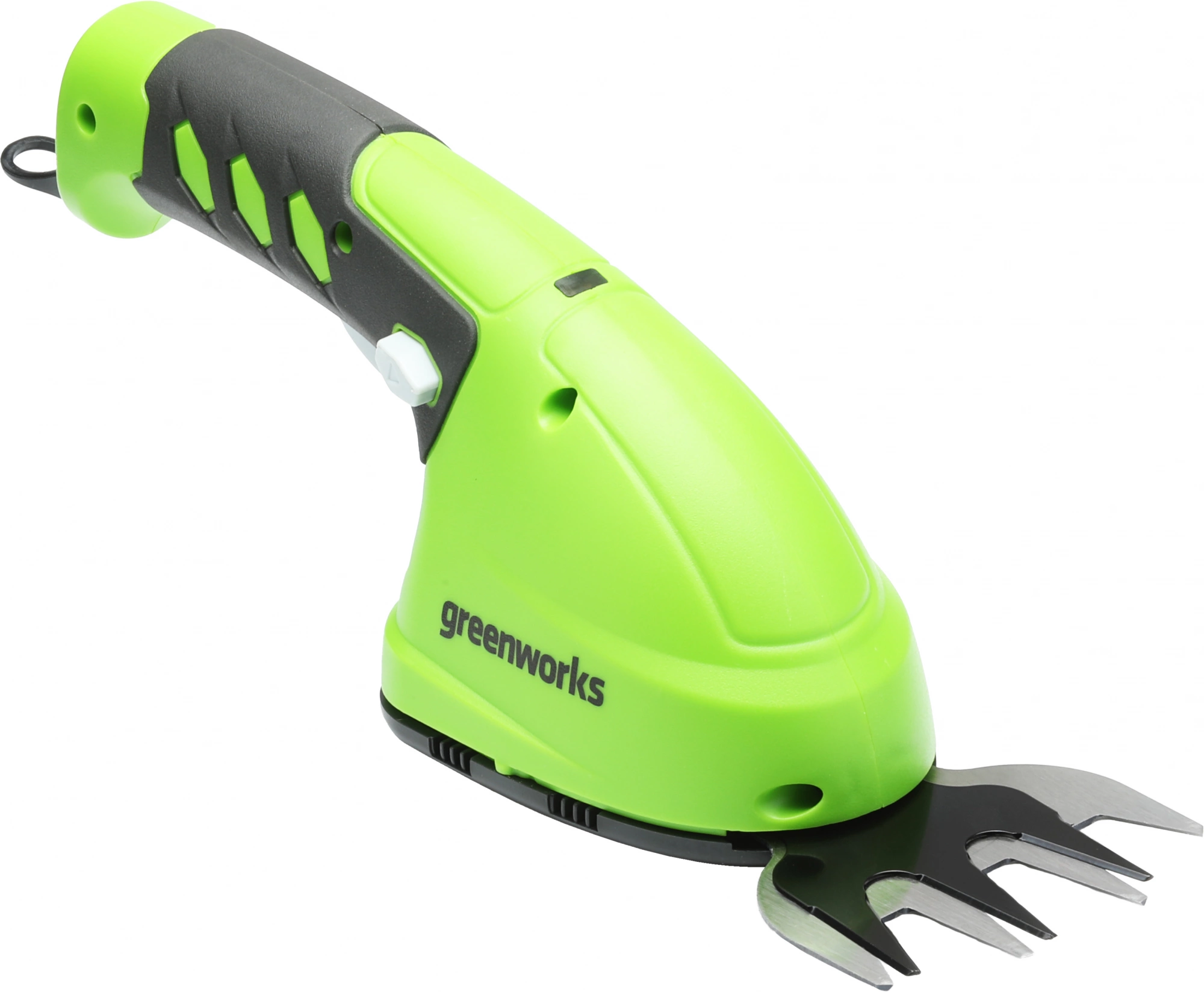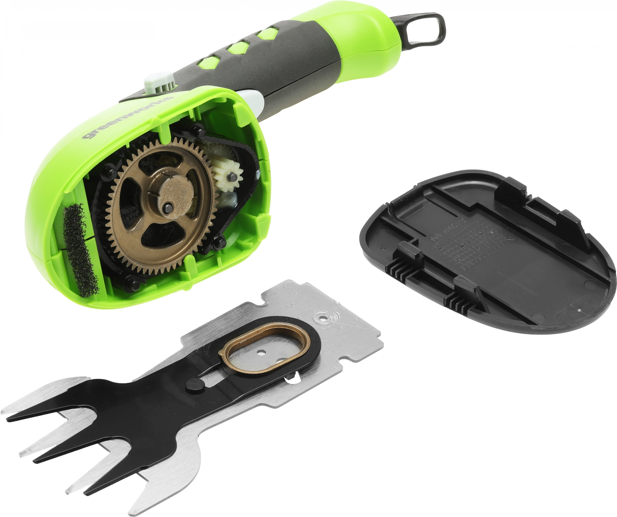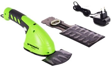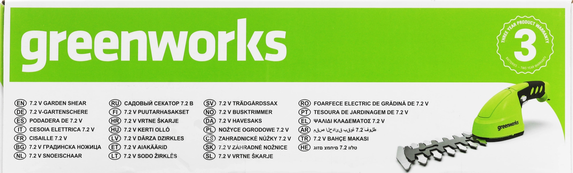 Ножницы аккумуляторные GreenWorks, 7.2V; Лезвие для травы с чехлом; Лезвие - кусторез с чехлом; Зарядное устройство; Руководство по эксплуатации; Гарантийный талон.