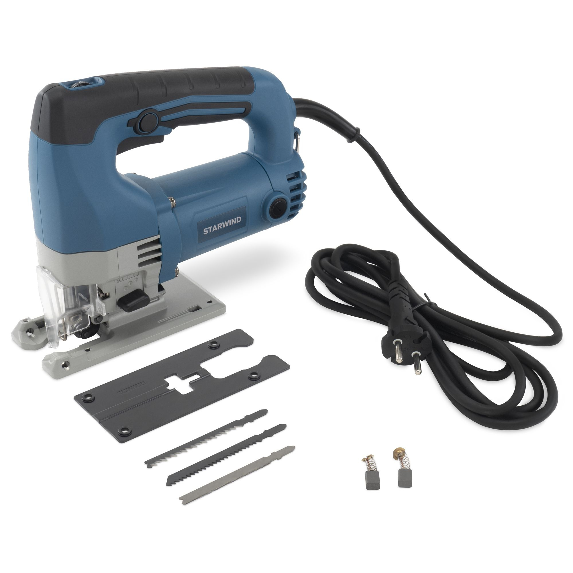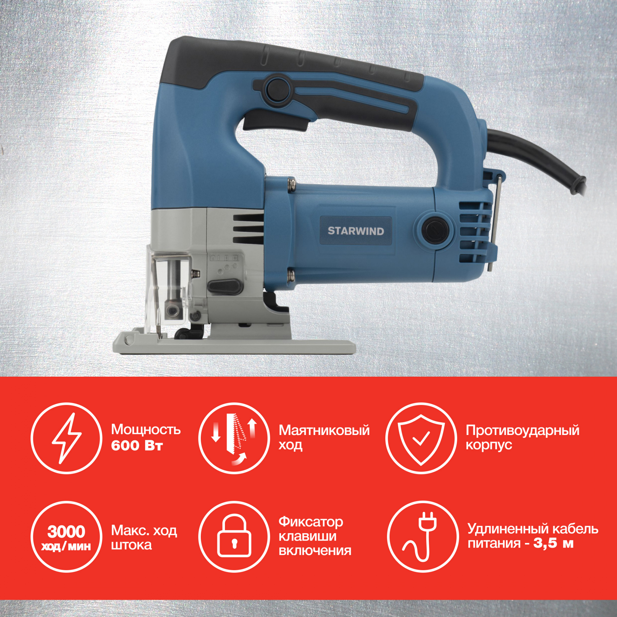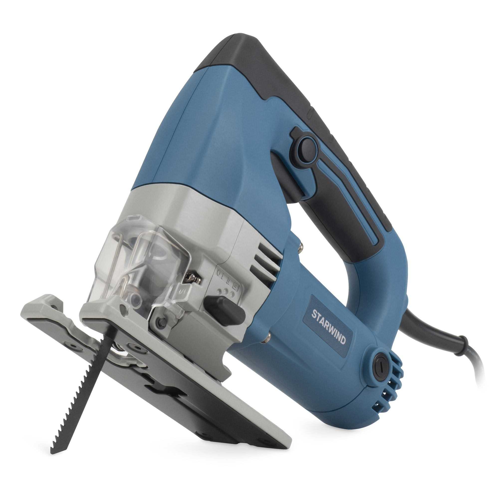 Лобзик Starwind JP-65-600 подойдёт для прямого и фигурного пиления деревянных или металлических деталей небольшой толщины. Сбалансированный двигатель значительно уменьшает коэффициент шума и вибраций. Удобная рукоятка позволяет тщательно удерживать электроприбор. Мощность составляет порядка 600 Ватт, а производительность находится на уровне 500-3000 ход/мин. Оптимальная длина хода – 2,6 см. Подключается устройство к общей сети 220 Вольт, длина кабеля составляет 3,5 метра.