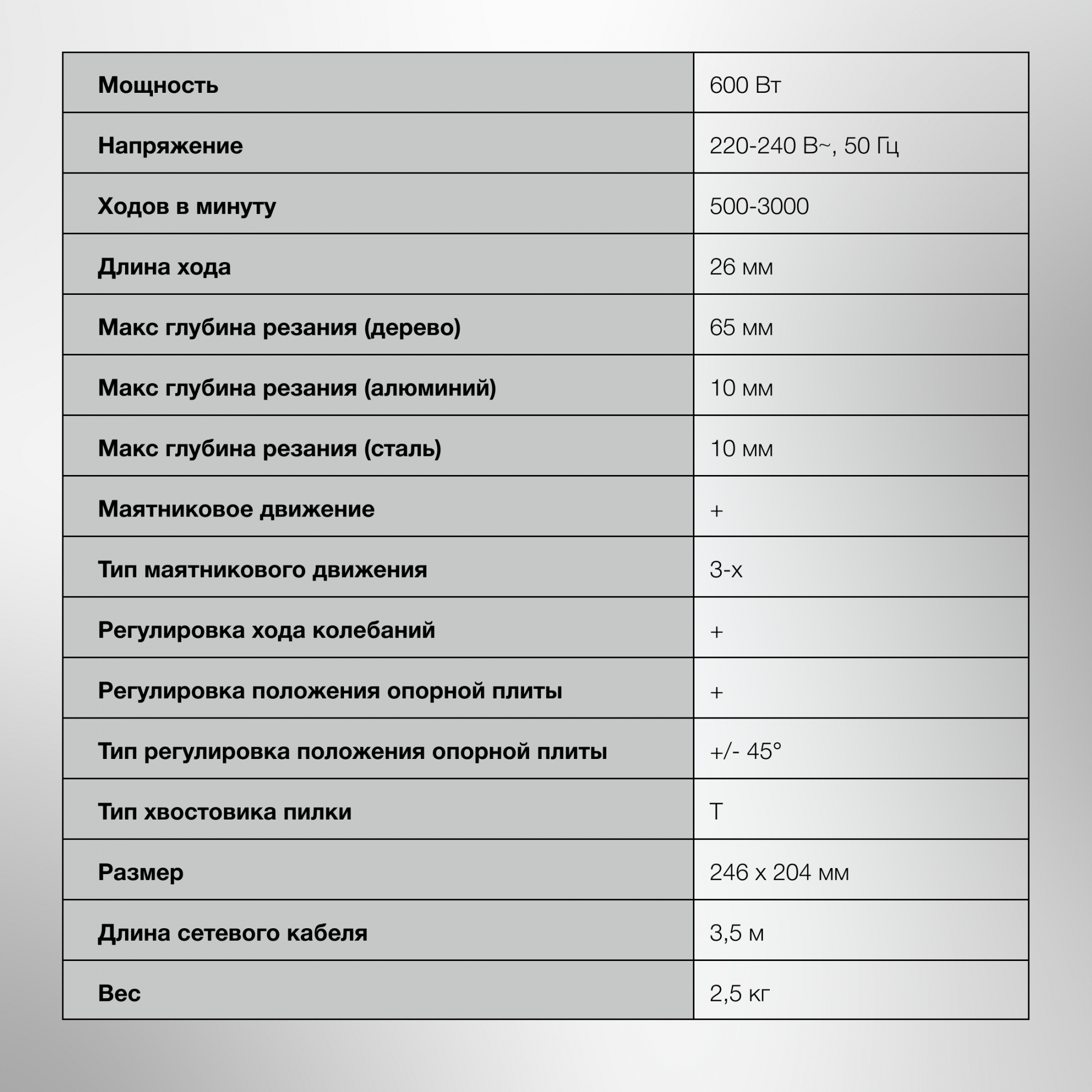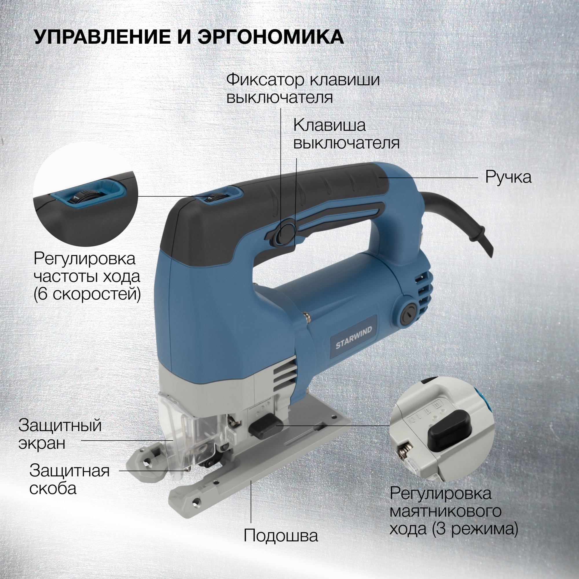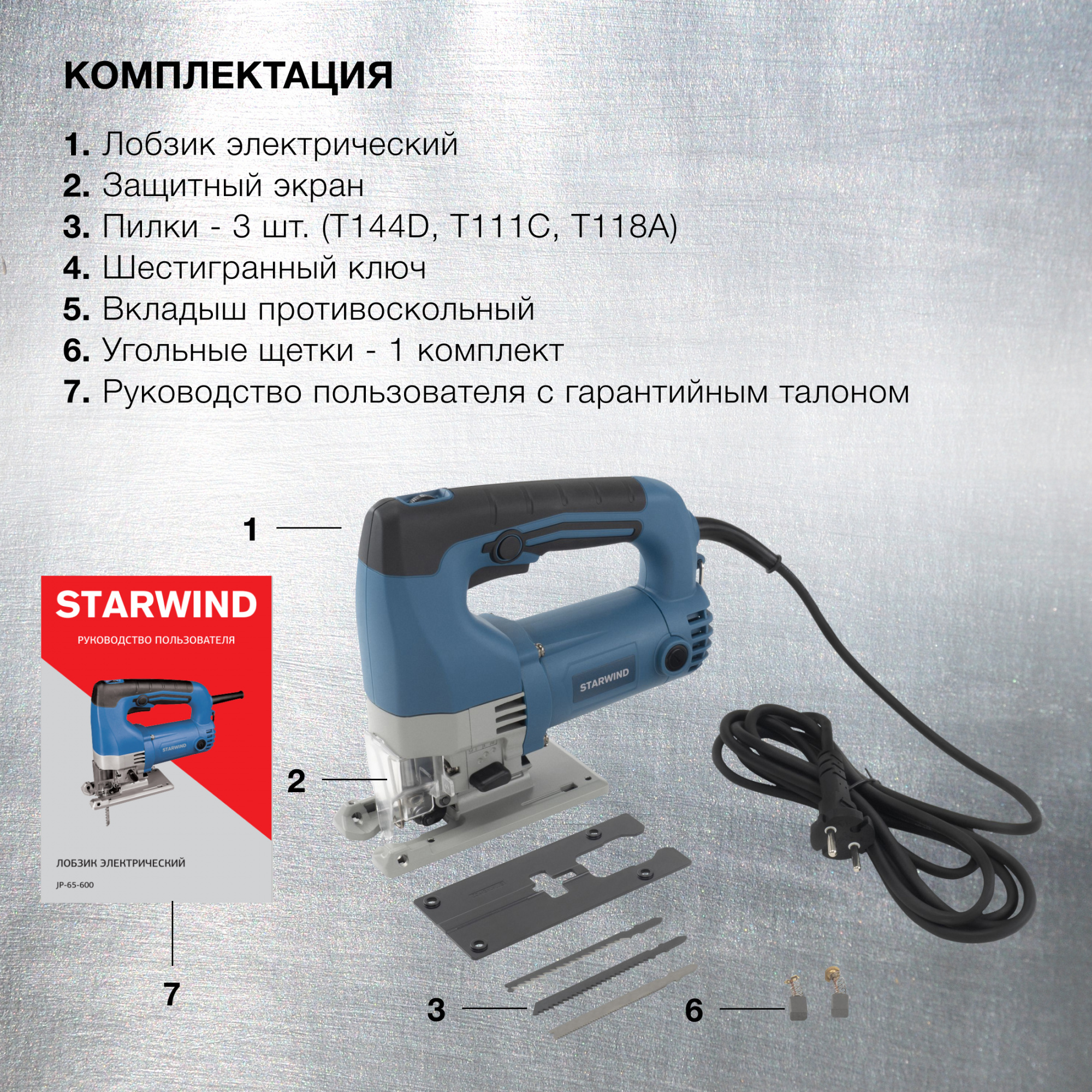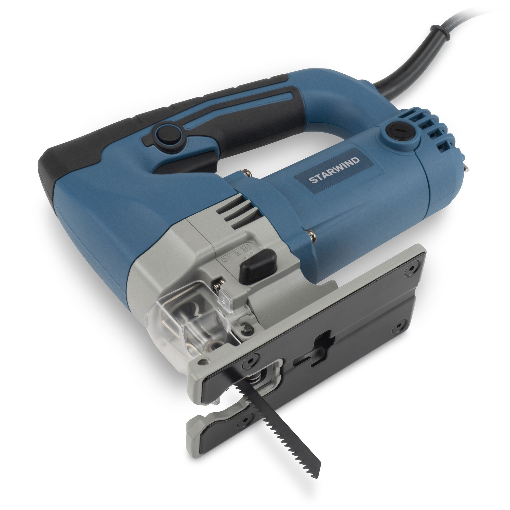 Лобзик Starwind JP-65-600 подойдёт для прямого и фигурного пиления деревянных или металлических деталей небольшой толщины. Сбалансированный двигатель значительно уменьшает коэффициент шума и вибраций. Удобная рукоятка позволяет тщательно удерживать электроприбор. Мощность составляет порядка 600 Ватт, а производительность находится на уровне 500-3000 ход/мин. Оптимальная длина хода – 2,6 см. Подключается устройство к общей сети 220 Вольт, длина кабеля составляет 3,5 метра.