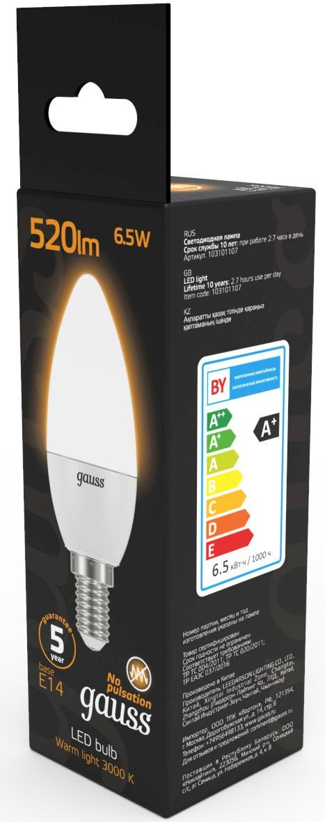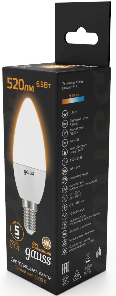 Светодиодная лампа Gauss - безопасный для здоровья и окружающей среды источник света. Она не пульсирует, мгновенно включается, не содержит ртути и имеет больший срок службы, чем лампы накаливания и КЛЛ, экономичнее ламп накаливания до 10 раз.