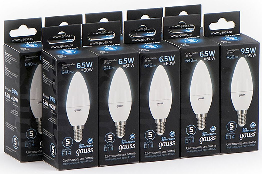 Лампа светодиодная Gauss Black 6.5Вт цок.:E14 свеча 220B св.свеч.бел.нейт. C37 (упак.:10шт) (103101207)