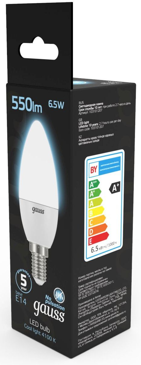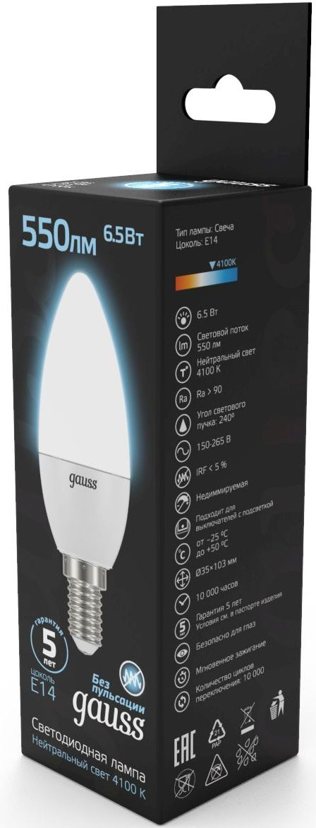 Светодиодная лампа Gauss - безопасный для здоровья и окружающей среды источник света. Она не пульсирует, мгновенно включается, не содержит ртути и имеет больший срок службы, чем лампы накаливания и КЛЛ, экономичнее ламп накаливания до 10 раз.