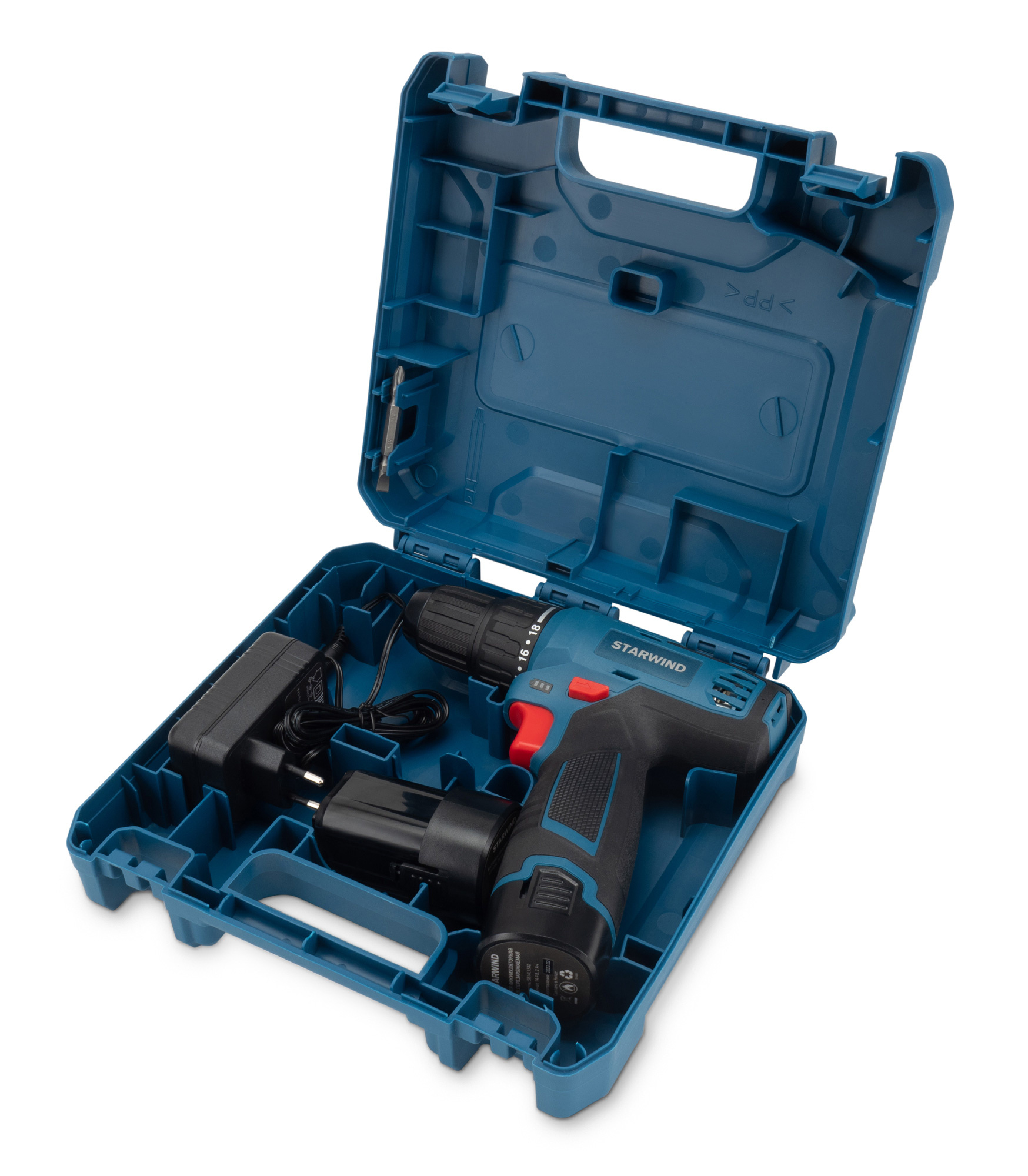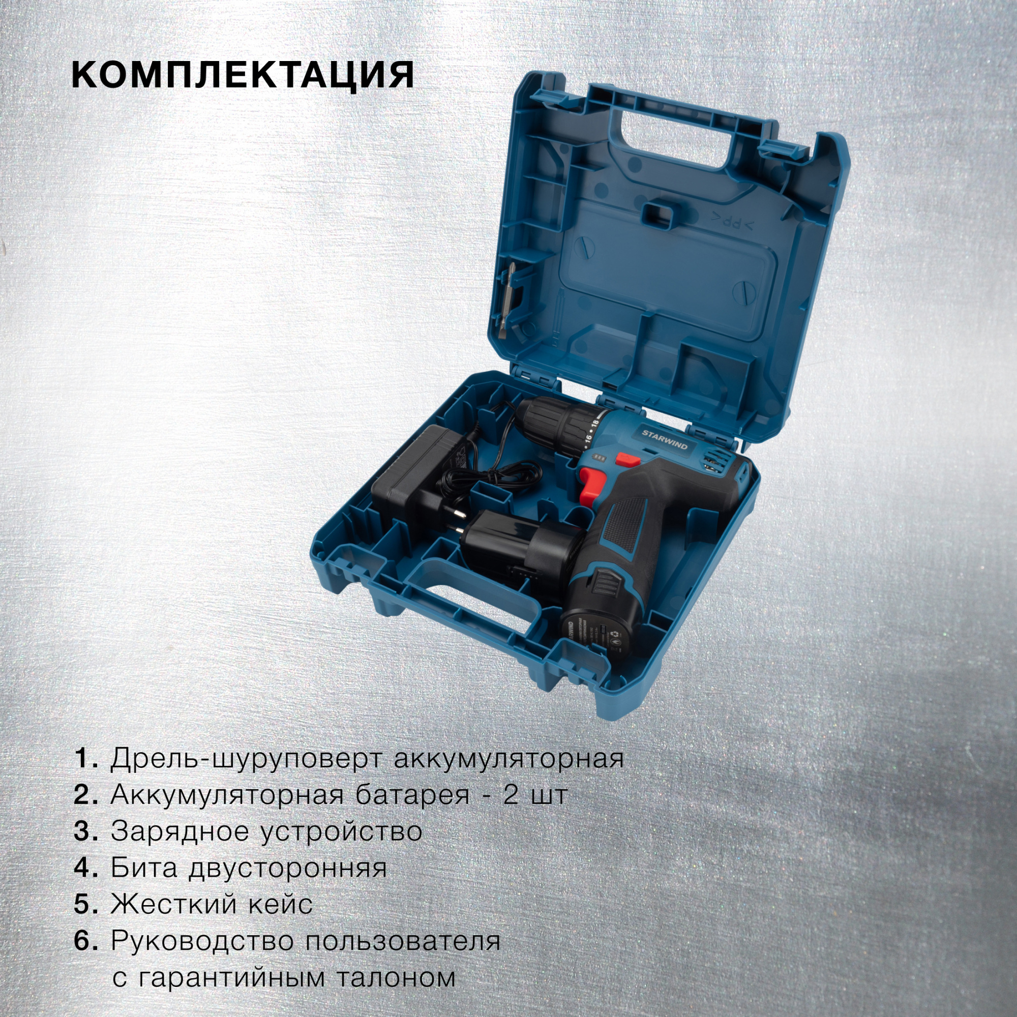Аккумуляторная дрель-шуруповерт, аккумулятор 14,4В - 2 шт., зарядное устройство, бита двусторонняя, руководство по эксплуатации, жесткий кейс.