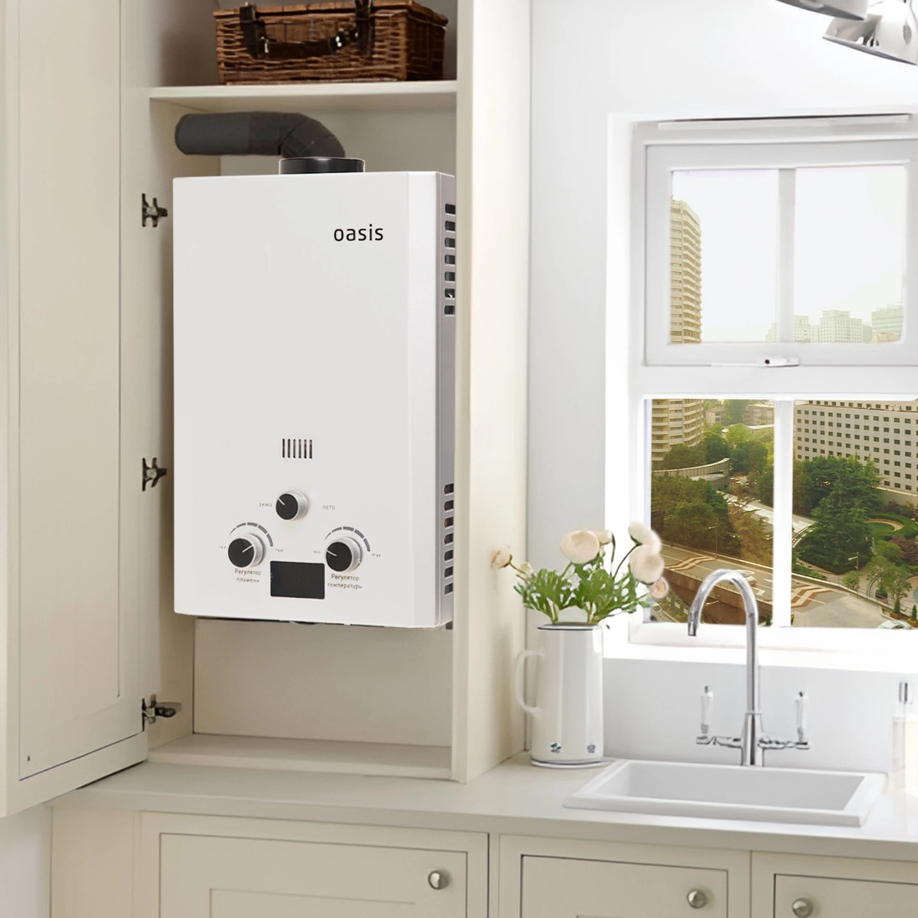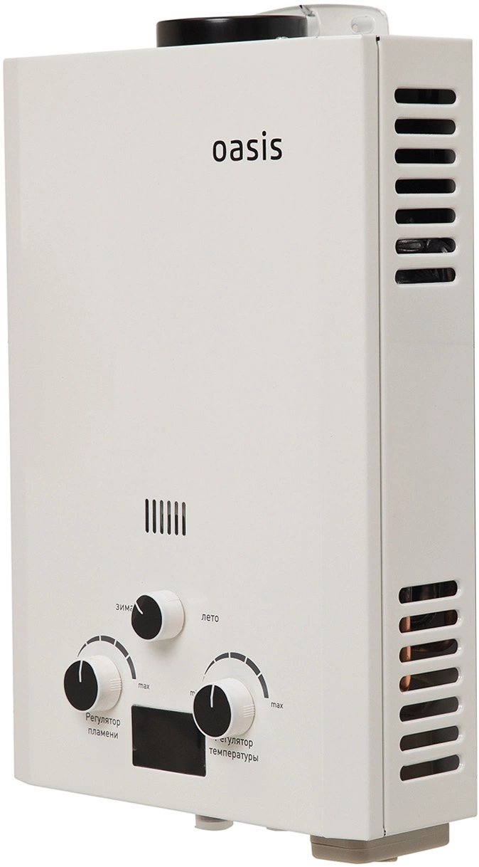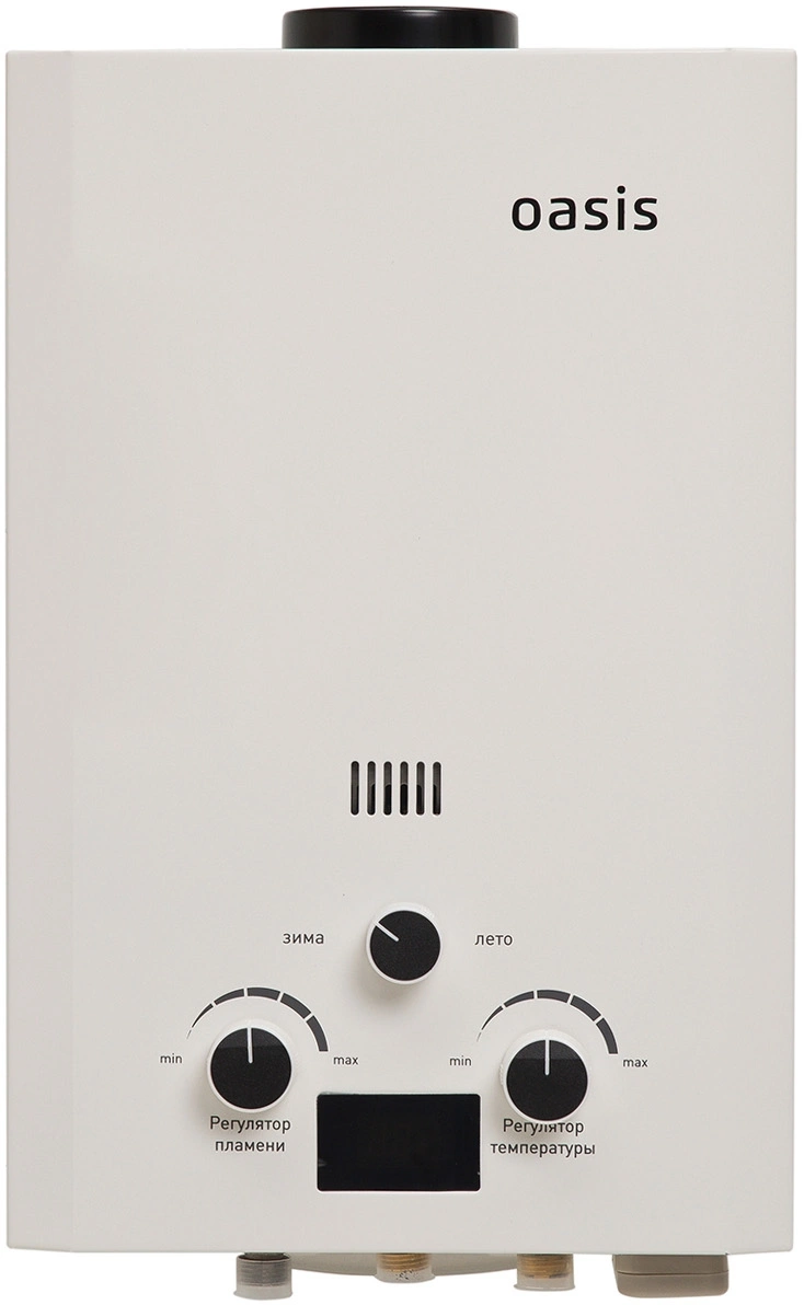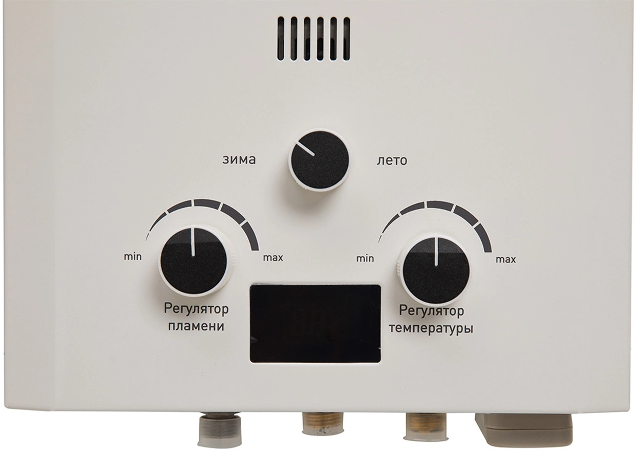 ЖК блок индикации температуры горячей воды, переключатель «зима-лето» для плавной регулировки горячей воды в теплое время года и экономии газа до 40-50%, высокий КПД (более 90%).