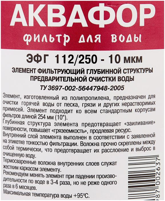Картридж Аквафор ЭФГ 112/250-10 изготовленный из вспененного полипропилена, предназначен для очистки холодной и горячей воды от песка, грязи, окалины, ржавчины и других нерастворимых примесей.