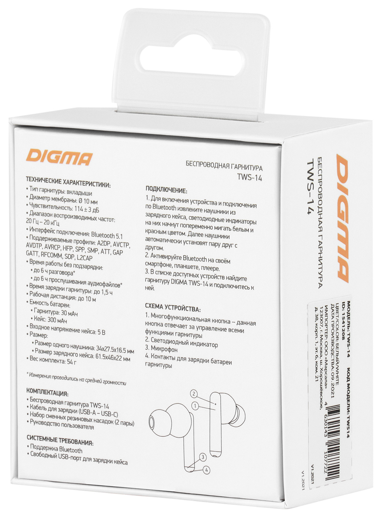 Беспроводная гарнитура TWS-14, кабель для зарядки (USB-A — USB-typeC), набор сменных резиновых насадок 2 пары, руководство пользователя.