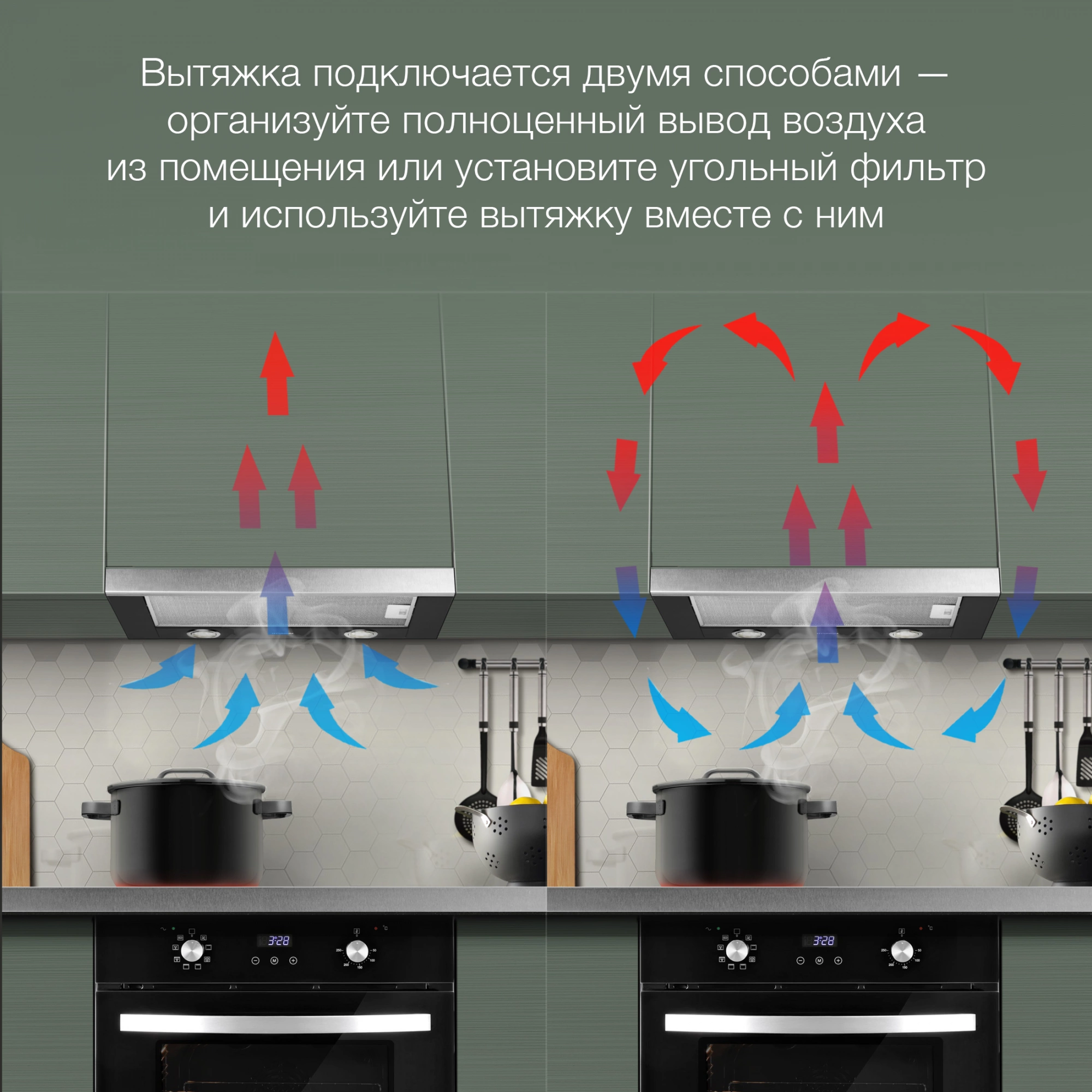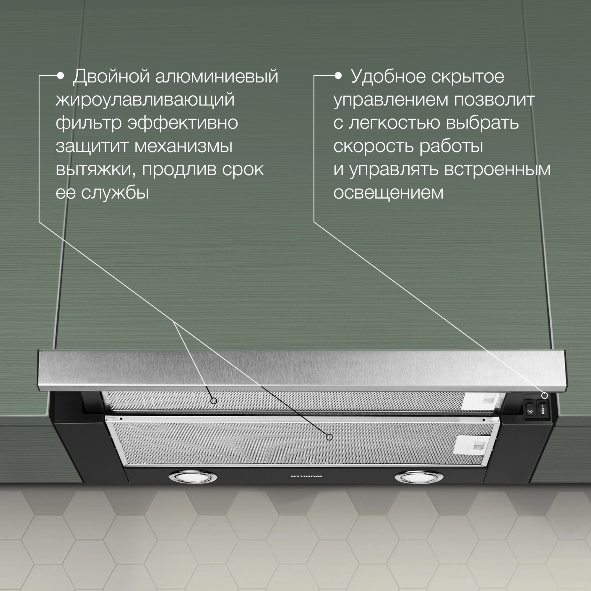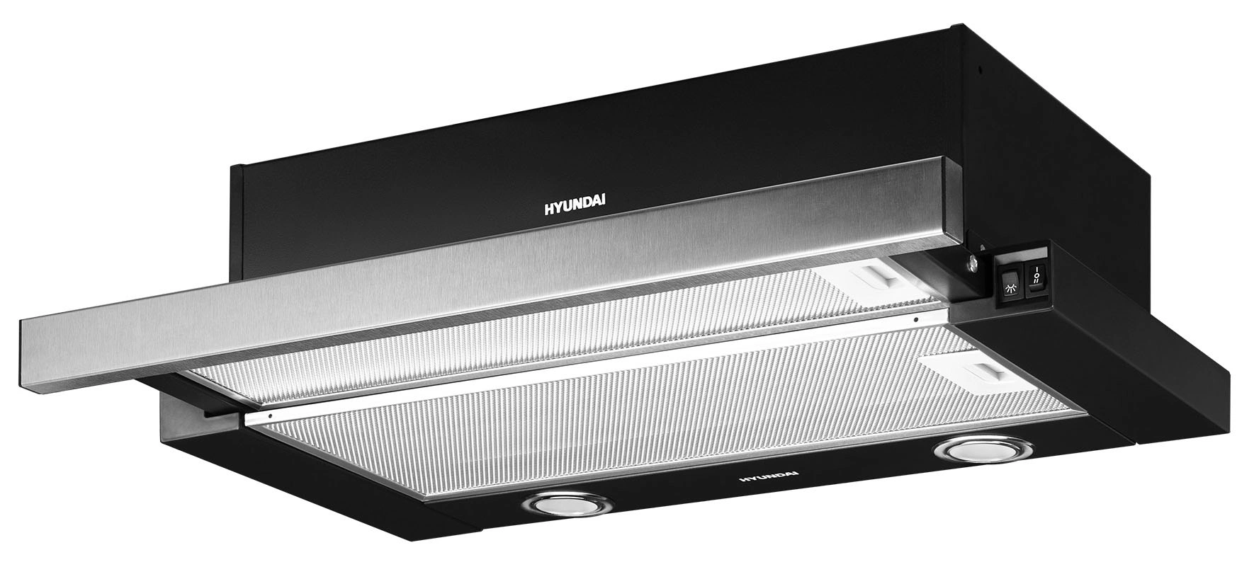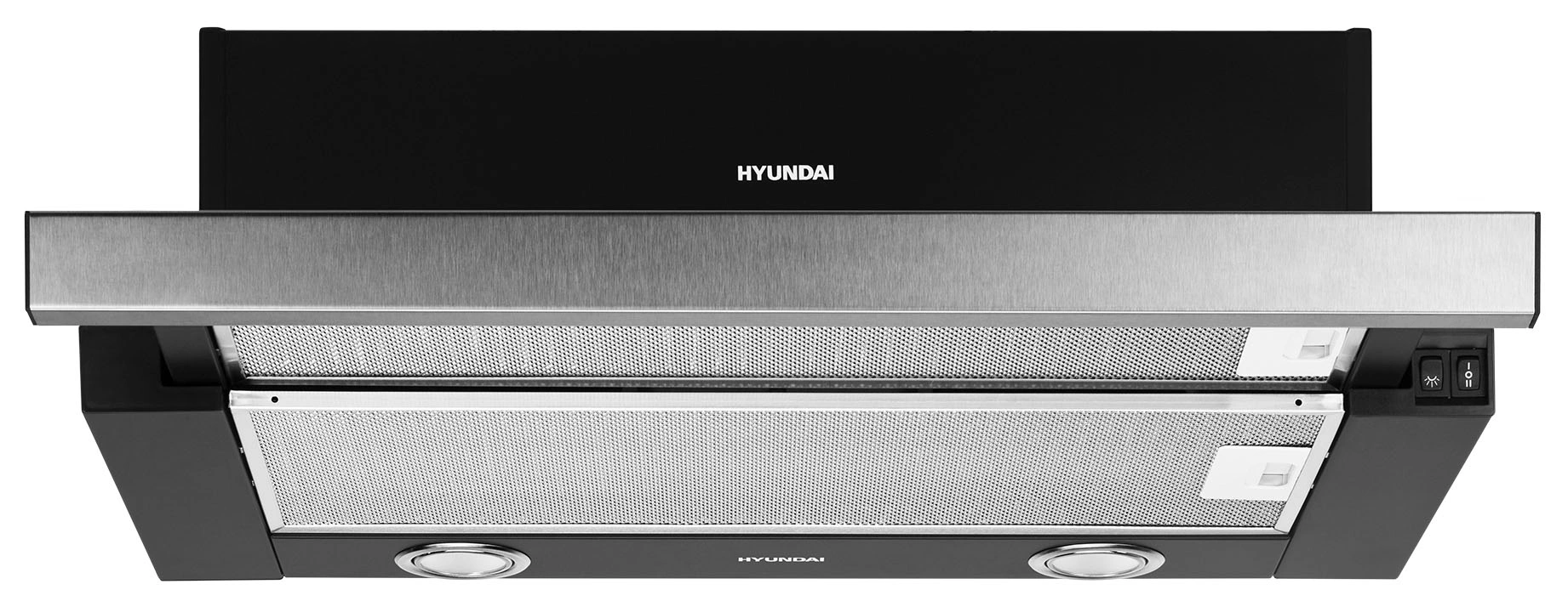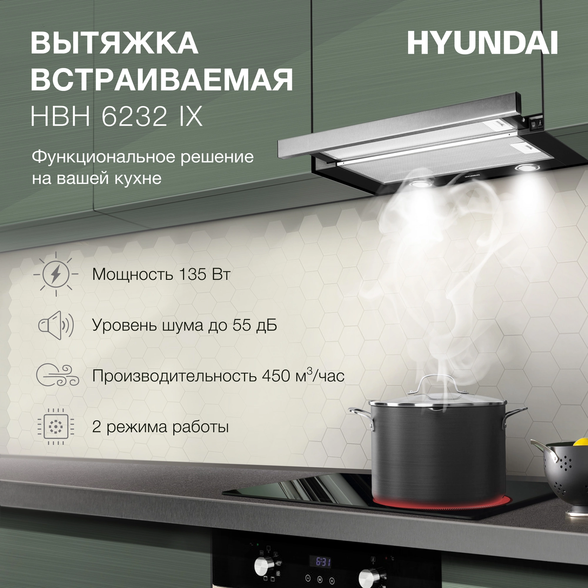 Если вы заинтересованы в том, чтобы вытяжка не бросалась в глаза – рекомендуем обратить внимание на модель HYUNDAI HBH 6232 IX с выдвижной панелью серебристого цвета.