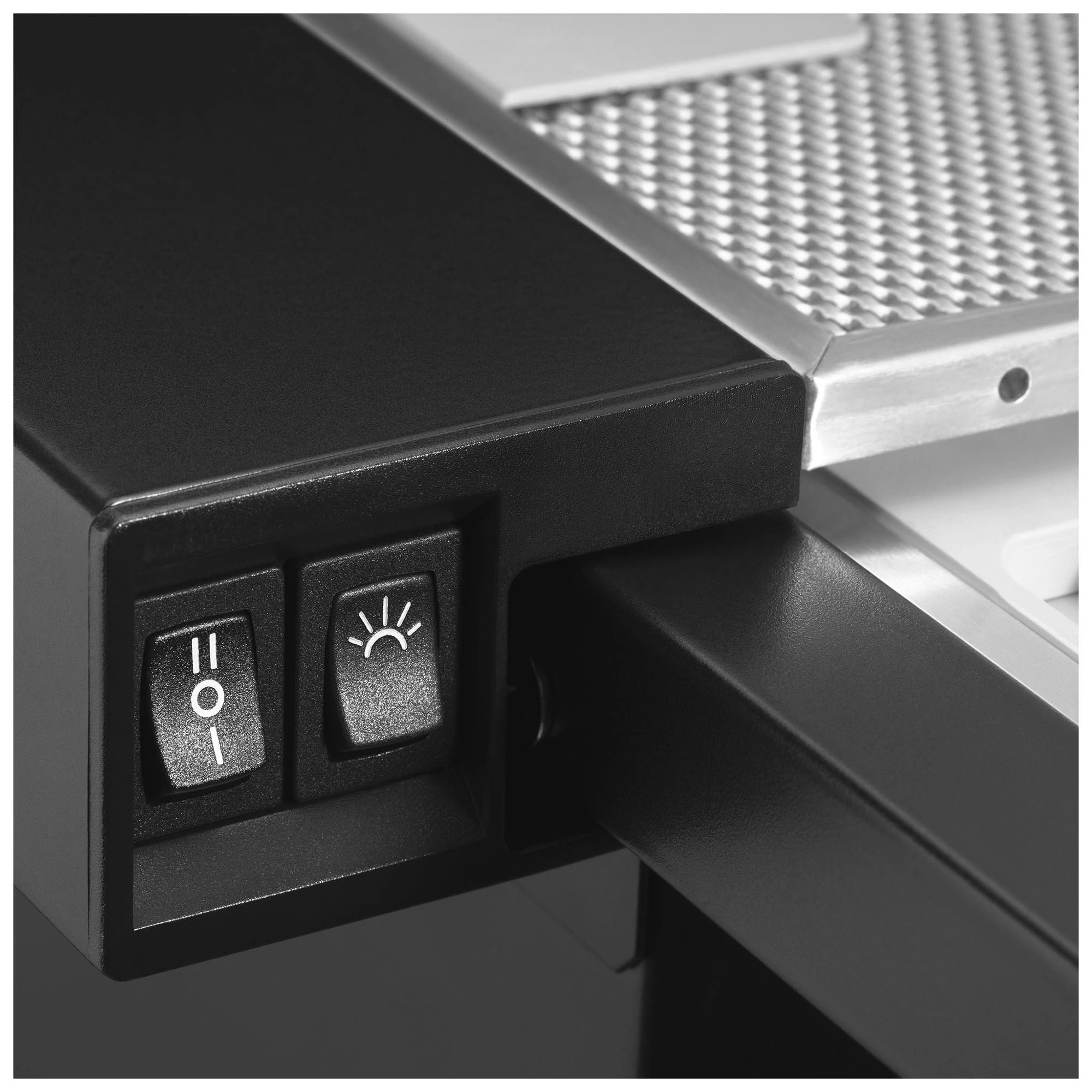 Если Вы не хотите ежедневно включать и выключать вытяжку, то можно включить комфортную скорость работы вентилятора и подсветку на панели управления. При выдвижении панели вытяжка включится в установленном режиме. Для выключения нужно просто задвинуть панель обратно.