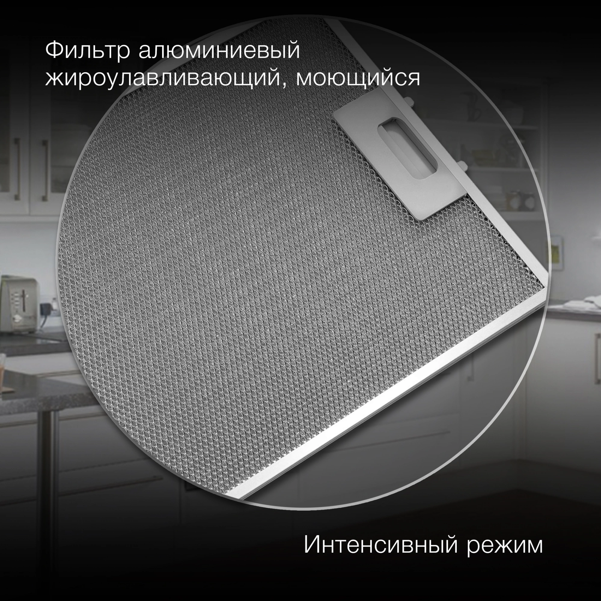 Вытяжка с настенным монтажом Hyundai HGH 6744 WG эргономично отводит воздух и заставляет его циркулировать, лишая посторонних запахов.
