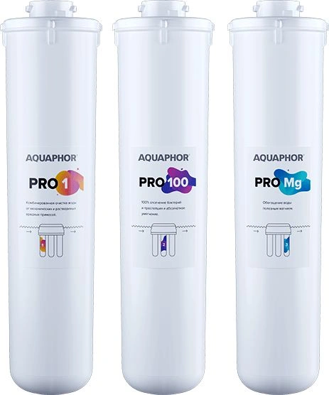 В комплект входит комбинация из трех сменных модулей Pro 1, Pro 100 и Pro Mg для обратноосмотической системы Аквафор Osmo Pro 100. Модули обеспечивают предфильтрацию, сверхглубокую очистку и финишную минерализацию даже мутной воды или воды с повышенным содержанием железа, включая Fe2+ и Fe3+.