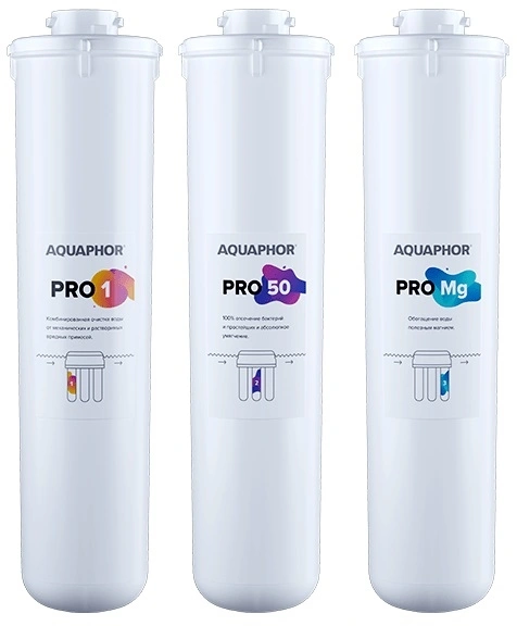 В комплект входит комбинация из трех сменных модулей Pro 1, Pro 50 и Pro Mg для обратноосмотической системы Аквафор Osmo Pro 50. Модули обеспечивают предфильтрацию, сверхглубокую очистку и финишную минерализацию даже мутной воды или воды с повышенным содержанием железа, включая Fe2+ и Fe3+.