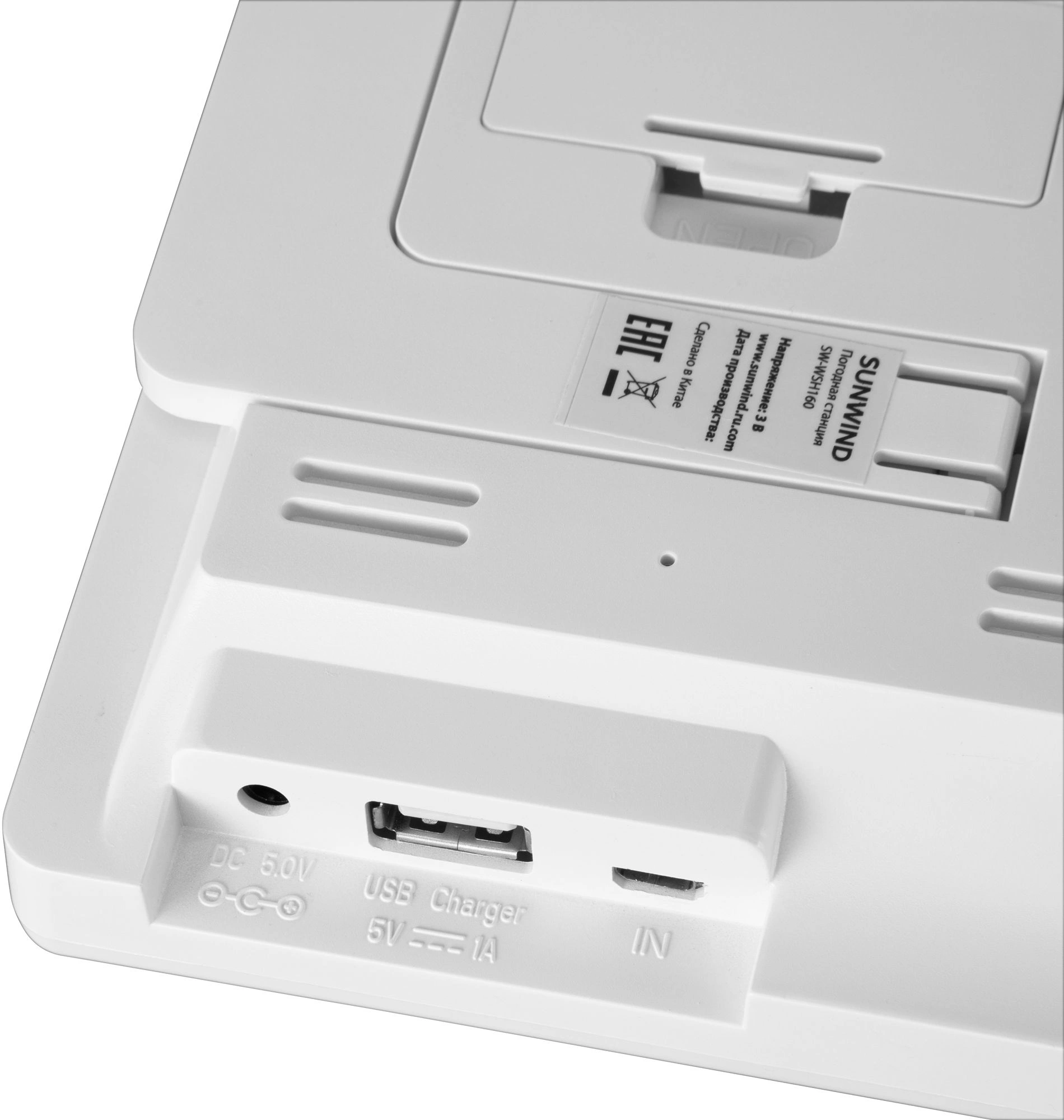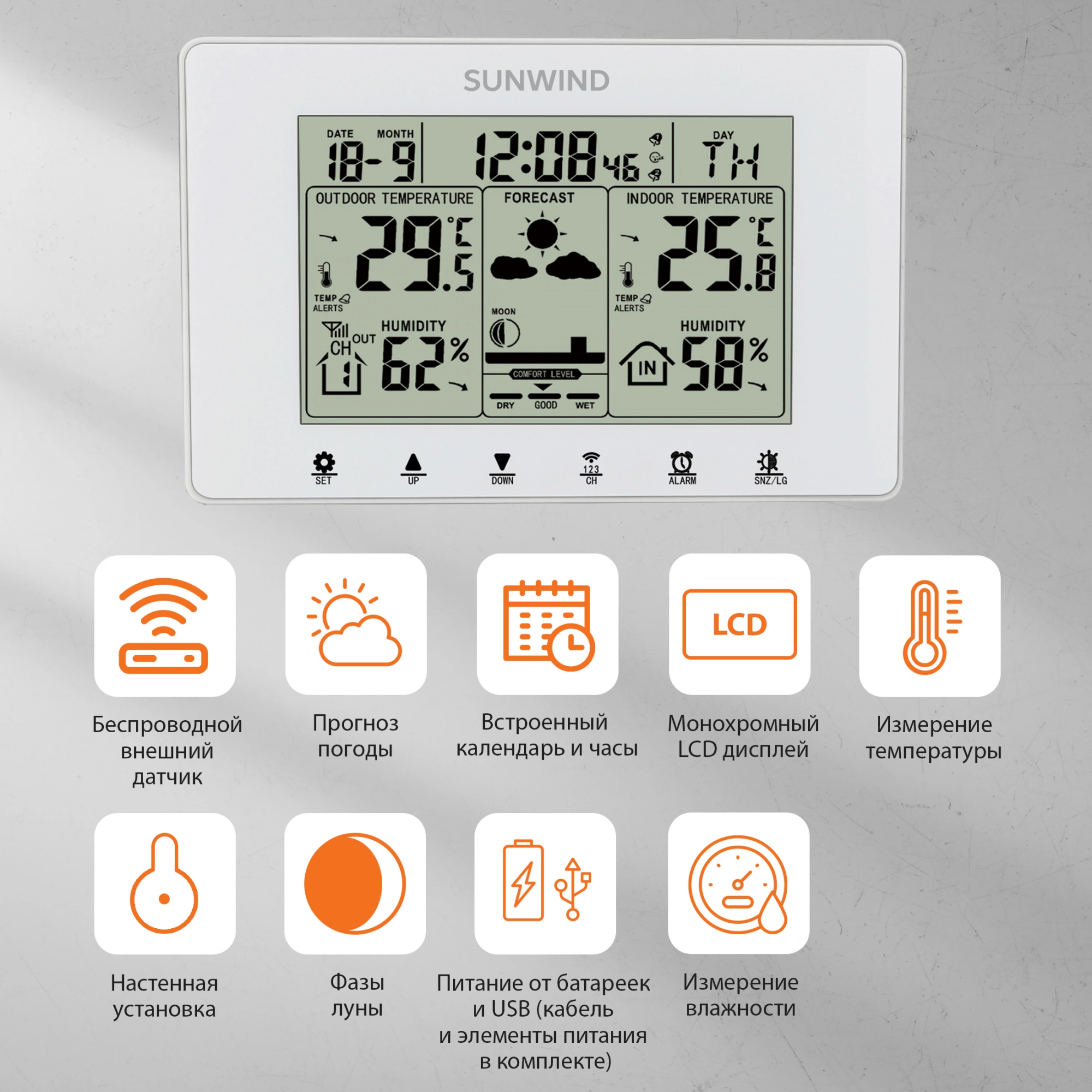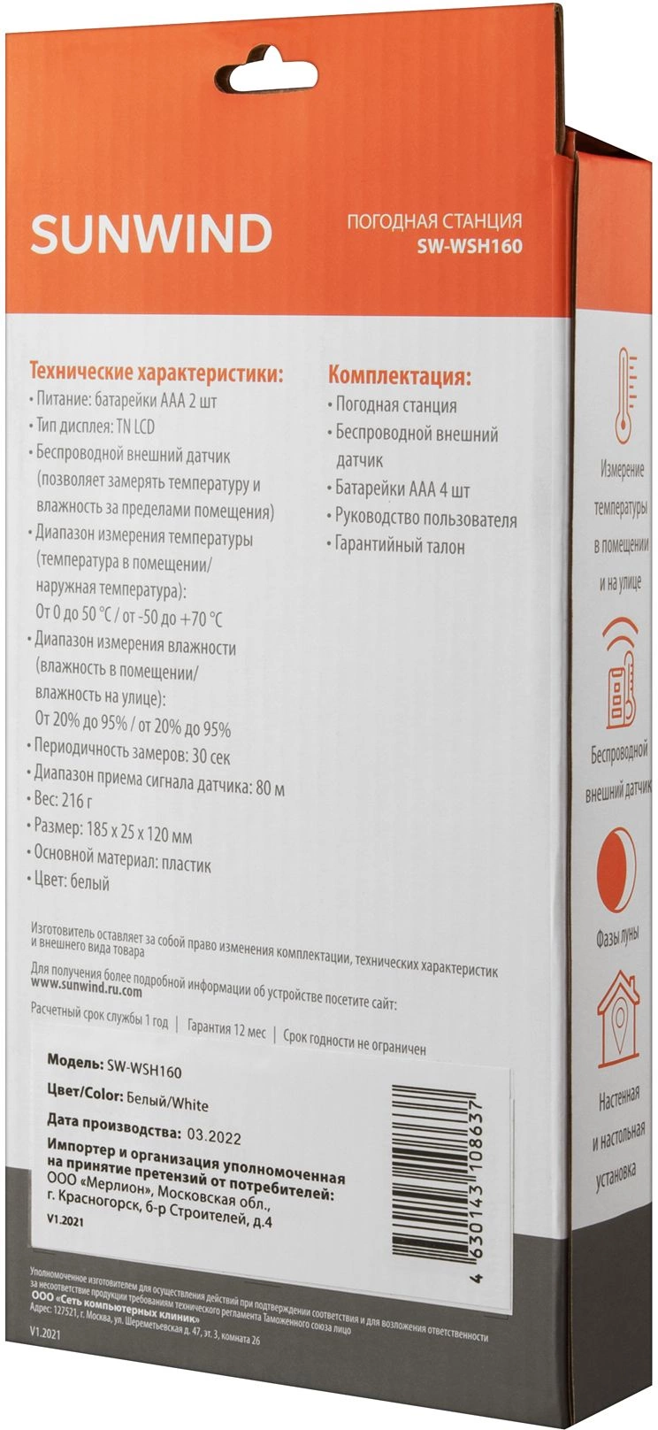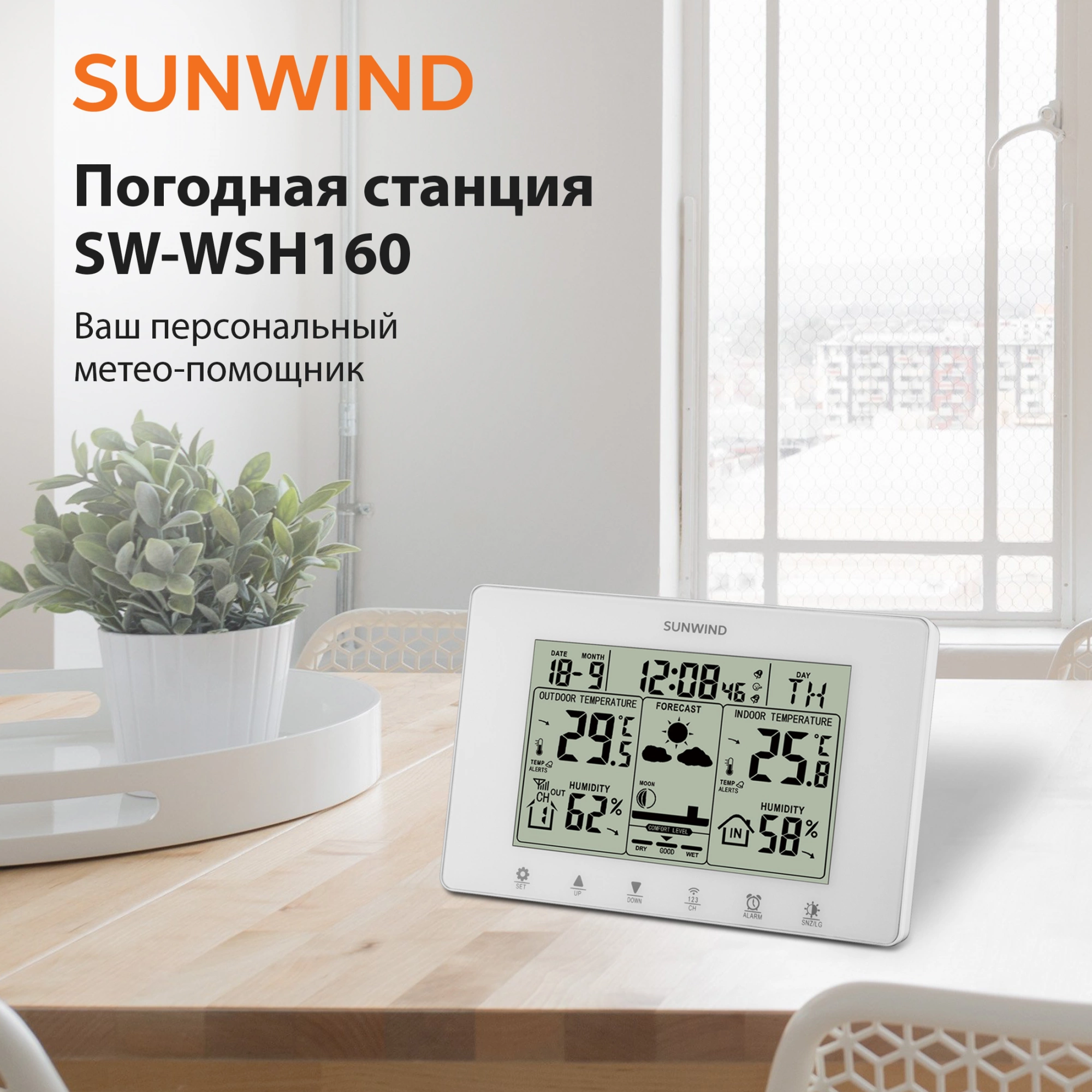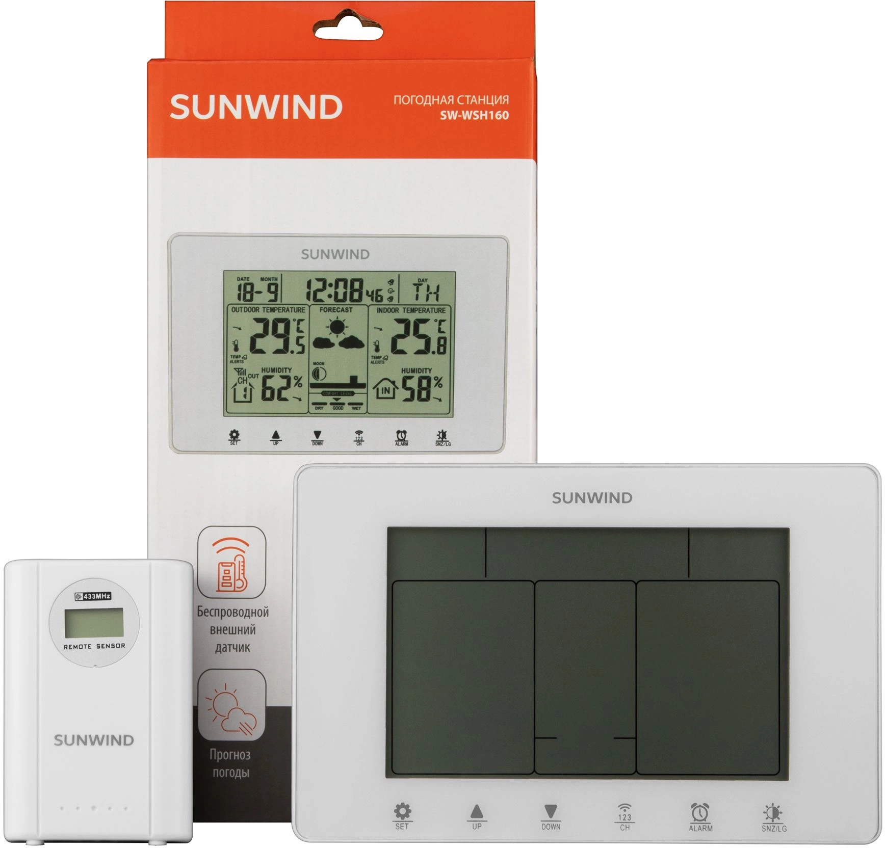 Погодная станция Sunwind SW-WSH160 в белом корпусе с экраном и шестью кнопками предназначена для удобного контроля ключевых показателей окружающей среды. Уличная температура измеряется в диапазоне -20...+70 ?. Влажность воздуха с высокой точностью регистрируется в пределах 20-95 %. Одновременному определению параметров снаружи и внутри помещения способствует дополнительный датчик, который поставляется вместе с компактной метеостанцией, как и четыре батарейки AAA. Хотя для нормальной работы достаточно вдвое меньше источников питания. Возможно сохранение сведений для последующего сопоставления. Функциональность устройства расширена часами, будильником, календарем, а также индикатором фаз Луны.