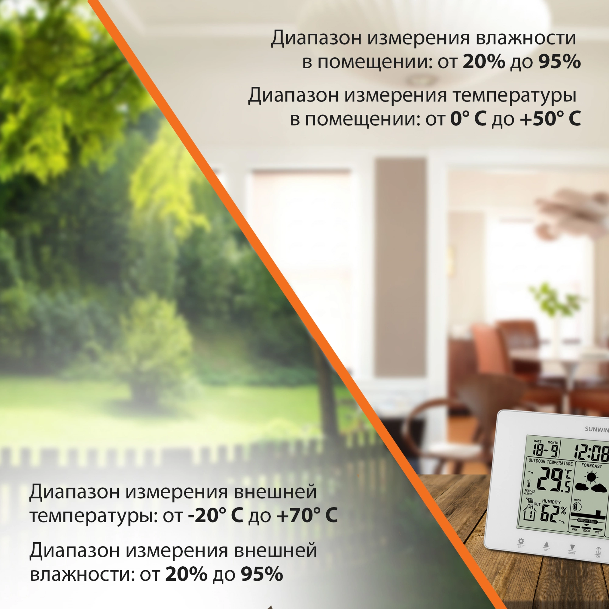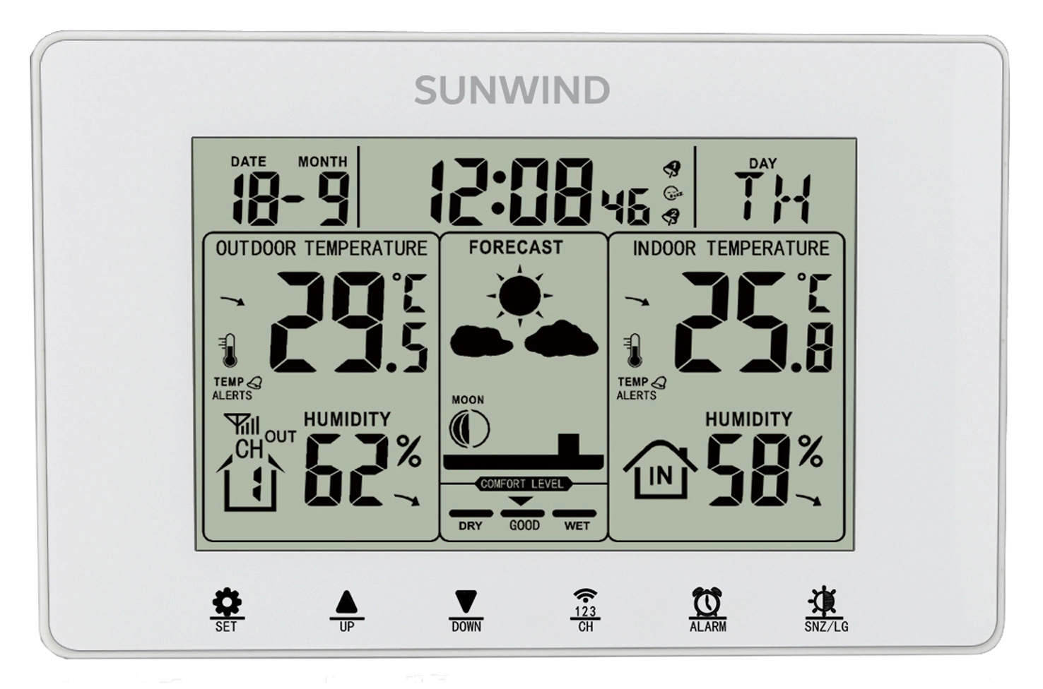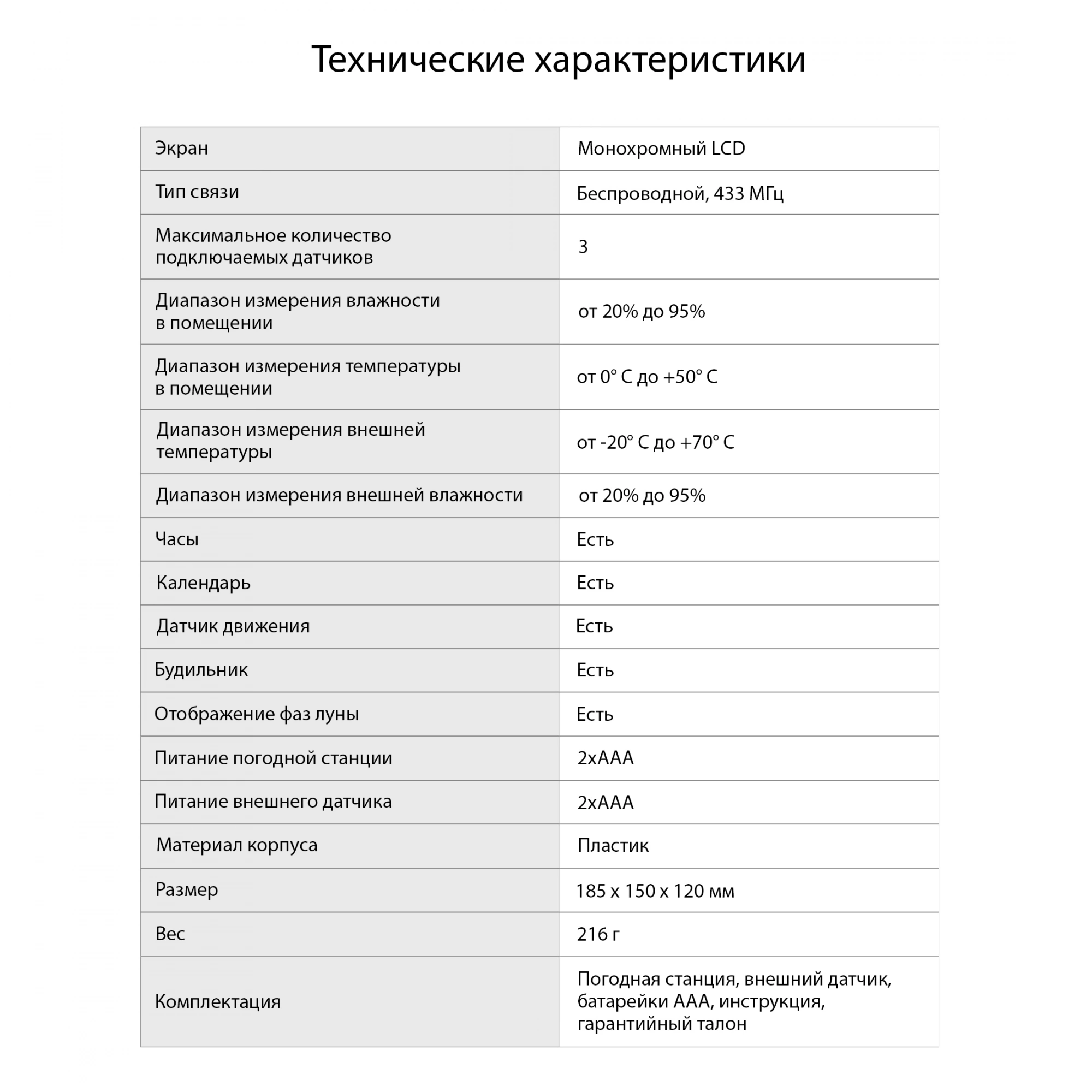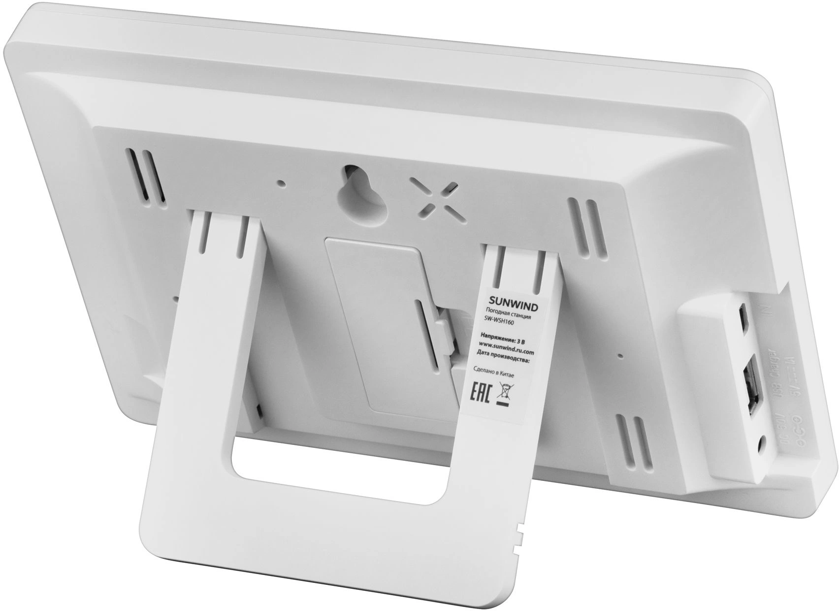Погодная станция Sunwind SW-WSH160 в белом корпусе с экраном и шестью кнопками предназначена для удобного контроля ключевых показателей окружающей среды. Уличная температура измеряется в диапазоне -20...+70 ?. Влажность воздуха с высокой точностью регистрируется в пределах 20-95 %. Одновременному определению параметров снаружи и внутри помещения способствует дополнительный датчик, который поставляется вместе с компактной метеостанцией, как и четыре батарейки AAA. Хотя для нормальной работы достаточно вдвое меньше источников питания. Возможно сохранение сведений для последующего сопоставления. Функциональность устройства расширена часами, будильником, календарем, а также индикатором фаз Луны.