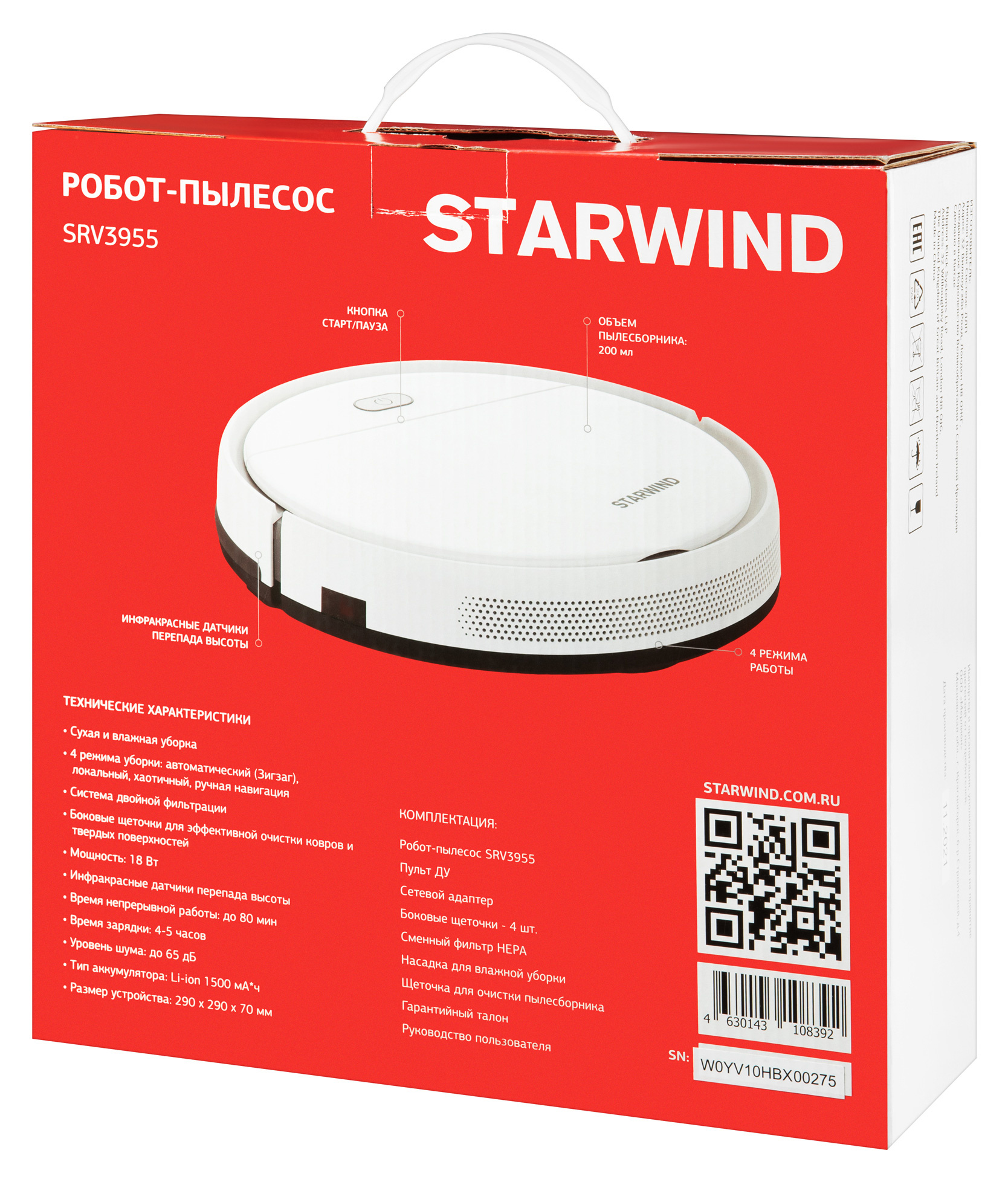 Робот-пылесос Starwind SRV3955 значительно упрощает ведение домашнего хозяйства. Бытовая техника позволит заняться иными задачами, а уборку напольного покрытия полностью возьмет на себя. Устройство имеет высокое качество, выполнено в стильном белом цвете. Мощность современного робота-пылесоса составляет порядка 18 Ватт, аналогичный показатель у всасывания. С помощью устройства можно организовать как сухую, так и влажную уборку. Контейнер для пыли имеет объем 200 мл. Питание организовано от литийионного аккумулятора емкостью 1500 мАч. В конструкции предусмотрен фильтр тонкой очистки.