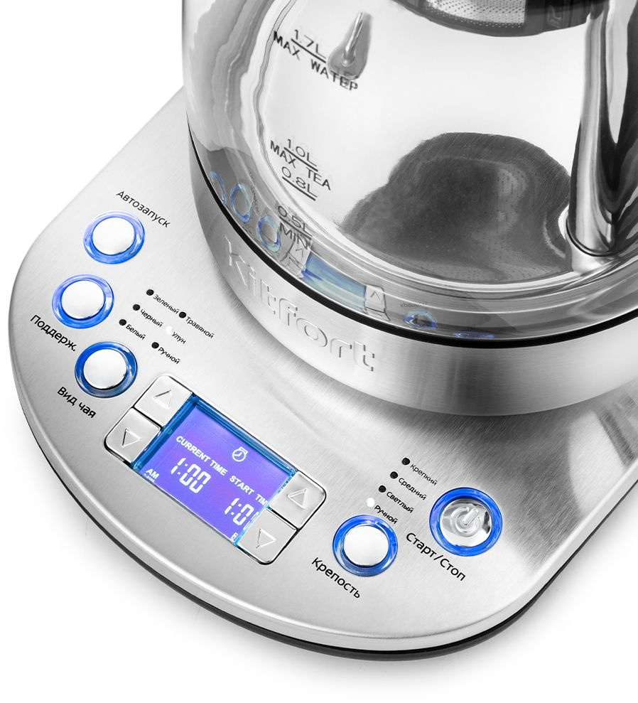 Электрический чайник с терморегулятором Kitfort КТ-6116 может не только вскипятить воду, но и нагреть её до температур: 40, 70, 80, 85, 90 и 95°С, что очень удобно при заваривании различных сортов чая, кофе и при приготовлении детского питания.