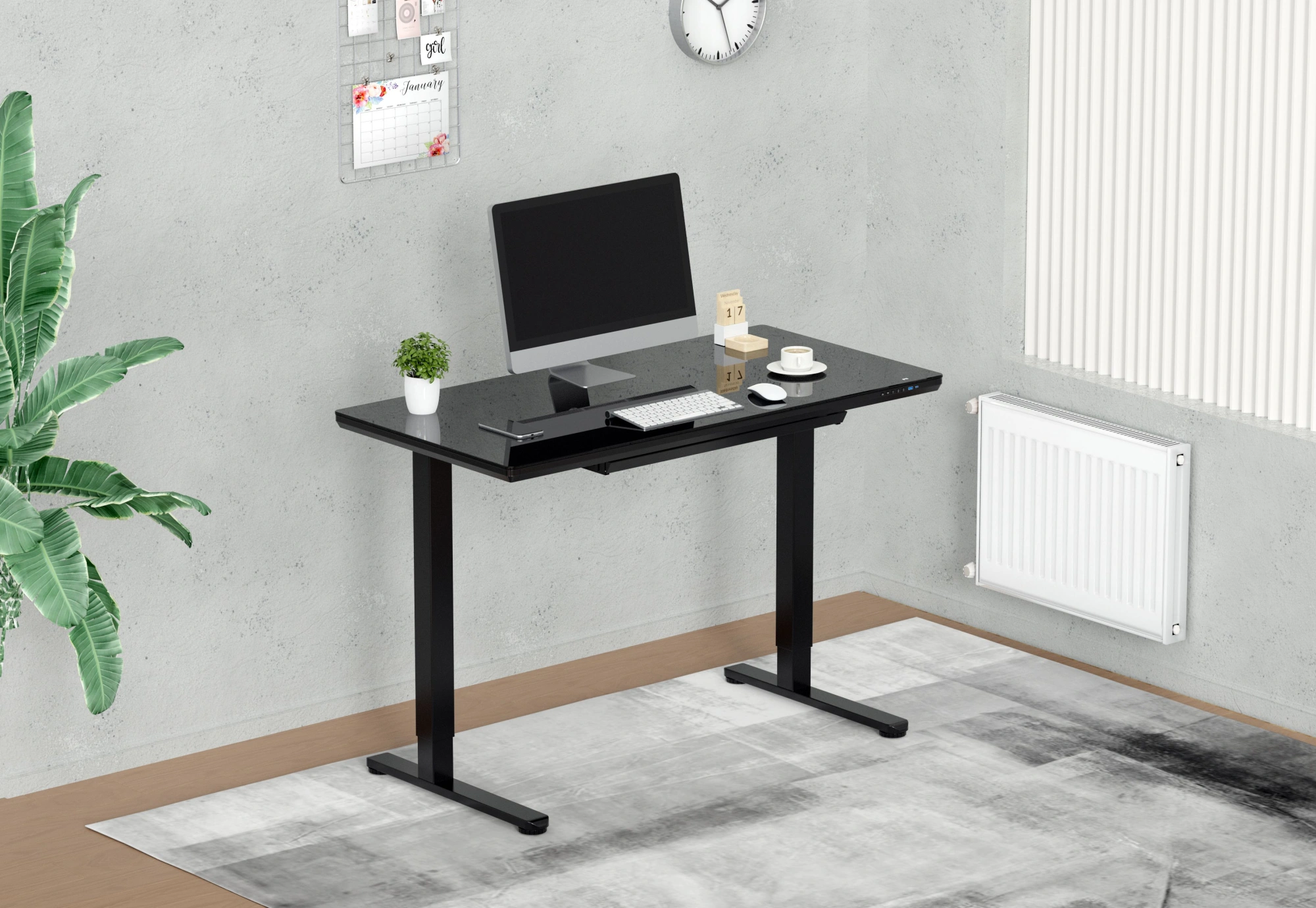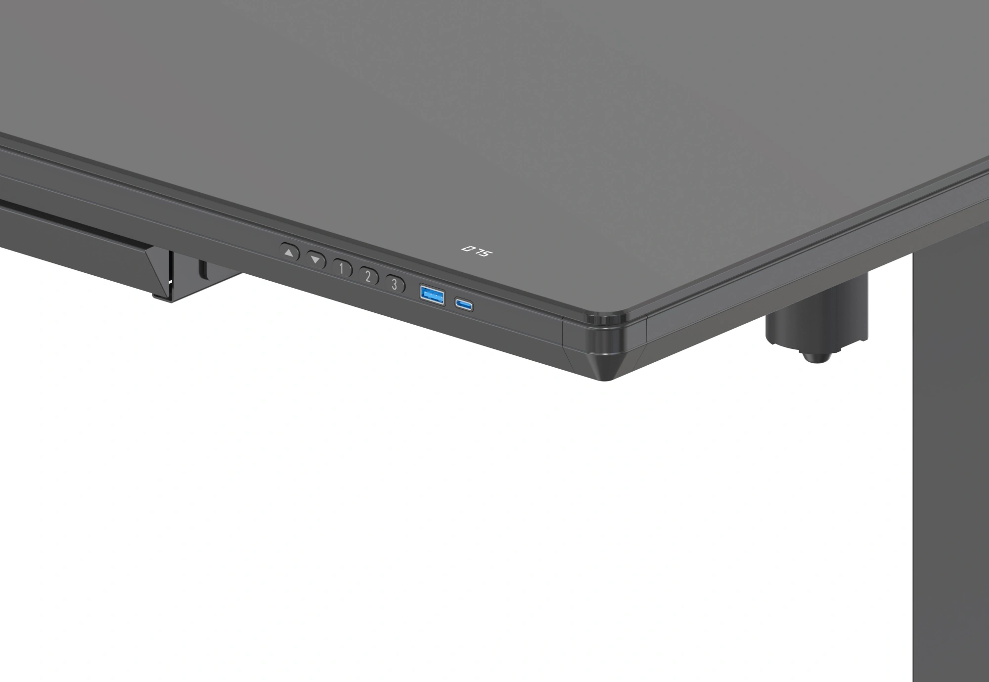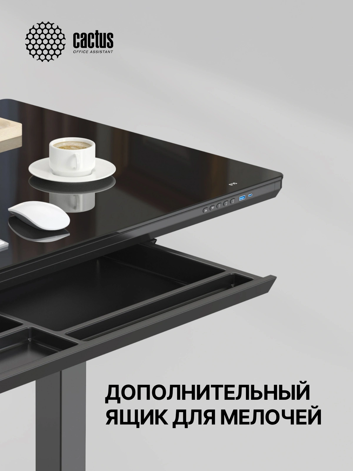 Стол с подъемным механизмом, легким управлением и просторной столешницей из черного стекла