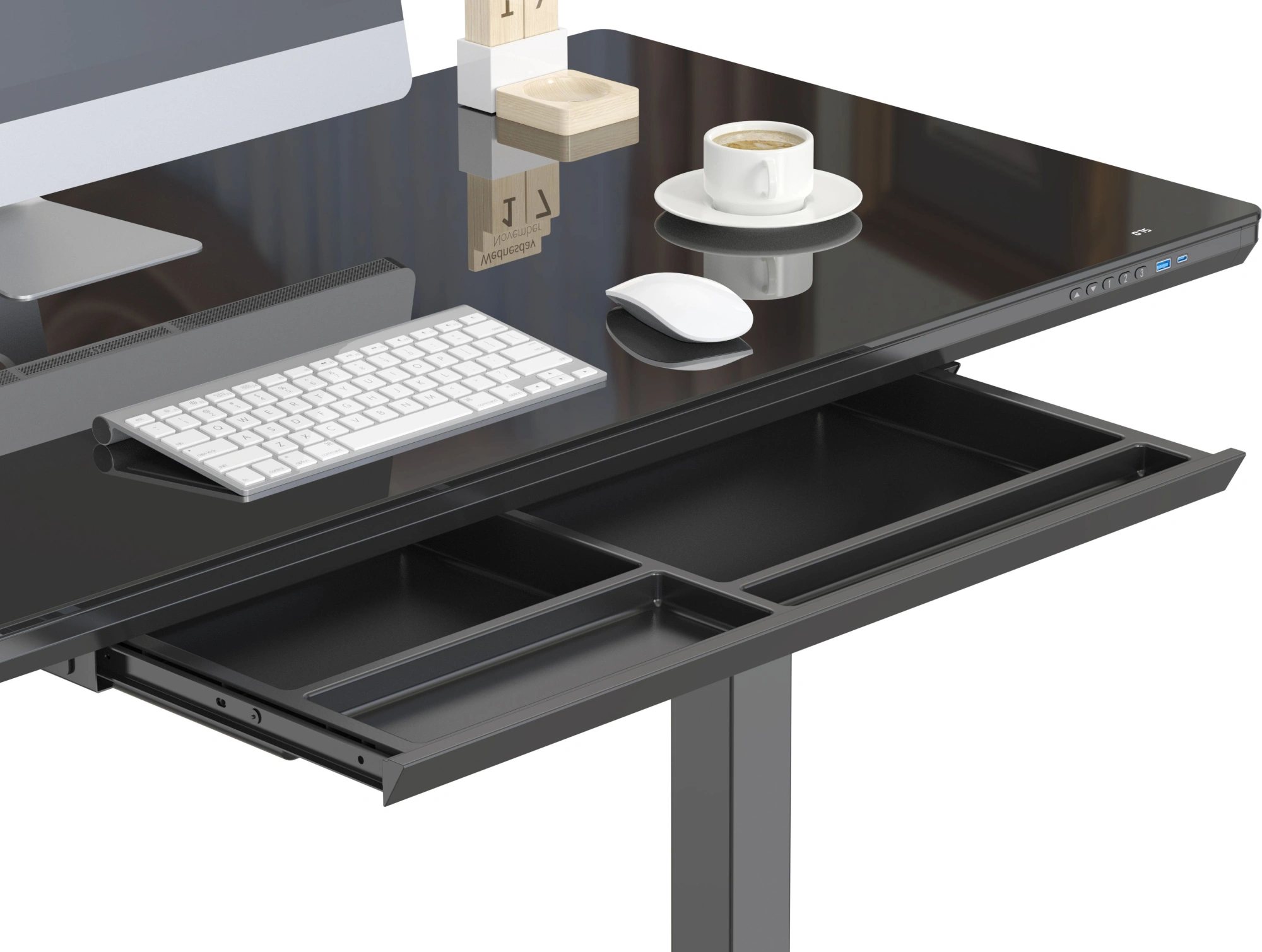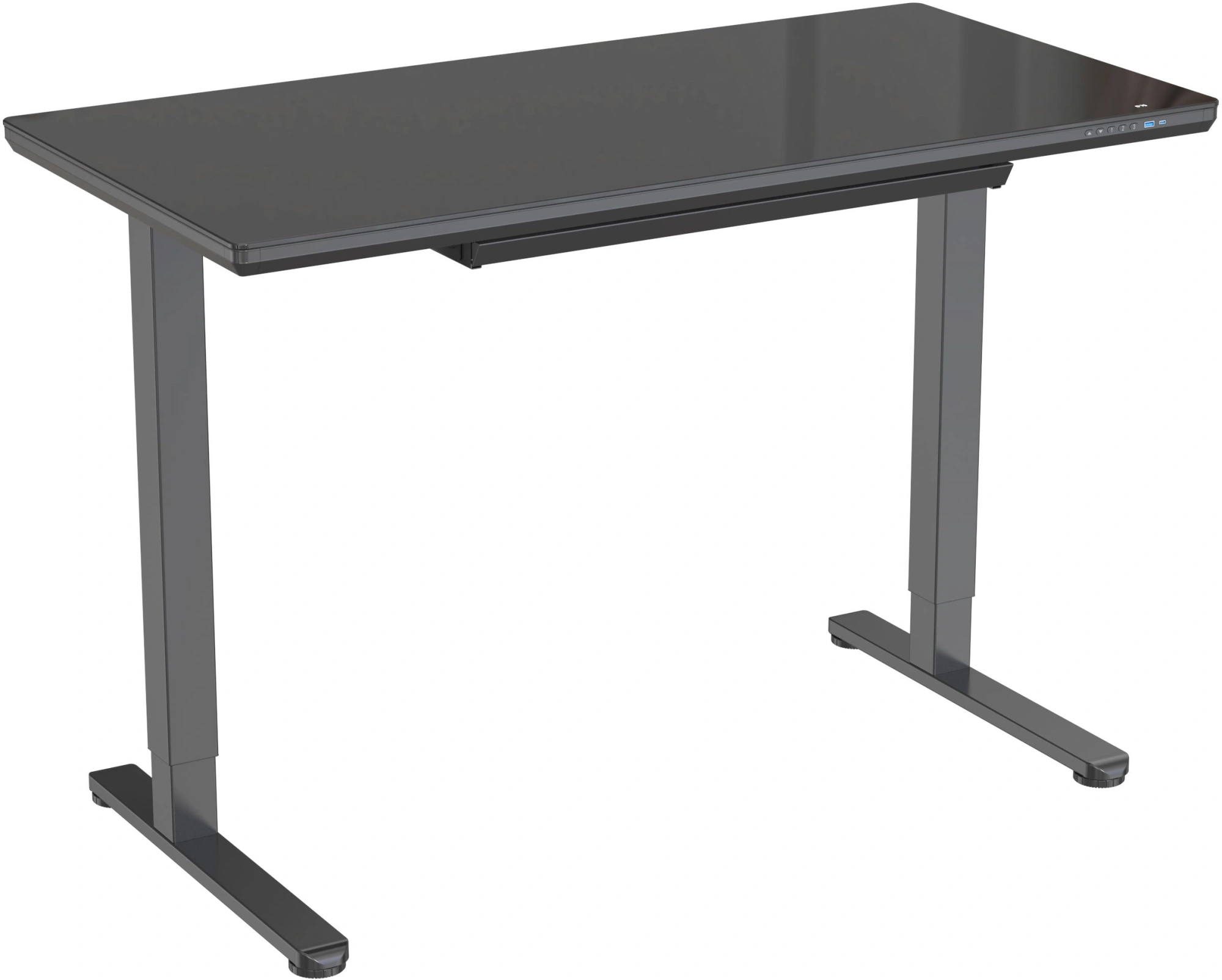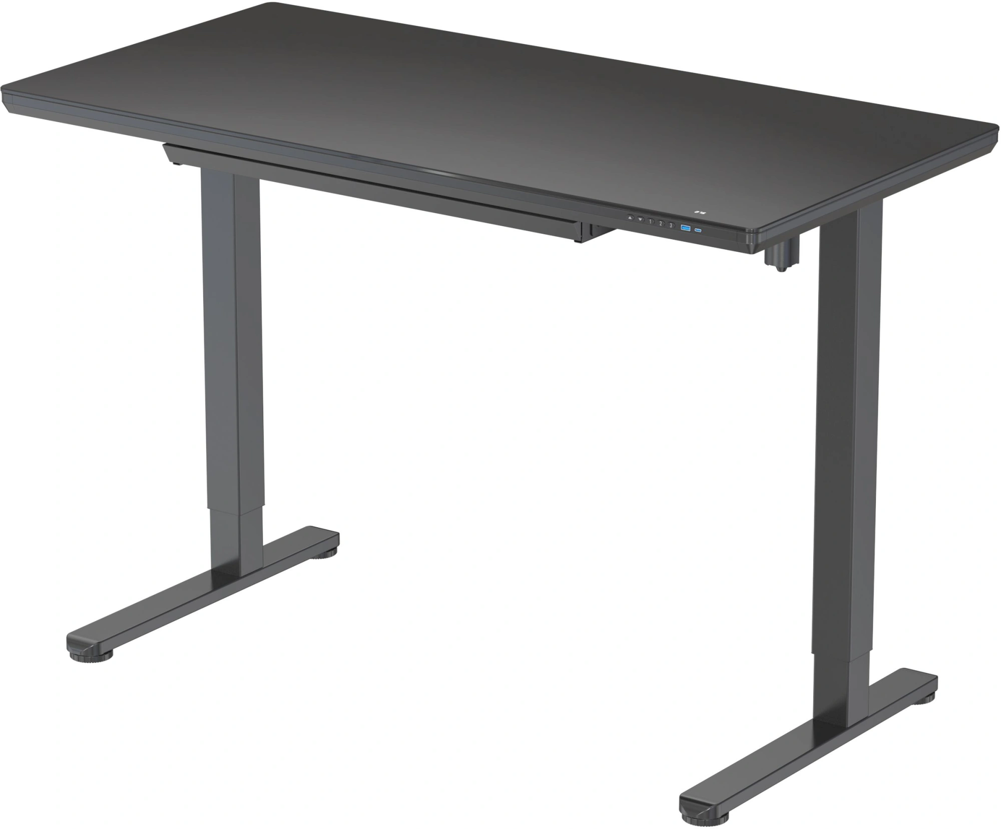 Стол с подъемным механизмом, легким управлением и просторной столешницей из черного стекла