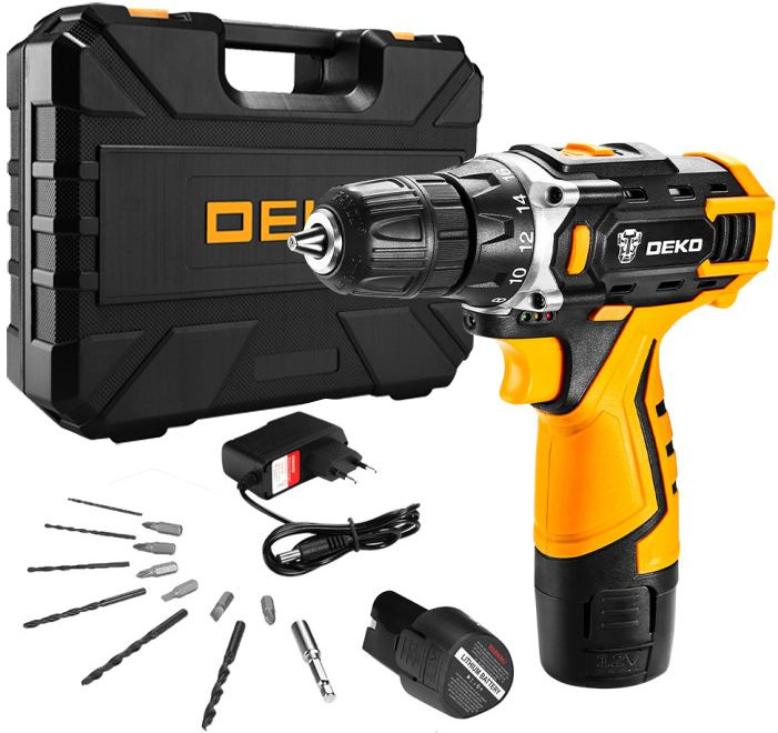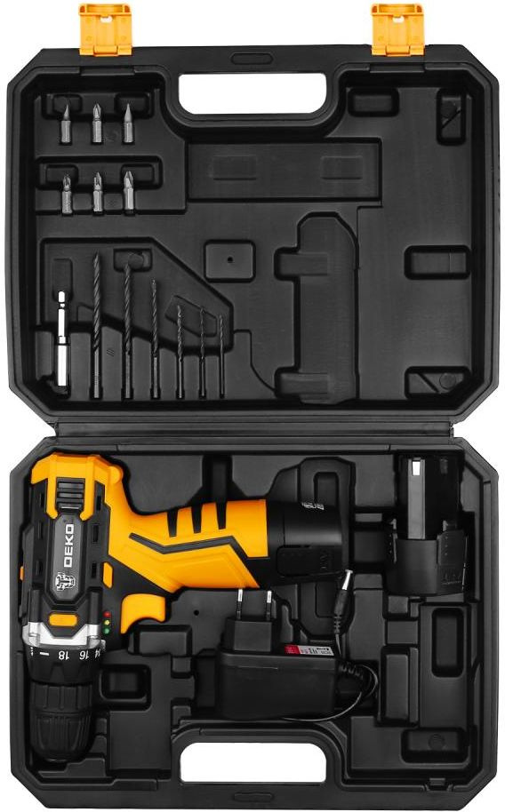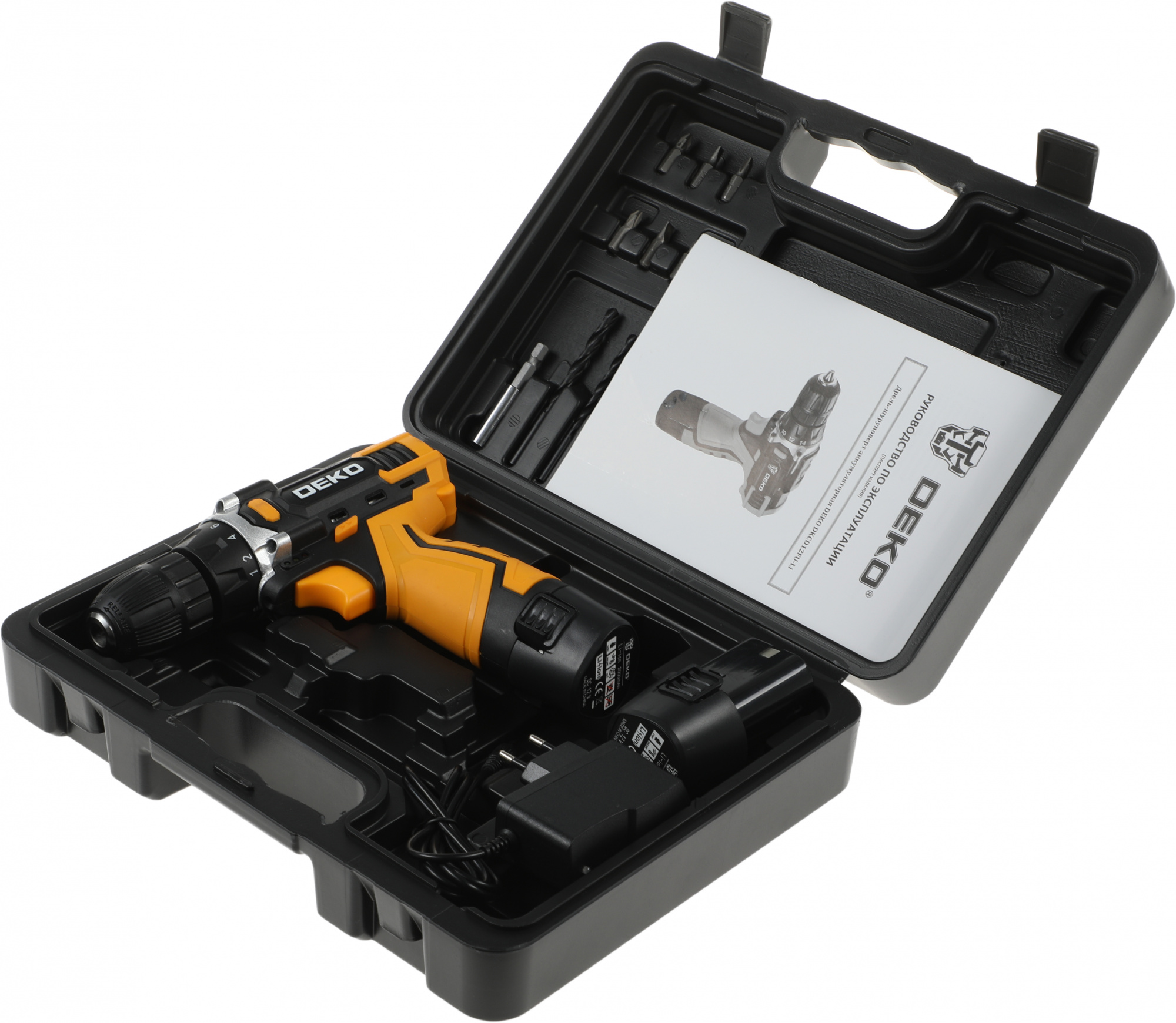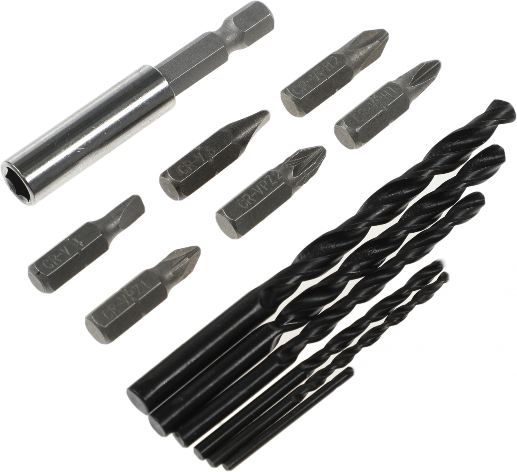 Дрель аккумуляторная, АКБ, зарядное устройство, свёрла: 2; 2,5; 3; 4; 5; 6 мм, биты: SL4,6, PH1,2, PZ1,2 - 6 шт., магнитный держатель бит - 60 мм.