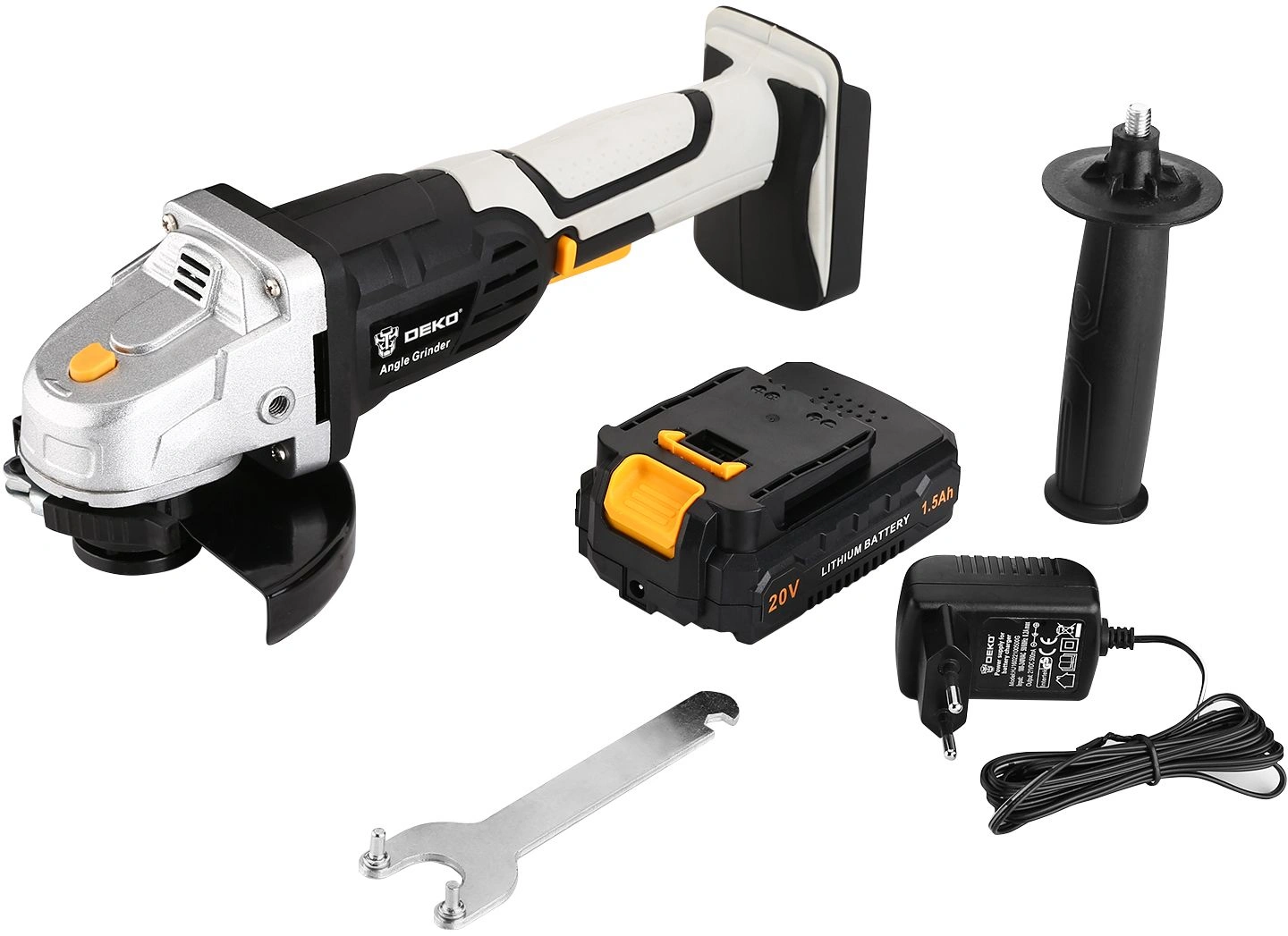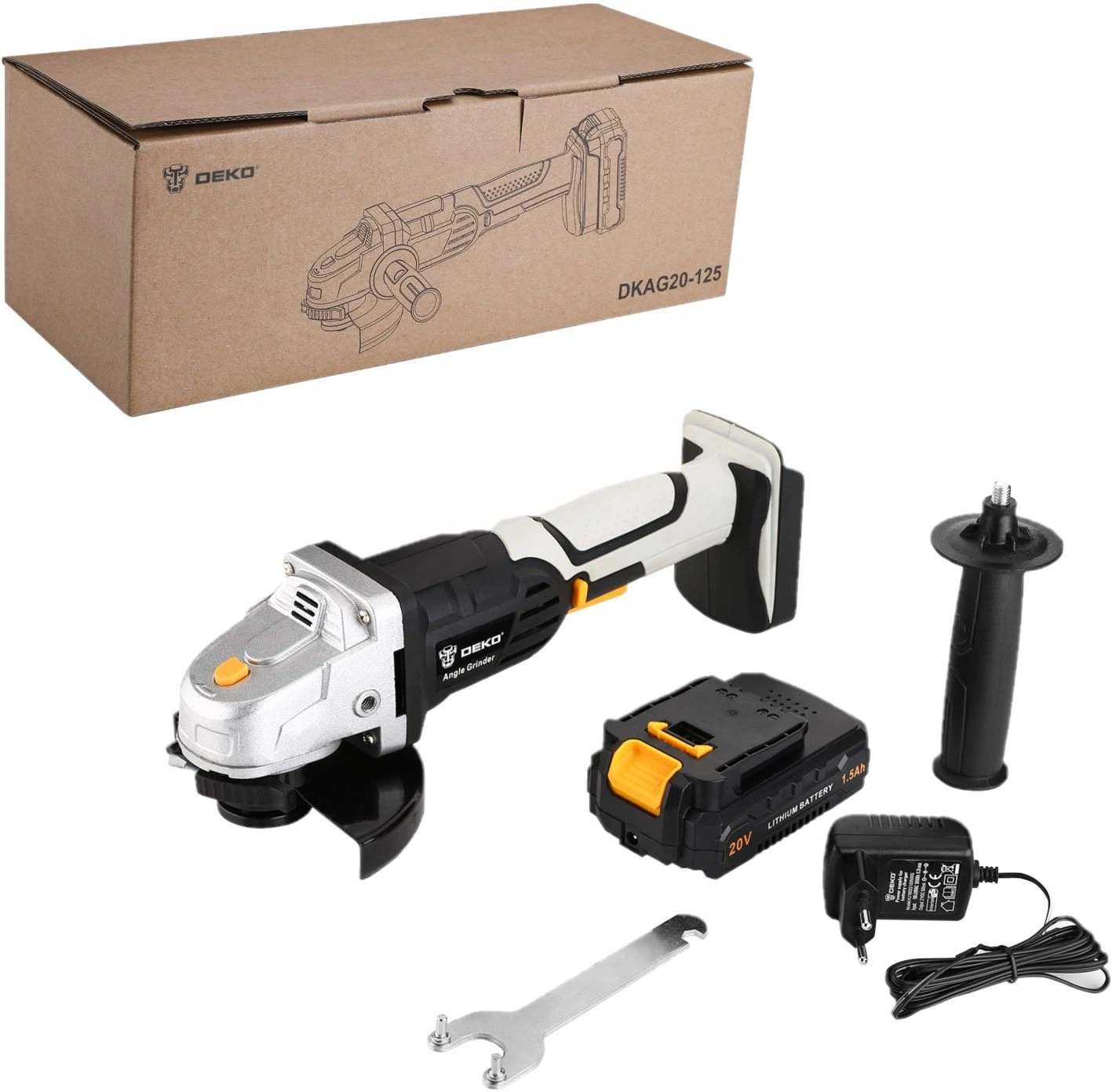 Углошлифовальная машина, вспомогательная ручка, гаечный ключ, батарея, зарядное устройство, руководство по эксплуатации.