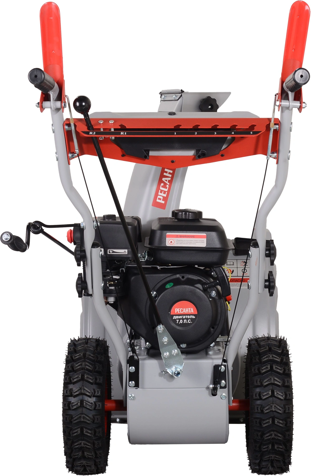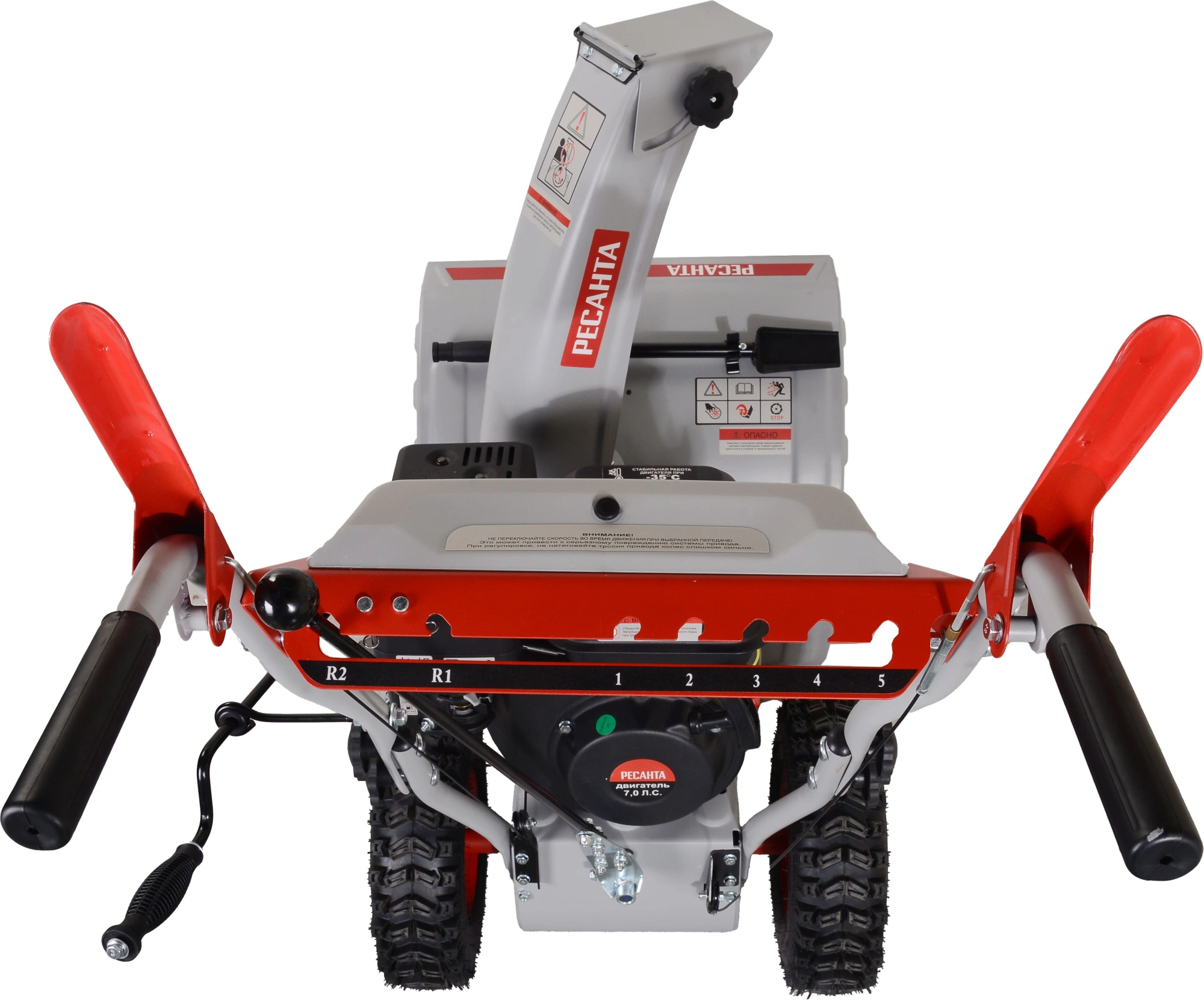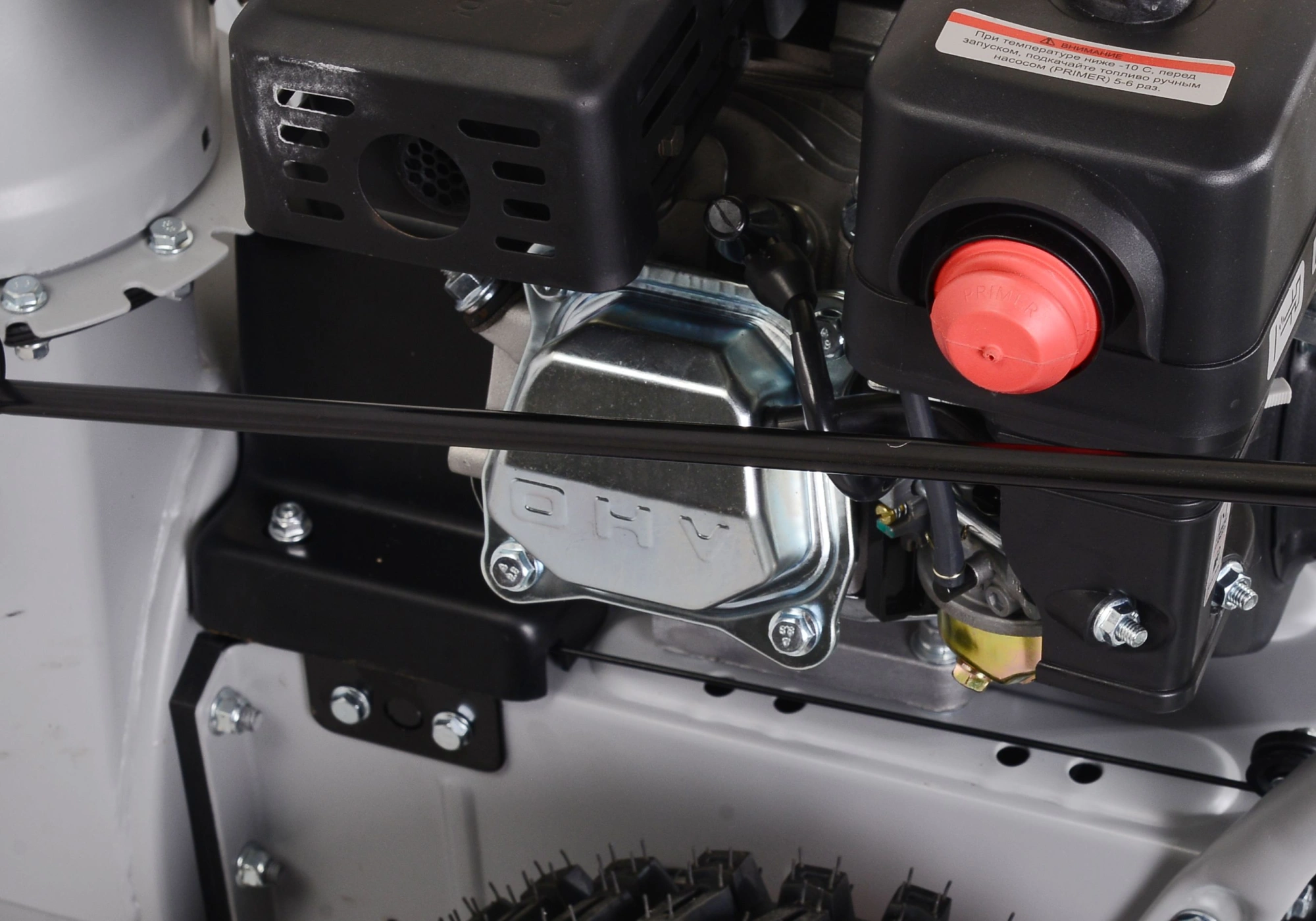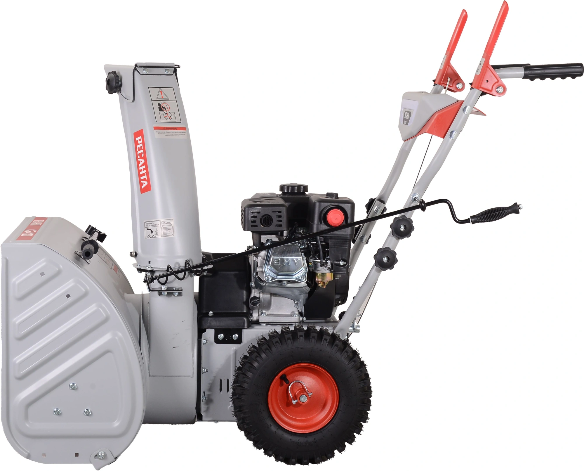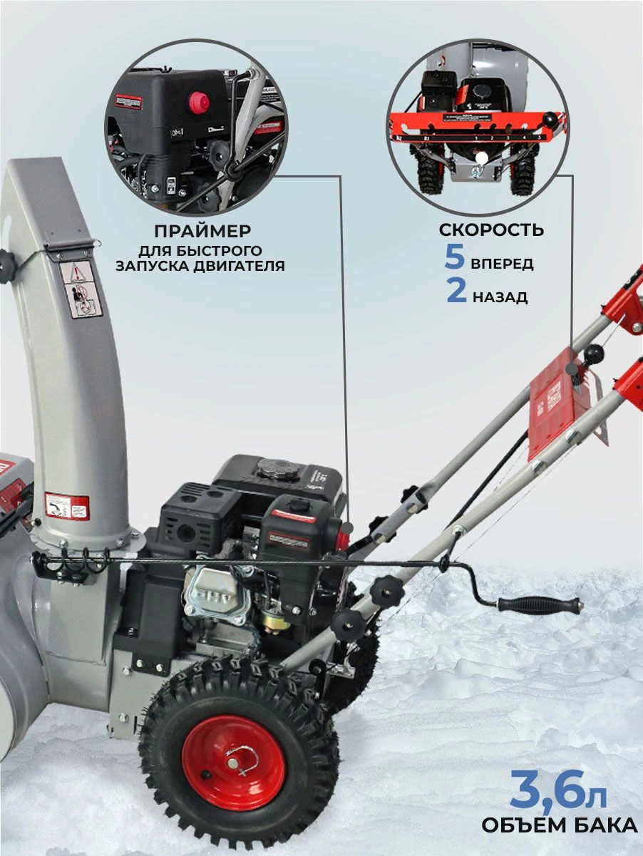 Снегоуборщик в сборе с двигателем, рычаг поворота желоба, ограничительные башмаки - 2 шт., рукоятка управления с панелью в разборе, крепежный комплект, паспорт.