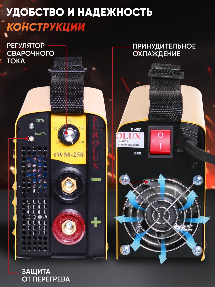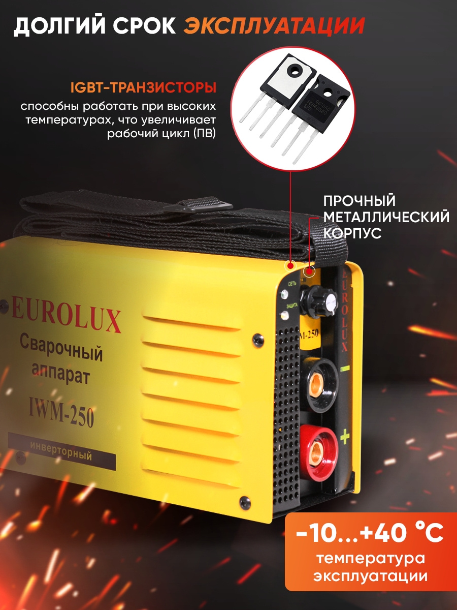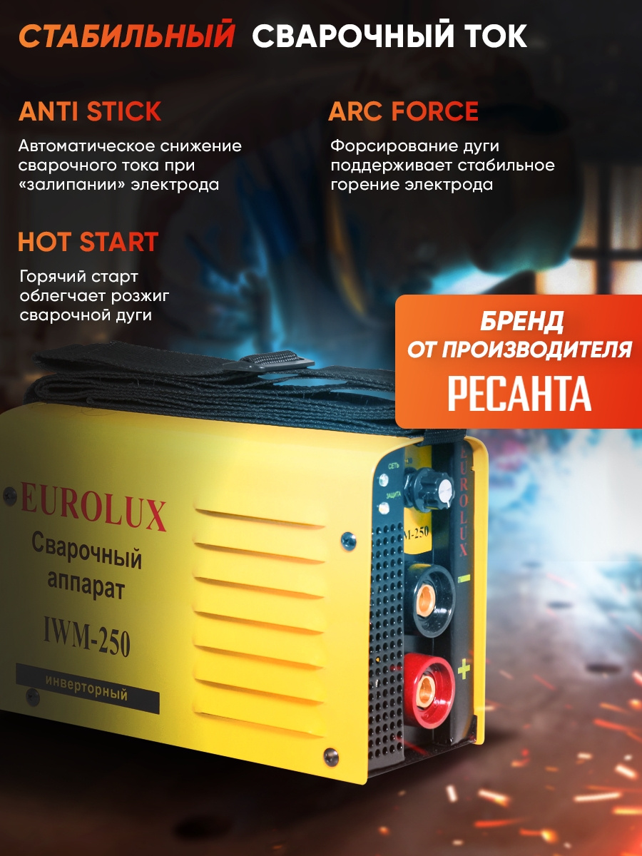 Инверторный сварочный аппарат Eurolux IWM250 - это простой и удобный в эксплуатации агрегат, который служит для соединения различных металлических заготовок методом ручной дуговой сварки. Инвертор этой модели характеризуется высоким качеством изготовления, легкостью в управлении.