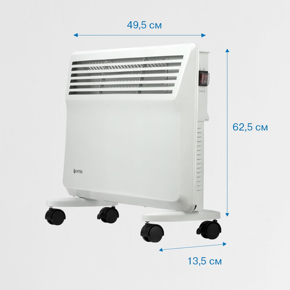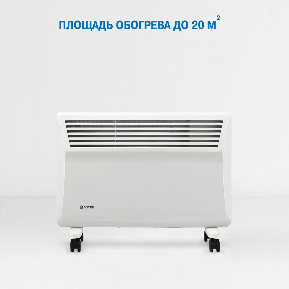 Нагреть воздух в небольшом офисе или комнате площадью 20 м² способен конвектор VITEK VT-2176. При необходимости вы можете разместить устройство в любом месте: благодаря колесикам, прибор легко передвигается по помещению. Мощность устройства можно регулировать по желанию (максимальная — 1600 Вт). Нагревание помещения происходит очень быстро, ведь конвектор оборудован нагревательным элементом из алюминия, который отличается высокой теплоотдачей. Удобно и то, что при опрокидывании прибор отключается автоматически