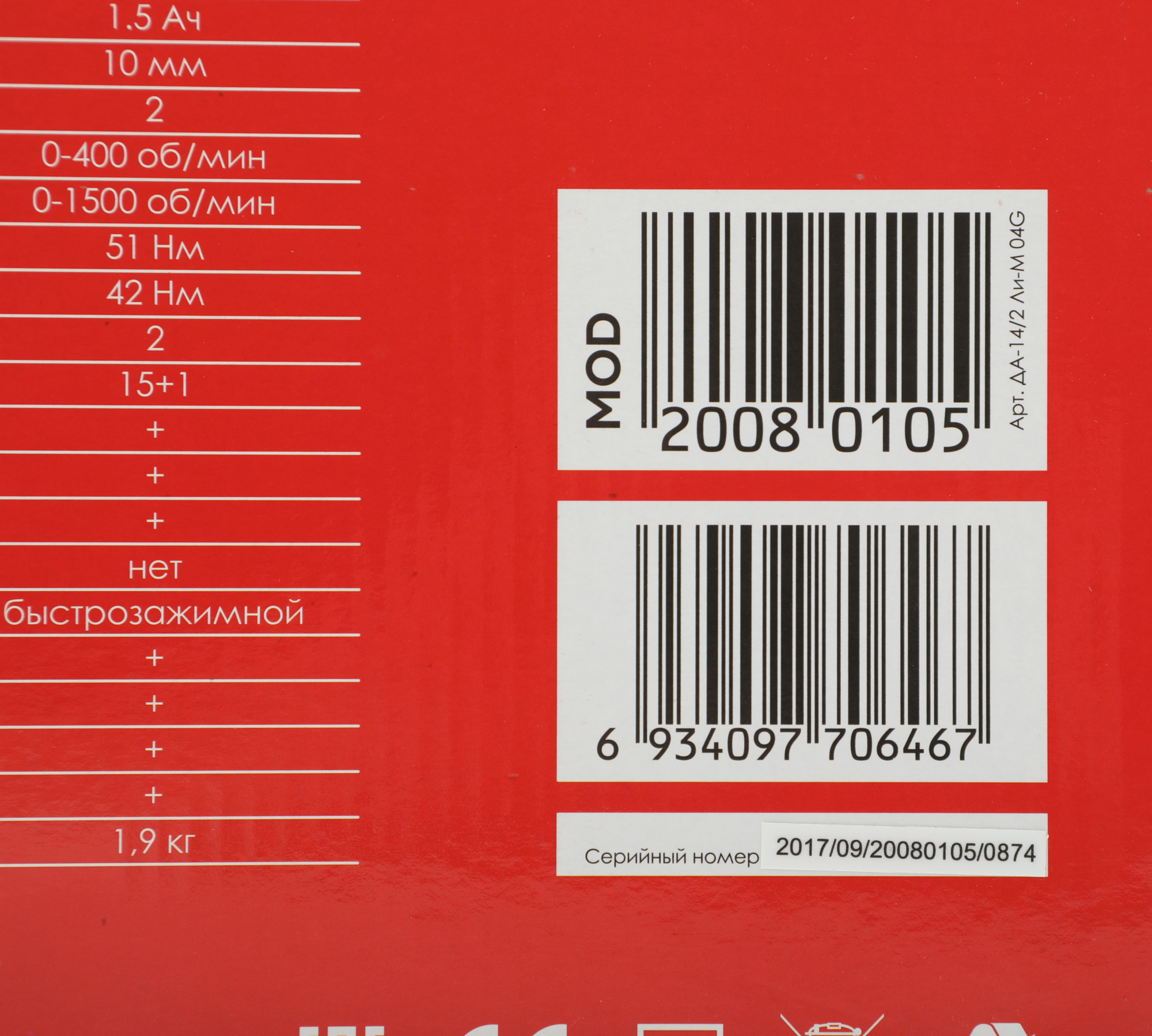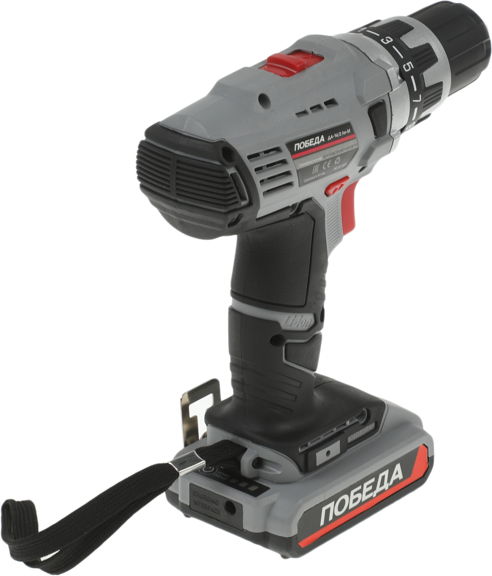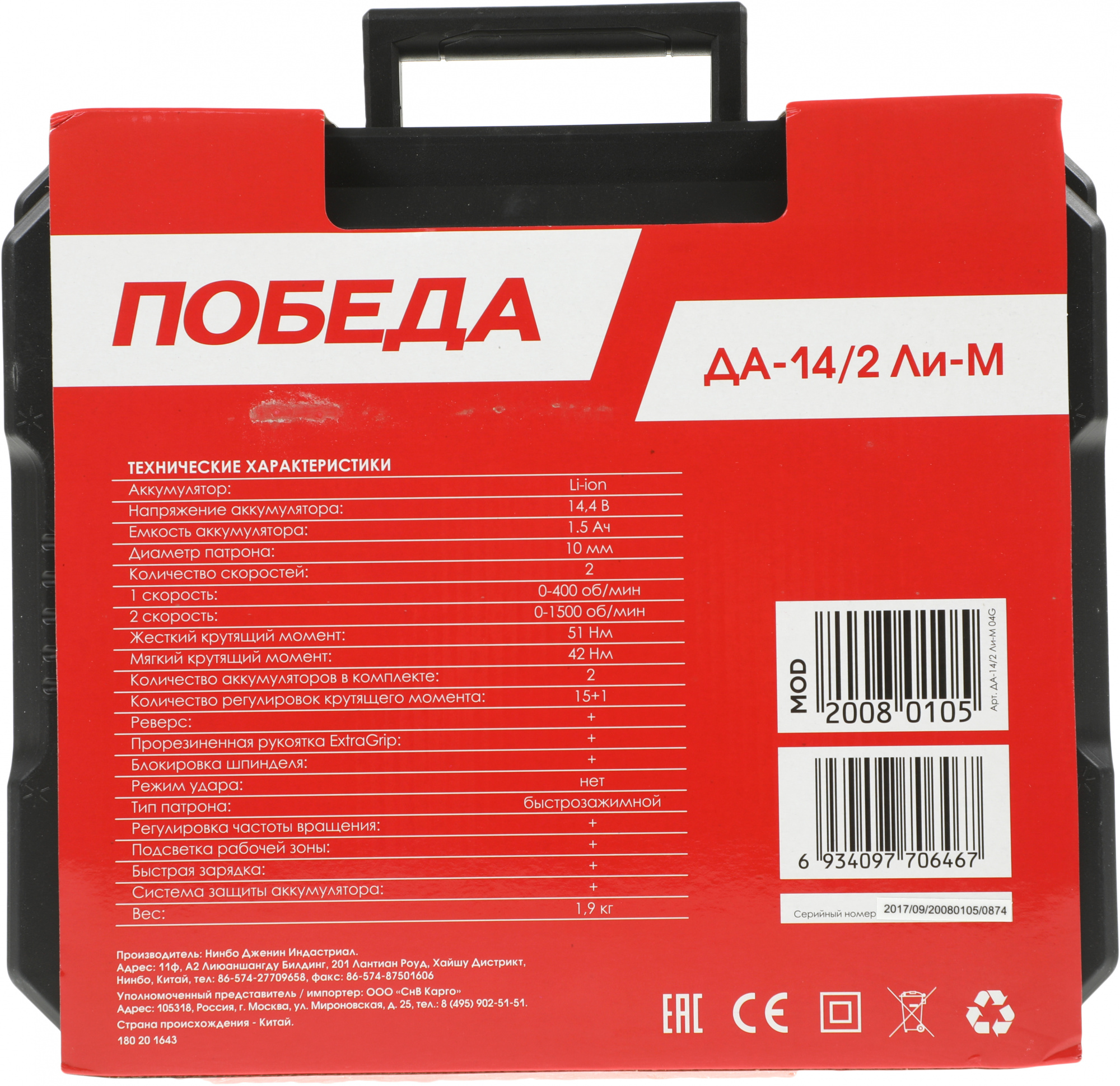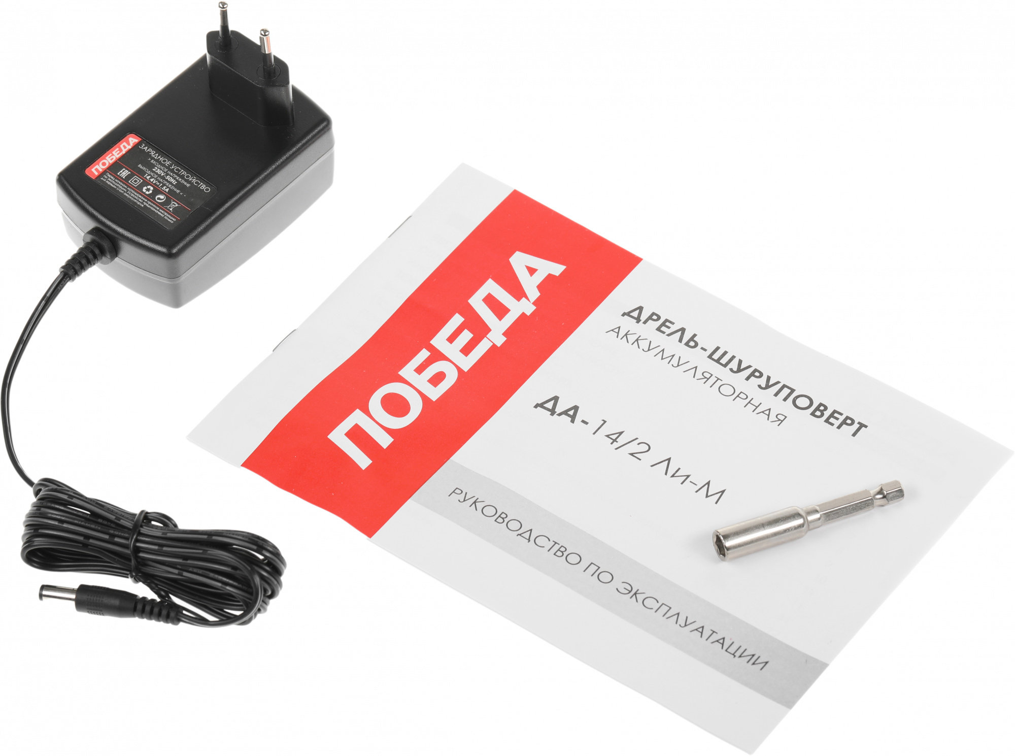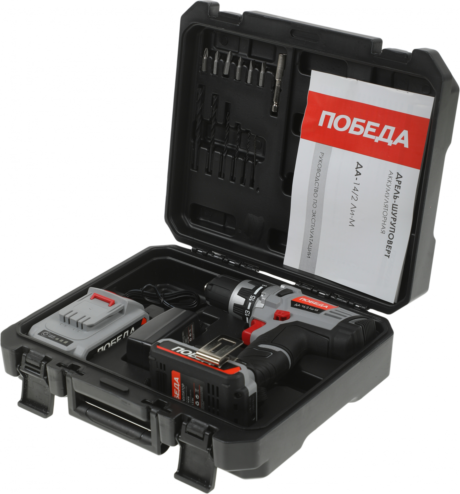 Дрель-шуруповерт, аккумулятор - 2 шт., зарядное устройство, набор сверл (1,5 / 2,5 / 3 / 4 / 5 / 6 мм.) - 6 шт., набор бит (PH1 / PH2 / PZ1 / PZ2 / PZ5 / PZ6) - 6 шт., инструкция, гарантийный талон, кейс.