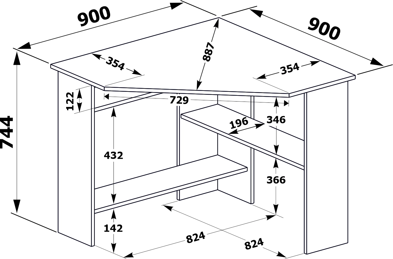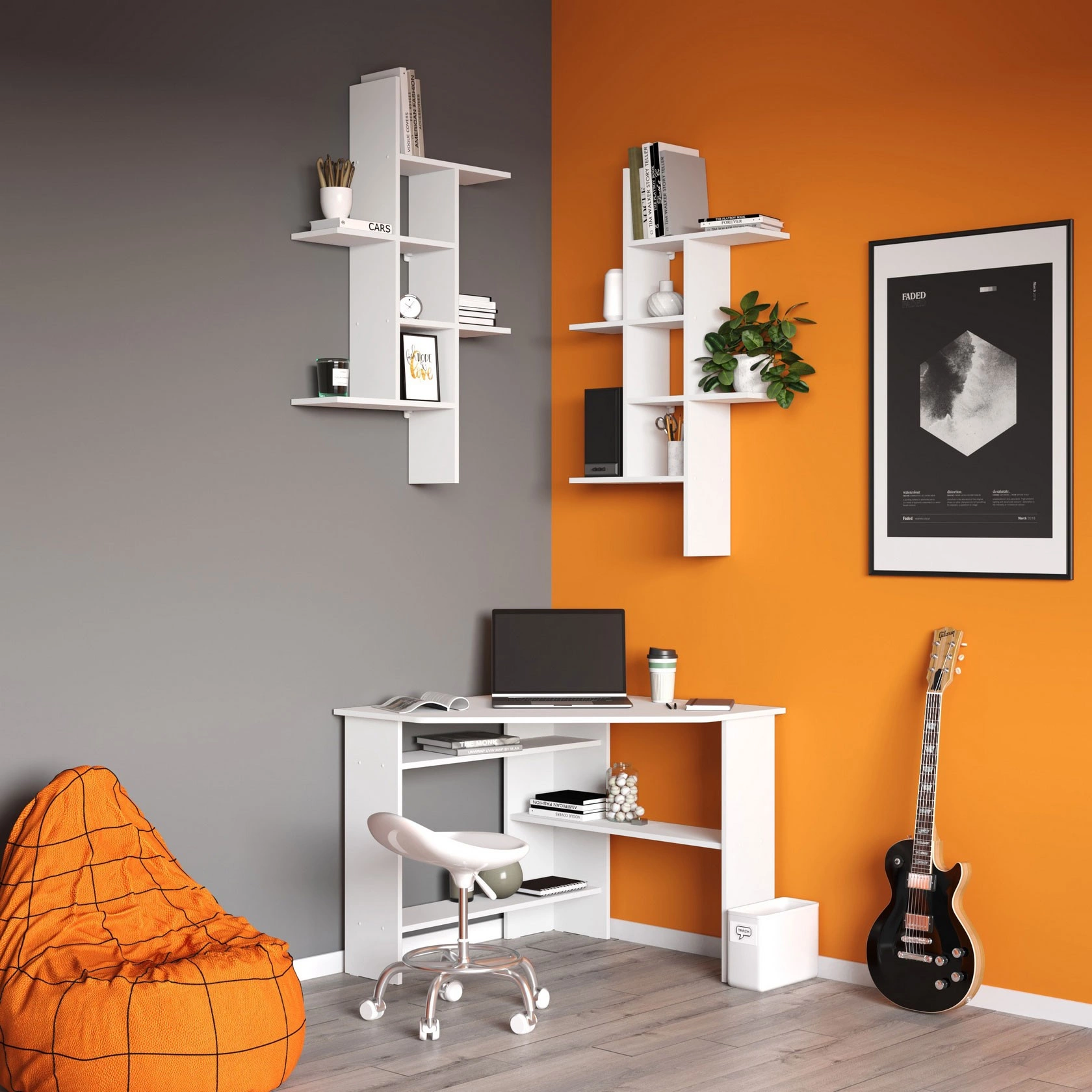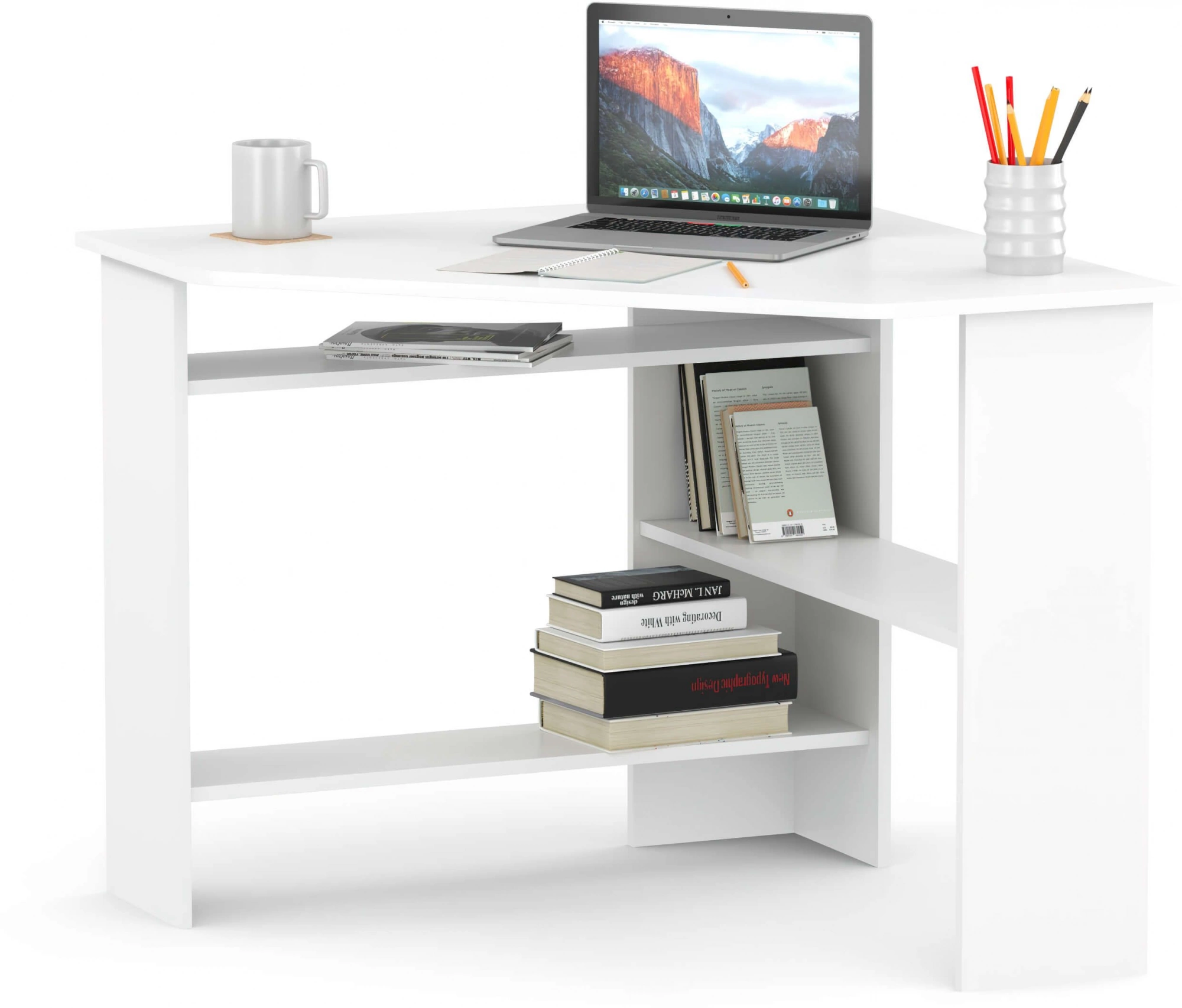 Функциональный вариант обустройства полноценной рабочей или учебной зоны. Просторная столешница разместит монитор или ноутбук, а также всё то, что необходимо держать под рукой для быстрого доступа. Несколько разноплановых полок станут удобной системой хранения книг, бумаг и прочей канцелярии.