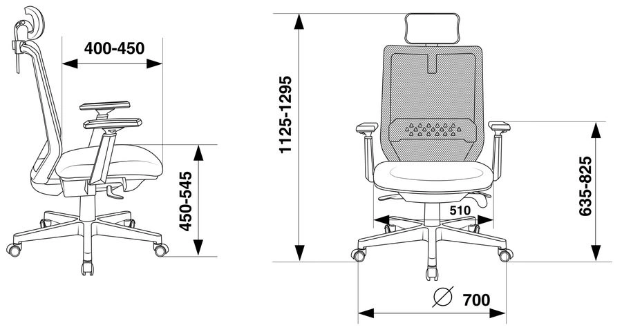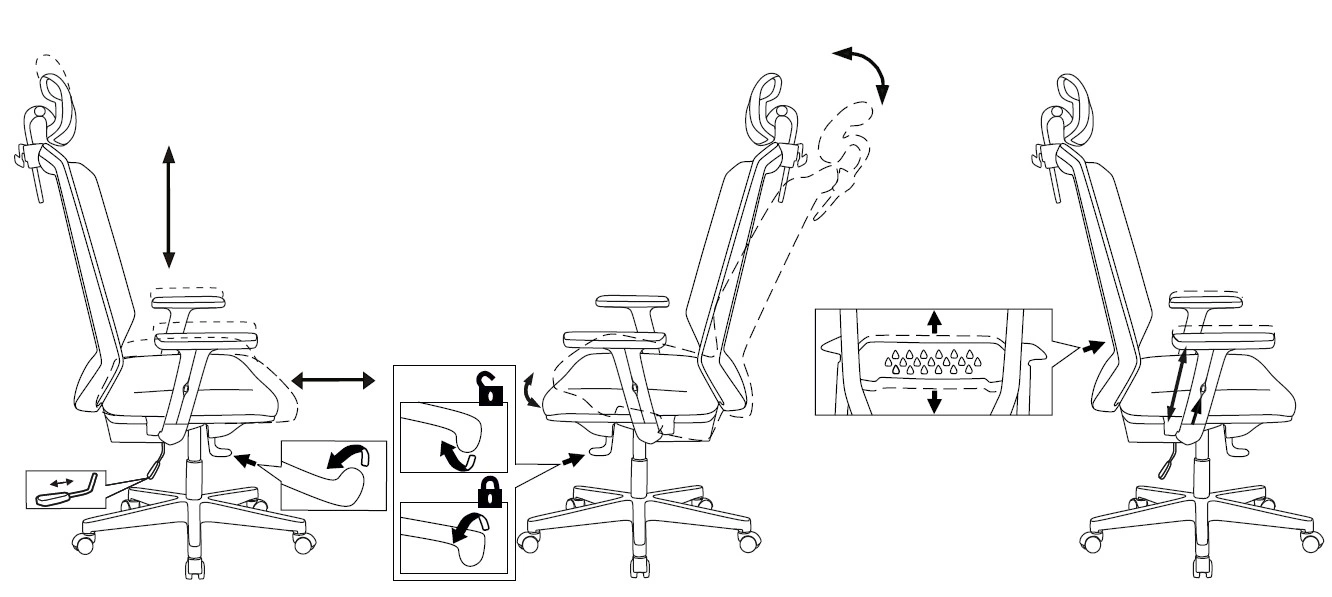 высоты (газлифт), высоты подголовника, положения подлокотников, поясничной области, угла наклона подголовника