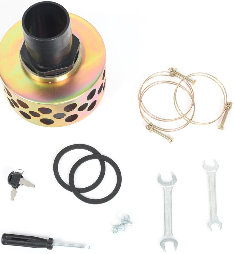 Мотопомпа в сборе, уплотнительная шайба (2 шт.), соединительные патрубки (2 шт.), зажимные кольца (2 шт.), хомуты (3 шт.), заборный фильтр, инструкция с гарантийным талоном.