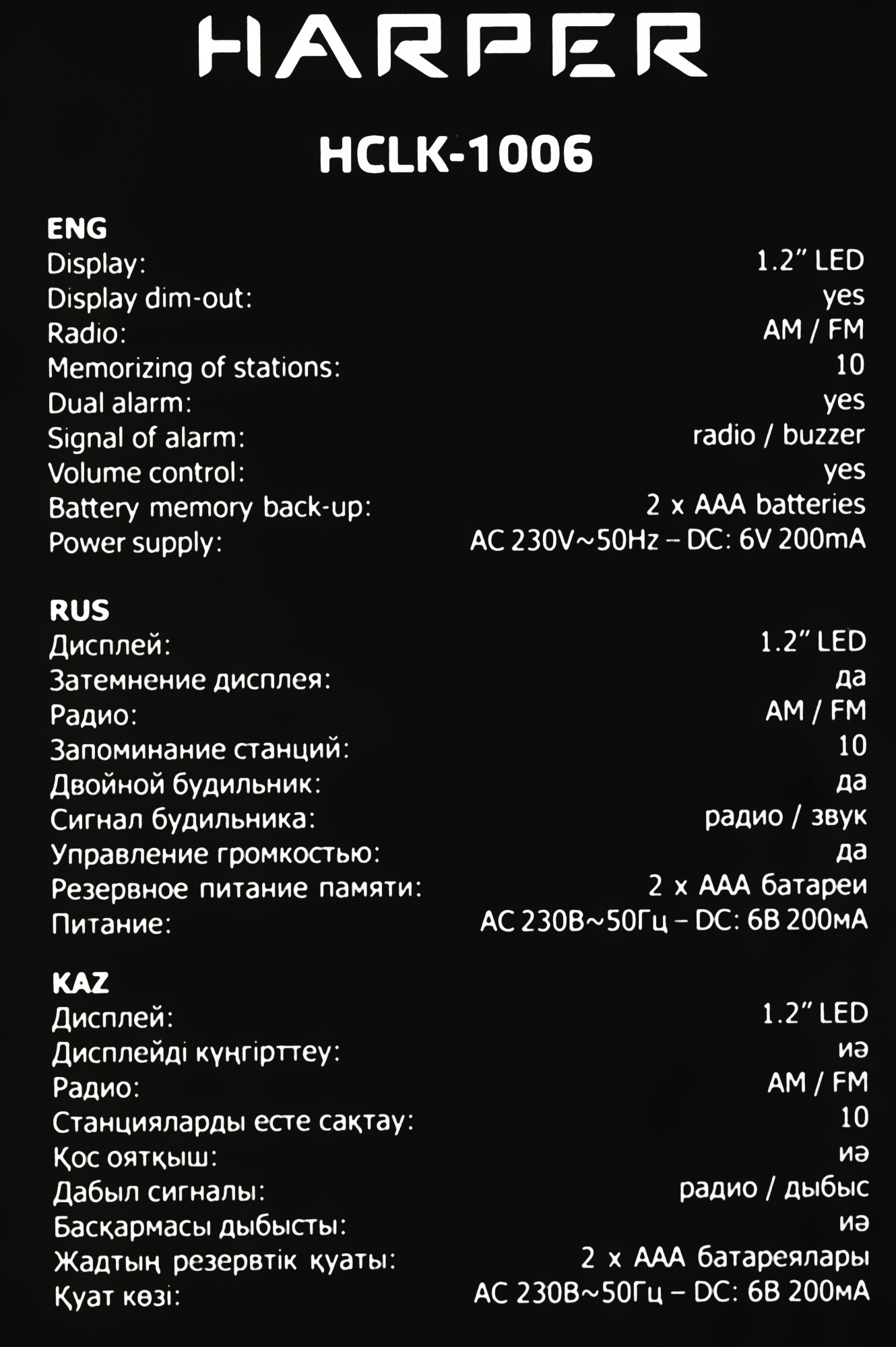 Два независимых будильника. Удобный ночник с гибко регулируемой подсветкой . Если вы любите засыпать под звуки радио, у Harper HCLK-1006 есть функция автоотключения (от 10 до 90 минут). В памяти можно сохранить до 20 каналов, любой из них можно выбрать вместо стандартной мелодии будильника.