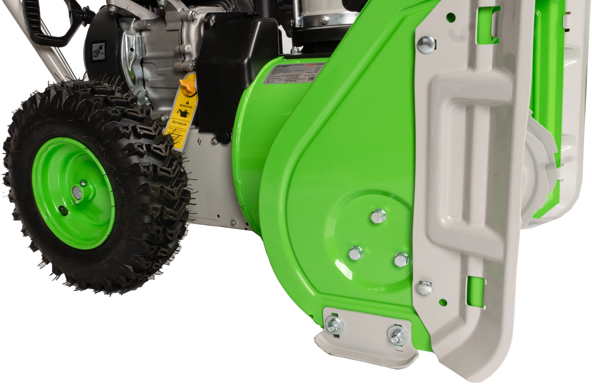Основная части машины в частично разобранном виде; ручка; желоб снегоотбрасывателя; транспортировочные колеса; комплект крепежа; разъёмное скользящее кольцо поворотного жёлоба.