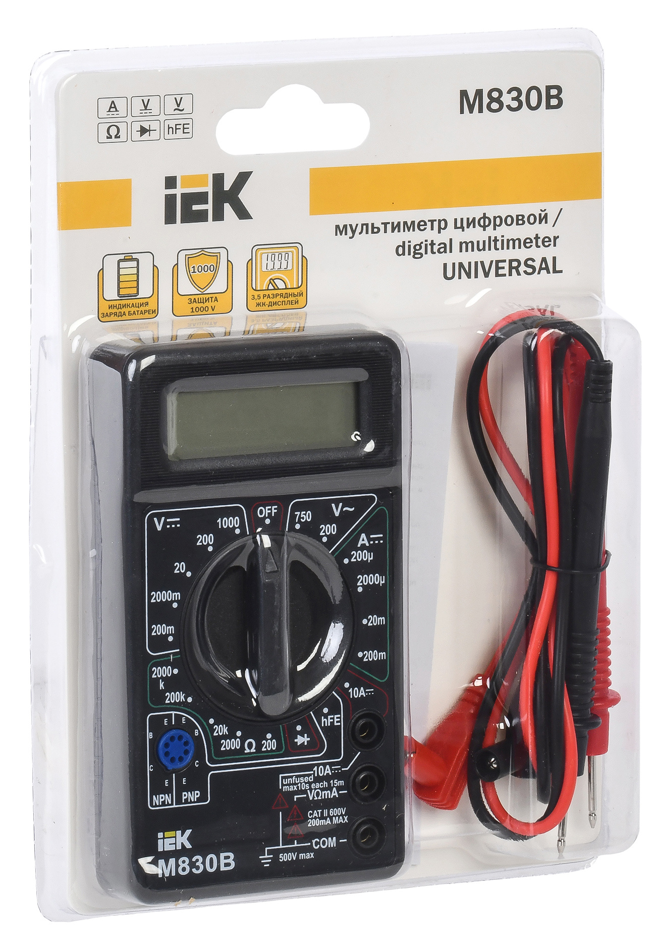 Мультиметр, тестовые щупы, батарея 9 В, руководство по эксплуатации, упаковка.