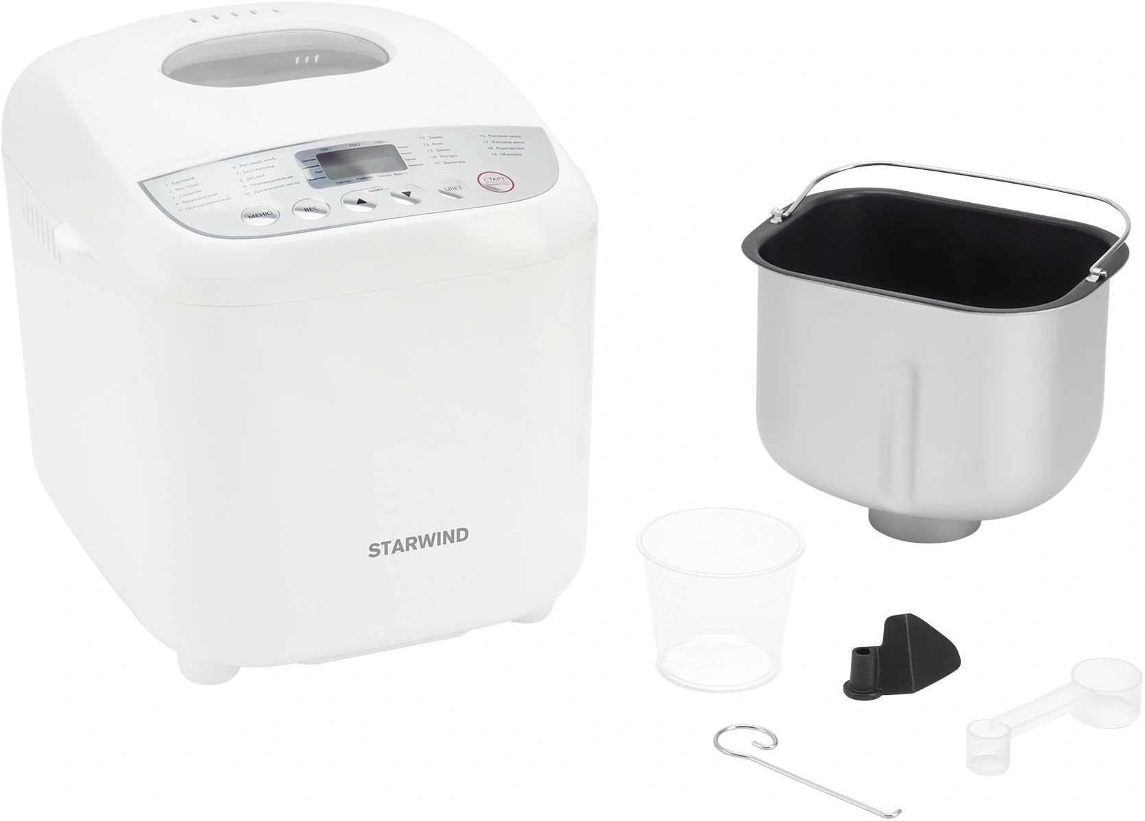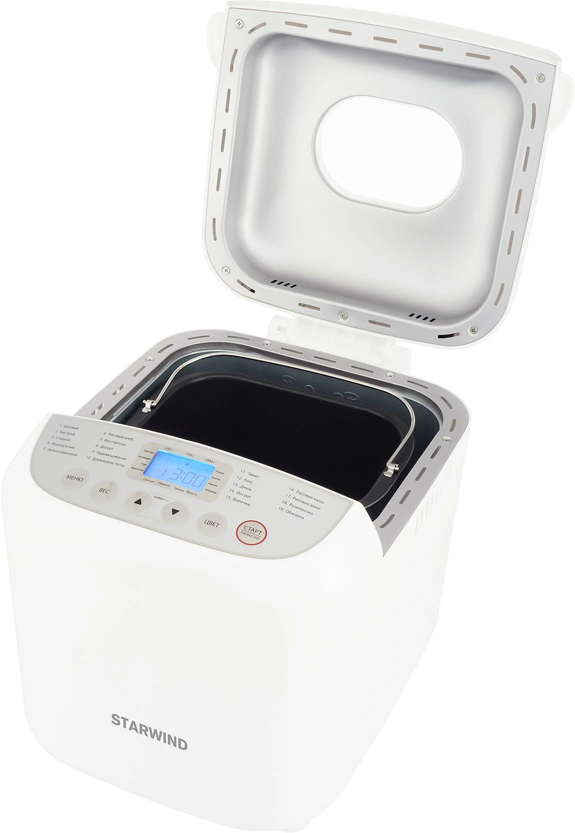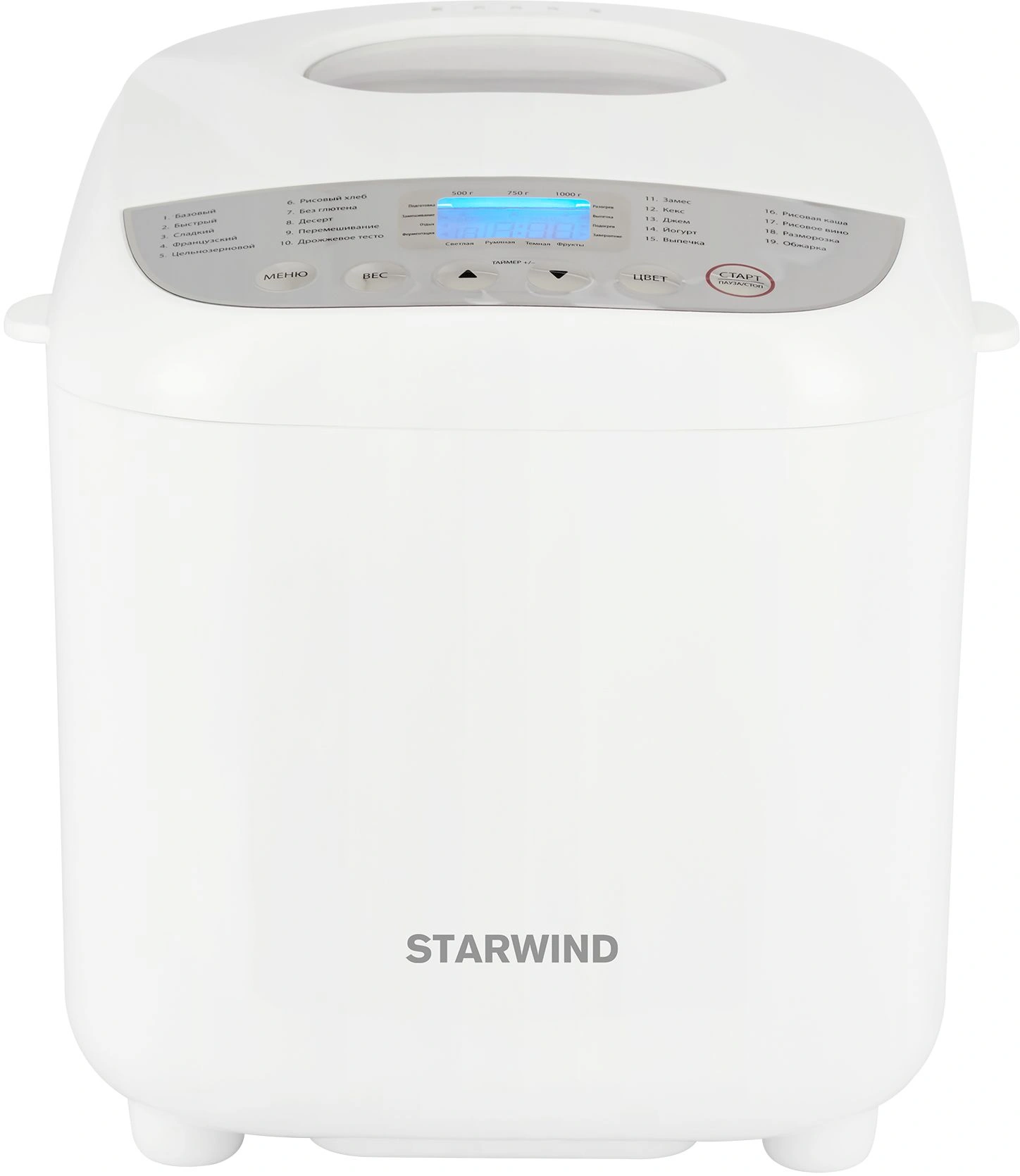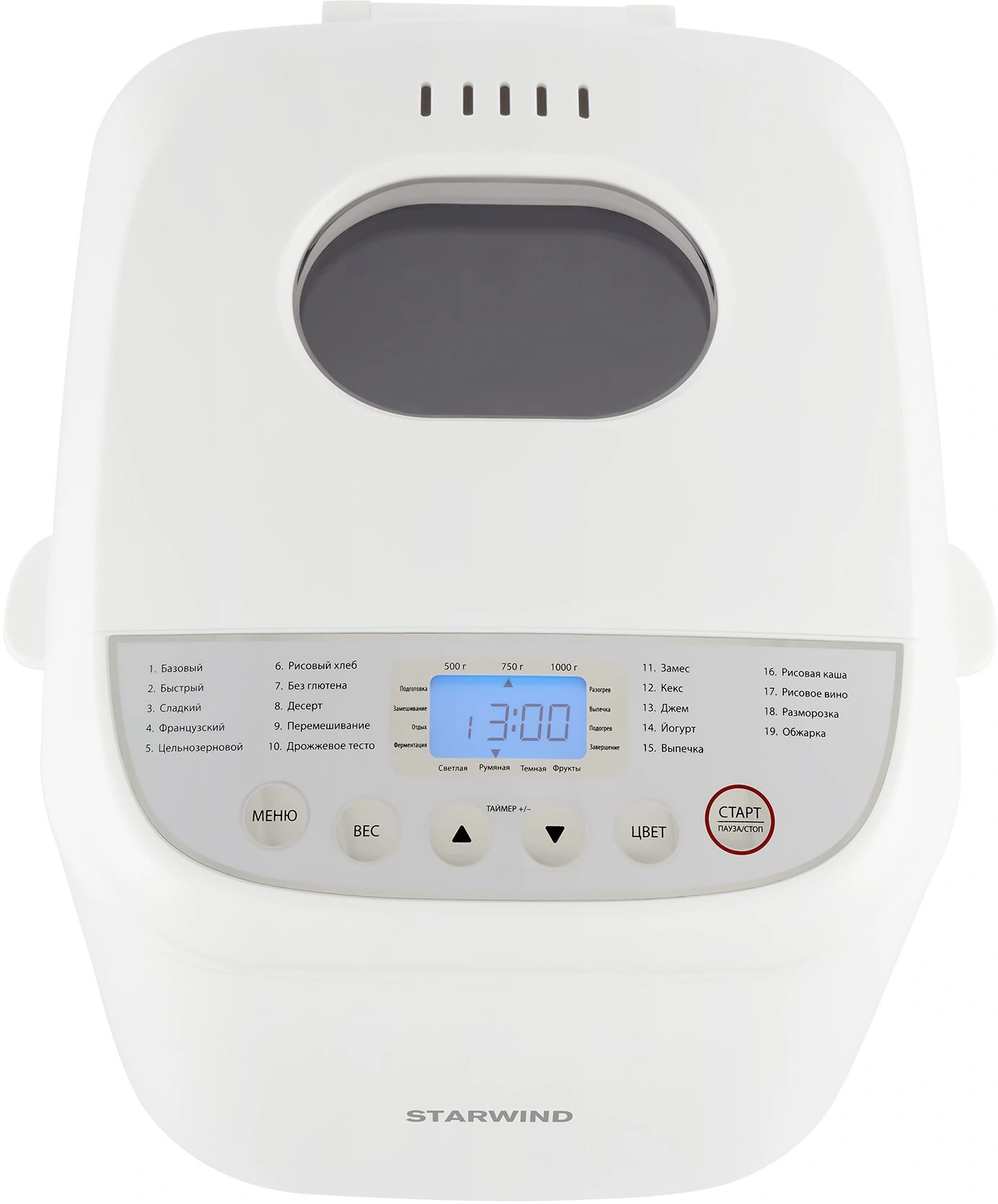 Хлебопечь STARWIND SBM2085 хоть и выглядит достаточно скромно, обладает высокой производительностью. Такую бытовую технику обязательно оценит каждая современная хозяйка. Здесь реализована интуитивно понятная панель управления, а внешний вид – строгий и лаконичный. Изделие выполнено в белом цвете, дополнено серебристыми вставками. Мощность хлебопечки находится на уровне 600 Вт. Этого вполне достаточно для быстрого получения буханки весом 900 грамм. Опционально предусмотрено 19 программ приготовления, каждая хозяйка выберет нужный для нее вариант. Изготавливается техника на основе прочного пластика.