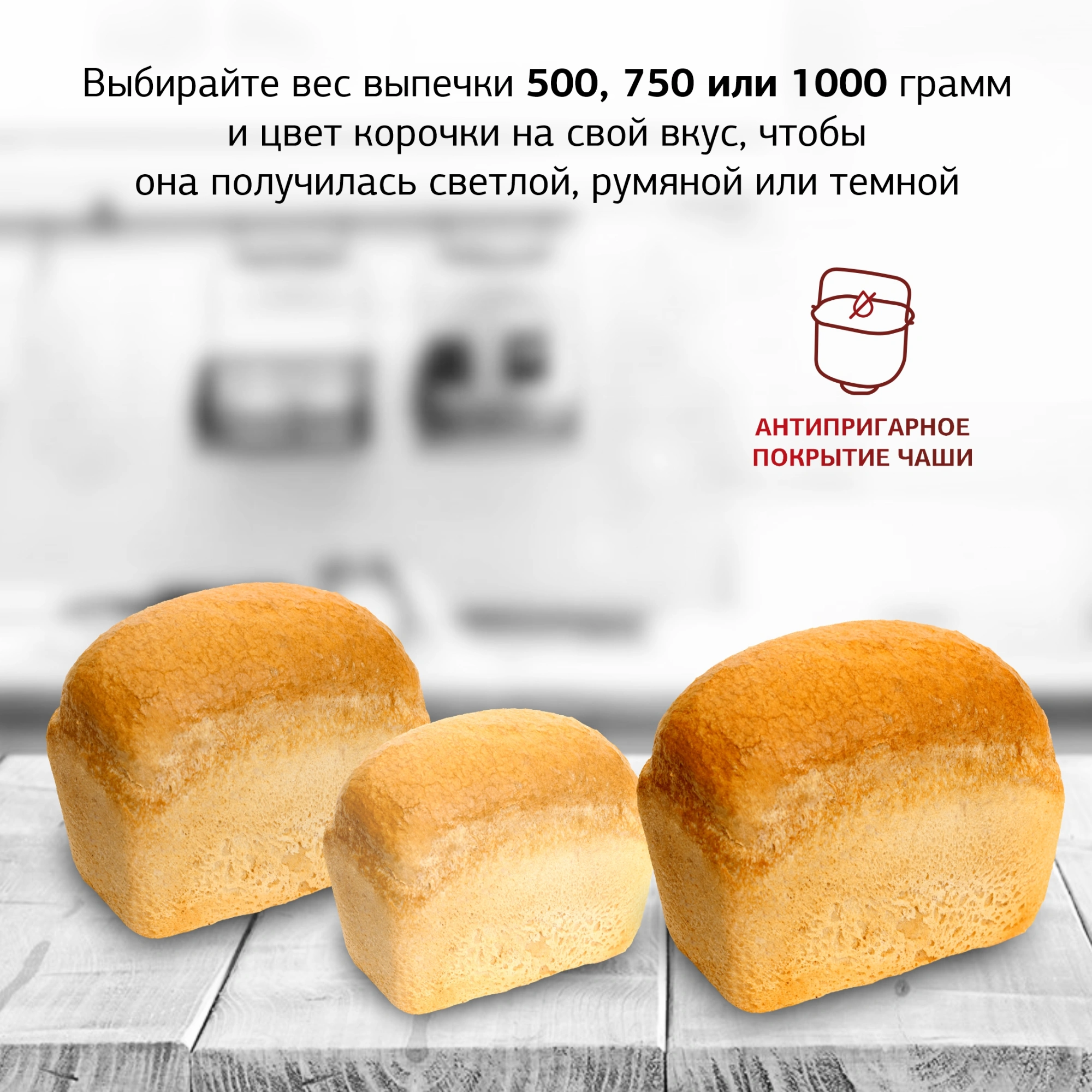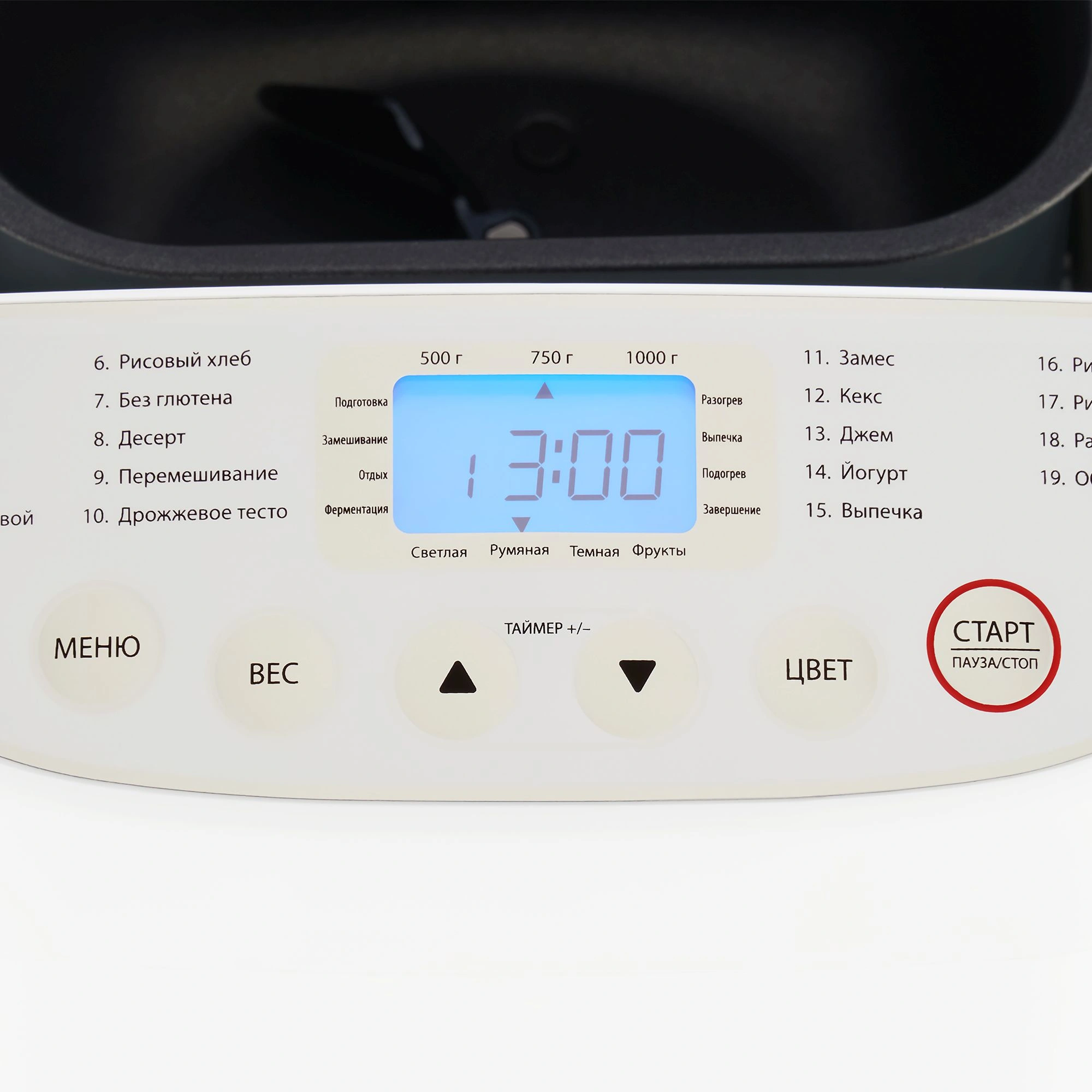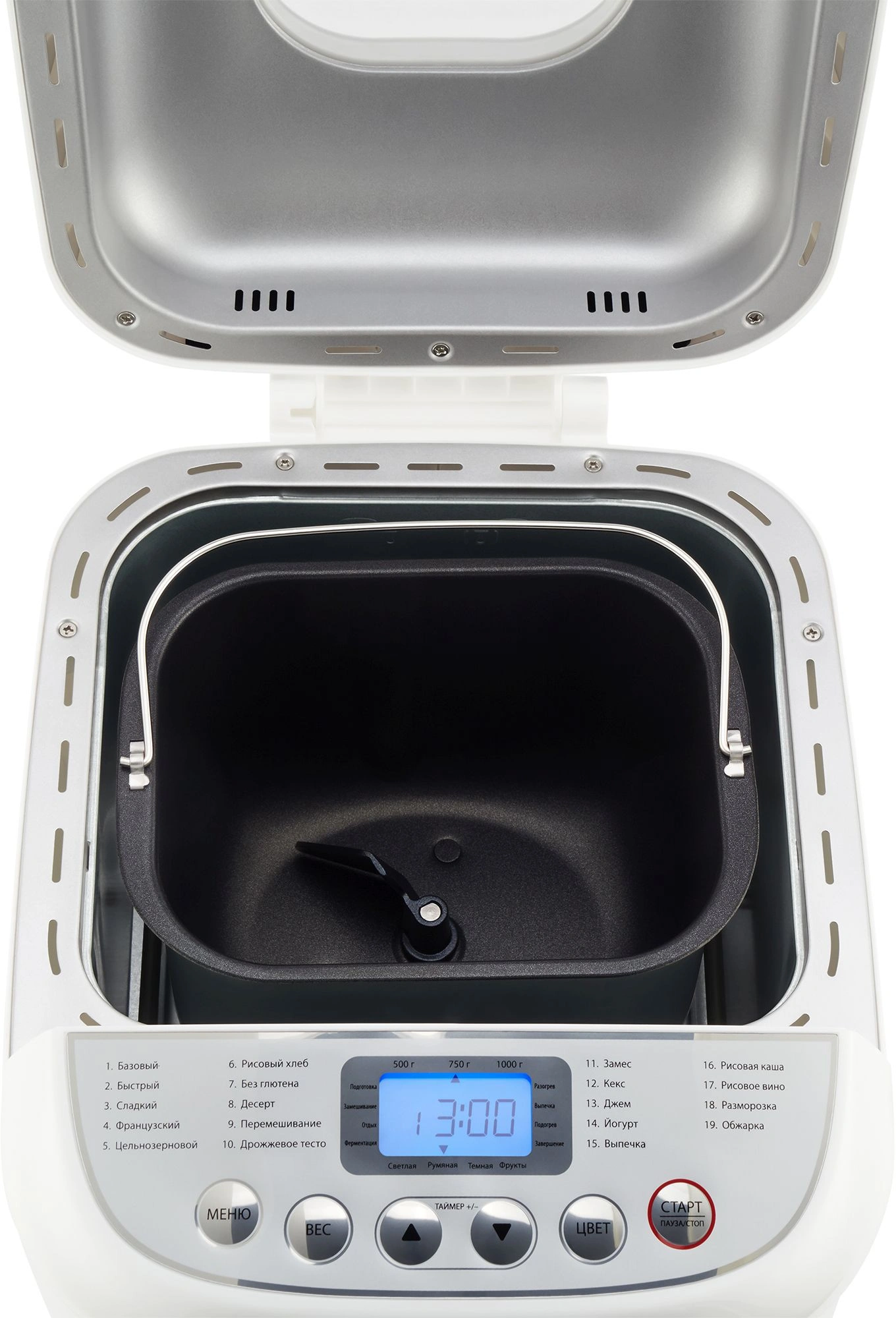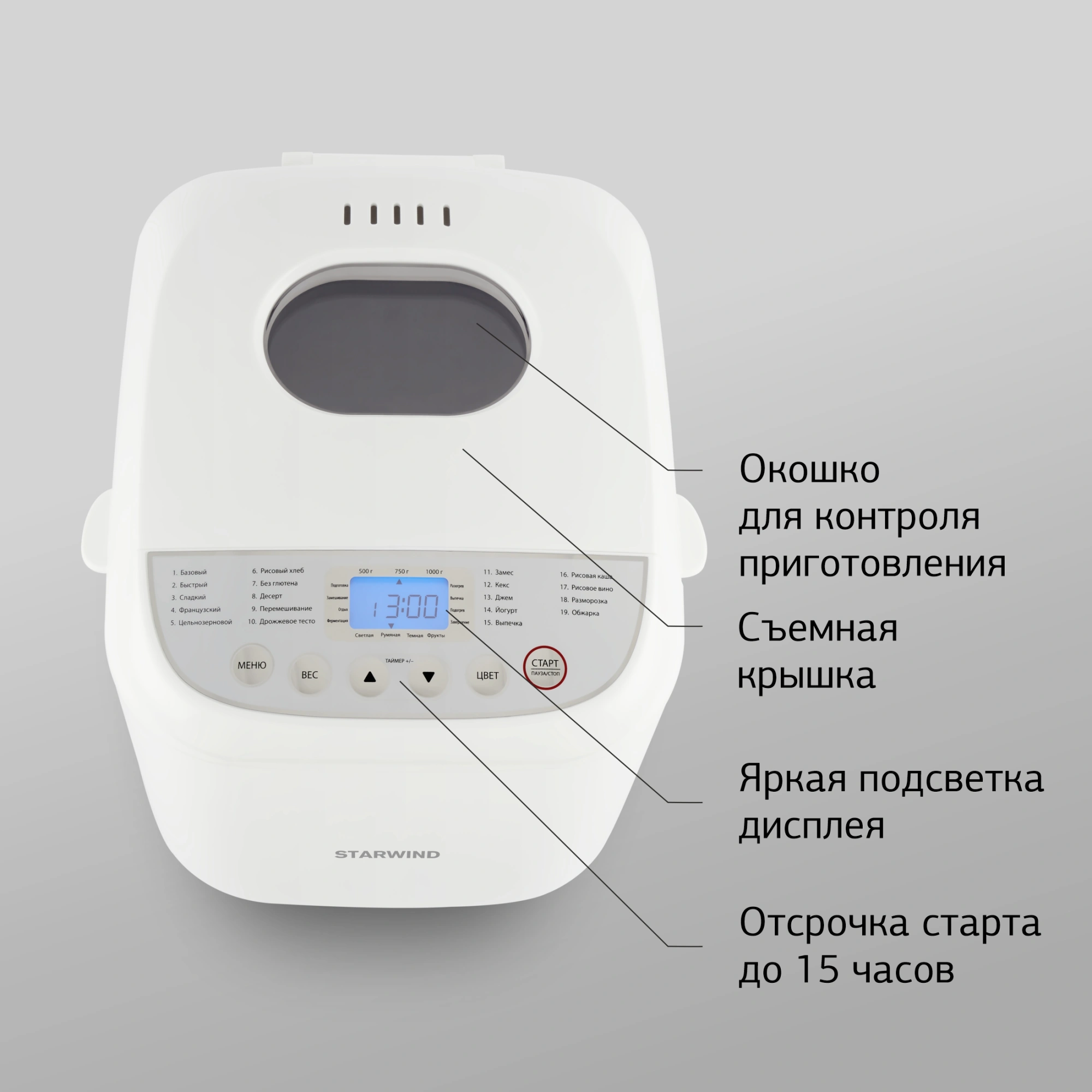 Хлебопечь STARWIND SBM2085 хоть и выглядит достаточно скромно, обладает высокой производительностью. Такую бытовую технику обязательно оценит каждая современная хозяйка. Здесь реализована интуитивно понятная панель управления, а внешний вид – строгий и лаконичный. Изделие выполнено в белом цвете, дополнено серебристыми вставками. Мощность хлебопечки находится на уровне 600 Вт. Этого вполне достаточно для быстрого получения буханки весом 900 грамм. Опционально предусмотрено 19 программ приготовления, каждая хозяйка выберет нужный для нее вариант. Изготавливается техника на основе прочного пластика.