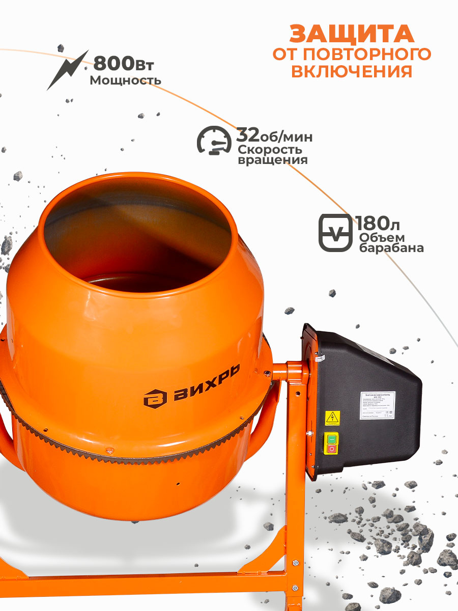 Бетономешалка ВИХРЬ БМ-180 – строительный инструмент, используемый для приготовления различных видов строительных смесей и бетонного раствора. Подходит для строительстве частного дома.