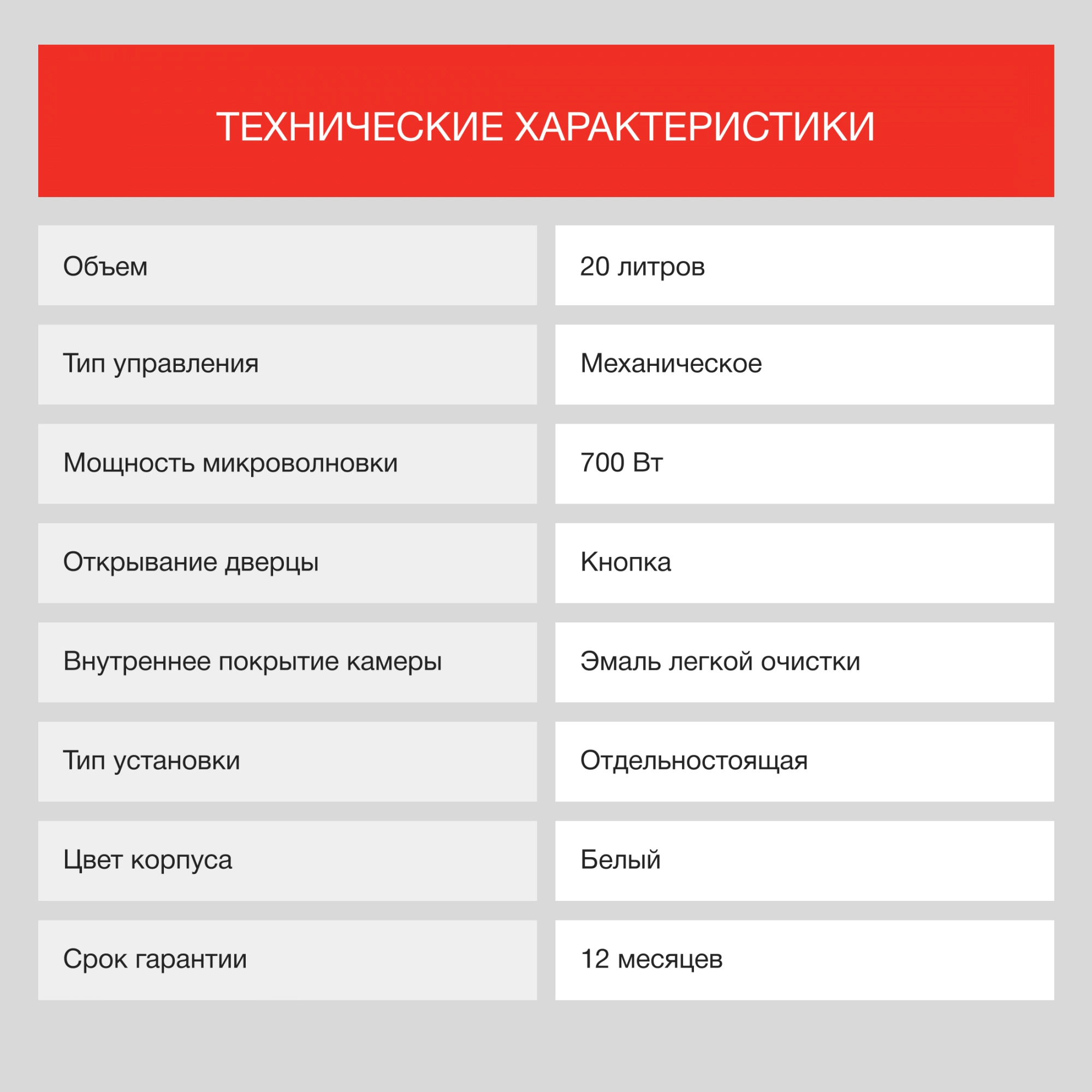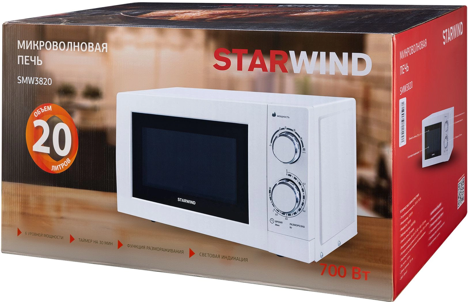 Микроволновая печь Starwind SMW3820 выполнена в классическом дизайне, который будет идеально смотреться в любом интерьере кухонного пространства. Бытовой прибор изготовлен из качественного пластика и металла, им не страшны случайные механические воздействия. Благодаря компактным габаритам выбор места для установки не доставит проблем. Мощность микроволновой печи составляет порядка 700 Ватт, а объем камеры для разогрева пищи равен 20 литрам. Здесь предусмотрено механическое управление, дисплей отсутствует. Для открывания дверцы есть кнопка. С помощью прибора можно разогревать, размораживать продукты, а также готовить блюда.