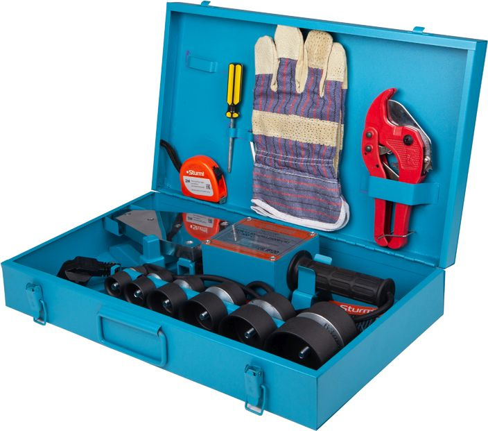 Аппарат для сварки пластиковых труб, труборез, сварочные насадки (6 комплектов), перчатки, рулетка, отвертка, шестигранный гаечный ключ, подставка, кейс инструкция по эксплуатации.