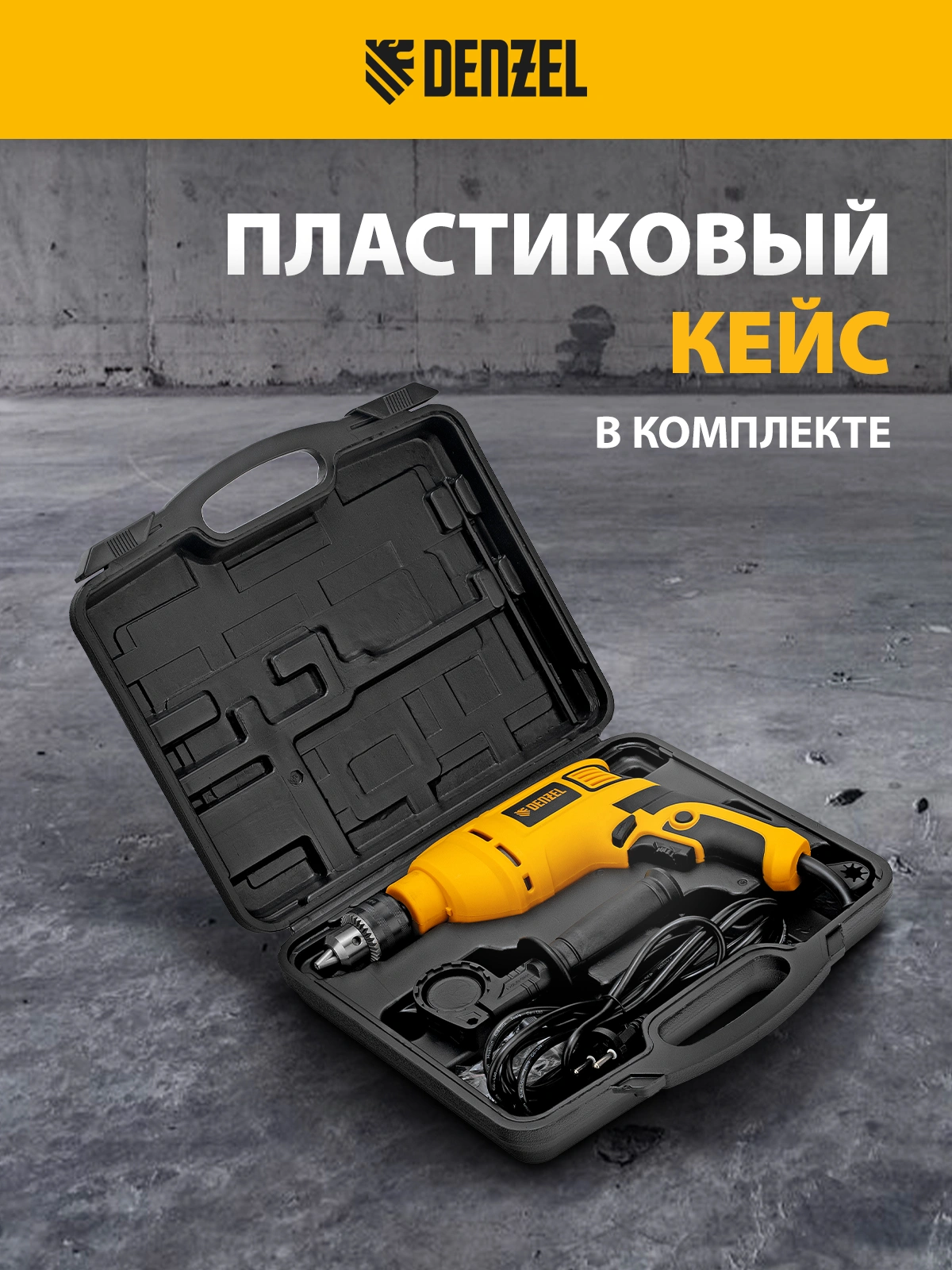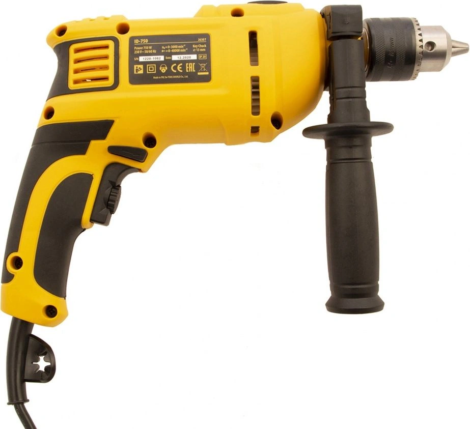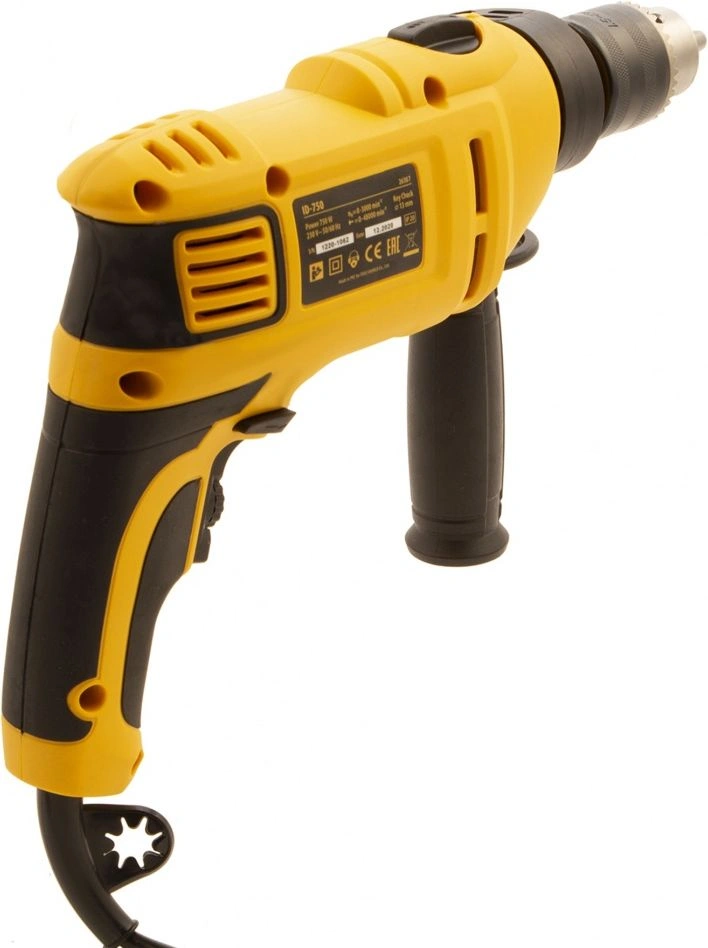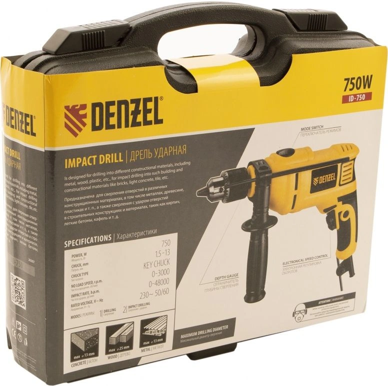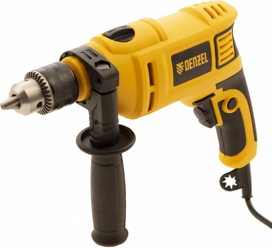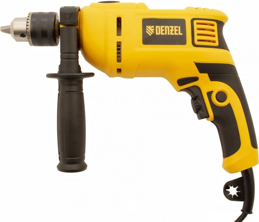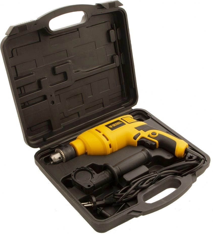 Дрель электрическая ударная, ключ от патрона, рукоятка боковая, ограничитель глубины сверления, комплект запасных угольных щеток, инструкция, гарантийный талон.