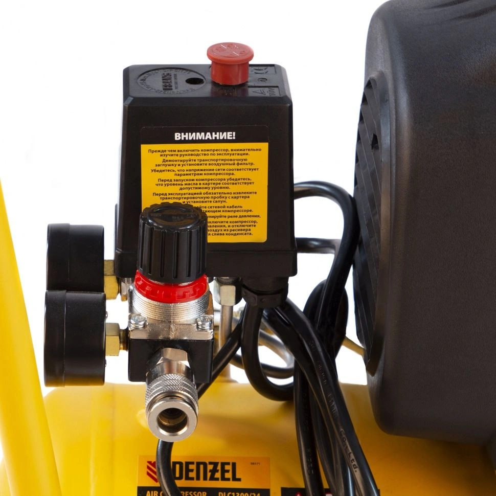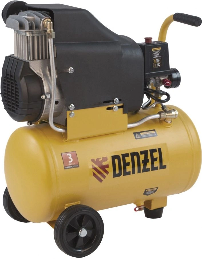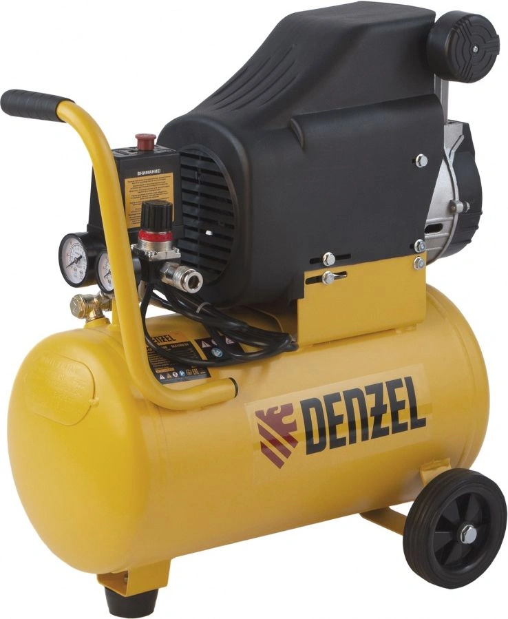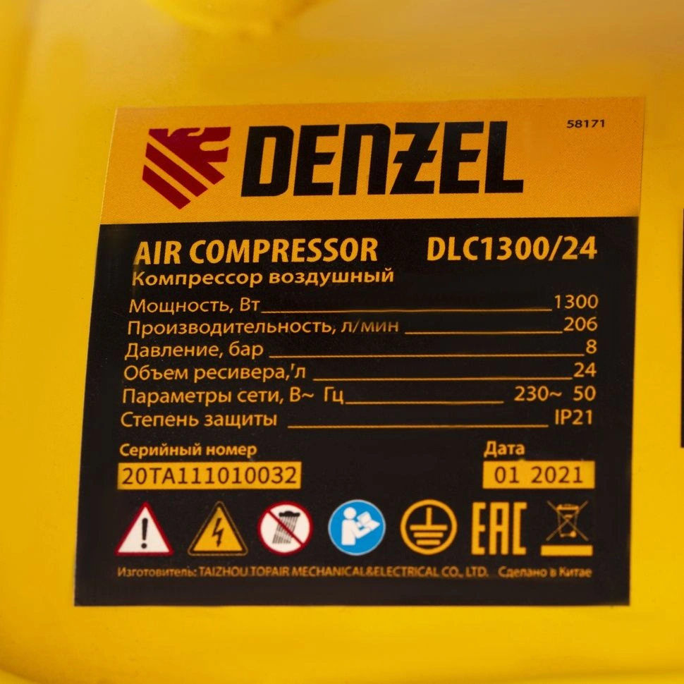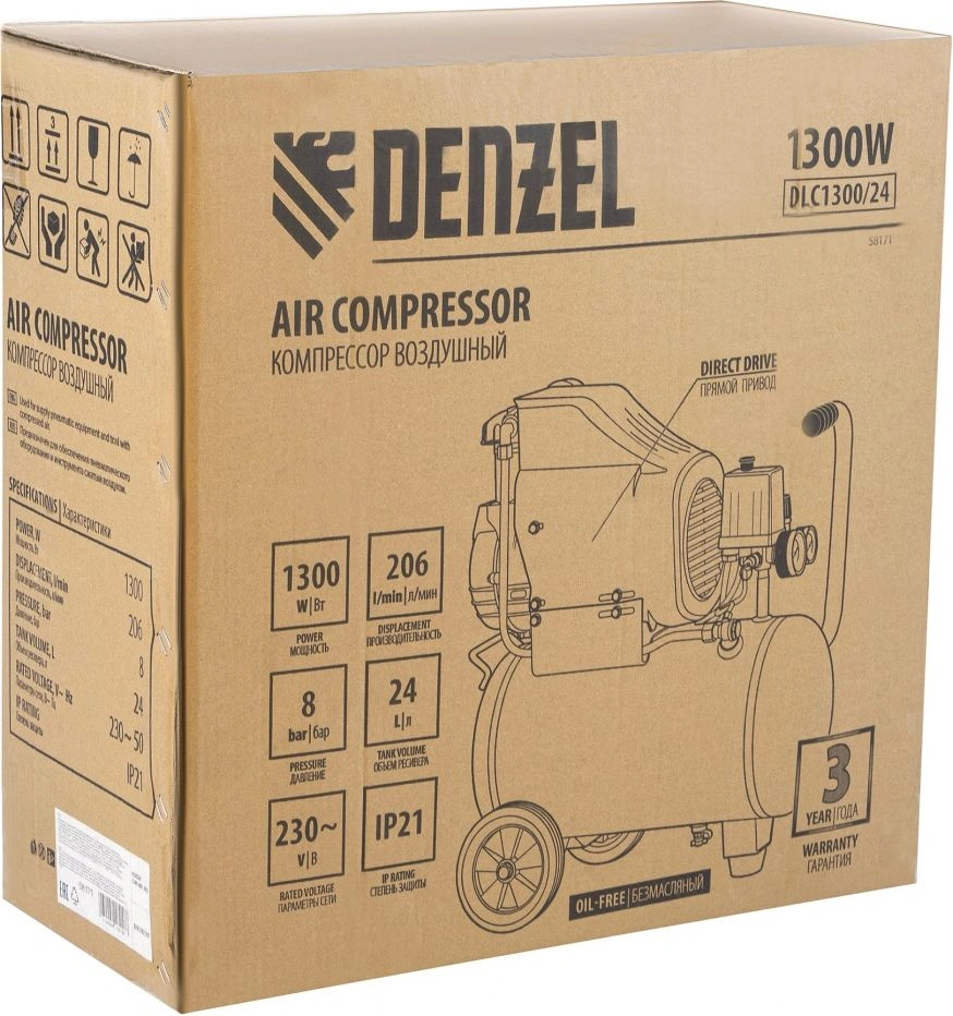 Компрессор Denzel DLC1300/24 с производительностью на входе 206 л/мин обеспечивает на выходе чистый сжатый воздух без примесей масла, что позволяет использовать его при окрашивании, креплении паркета и вагонки, продувке электронной техники, накачке шин.