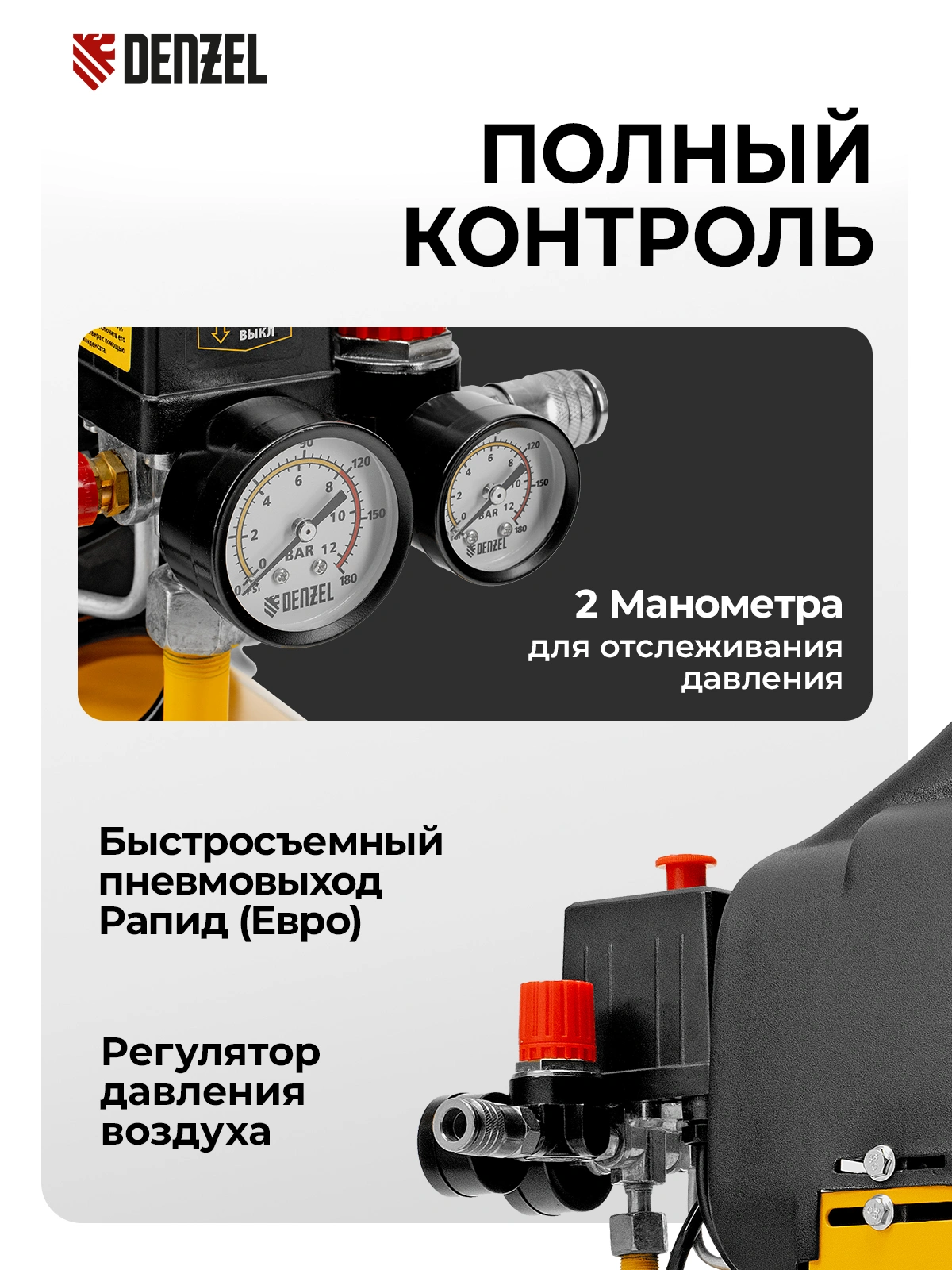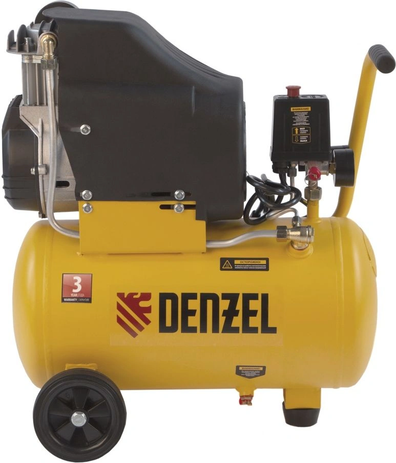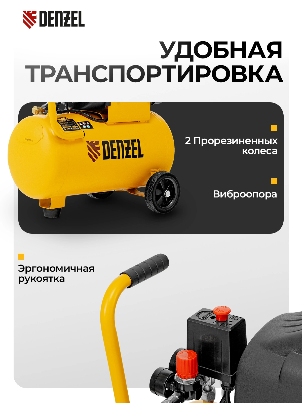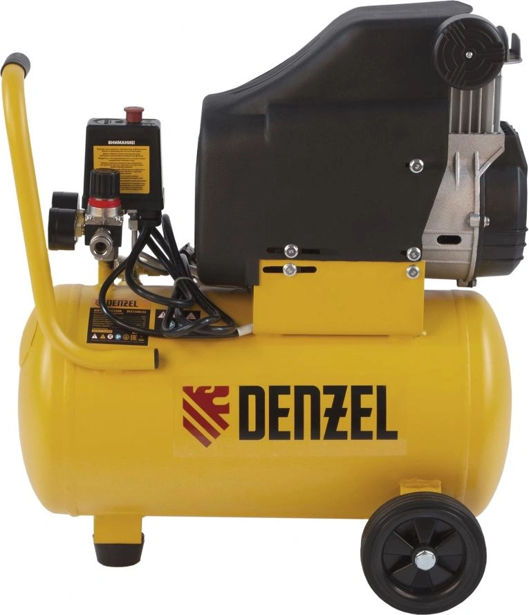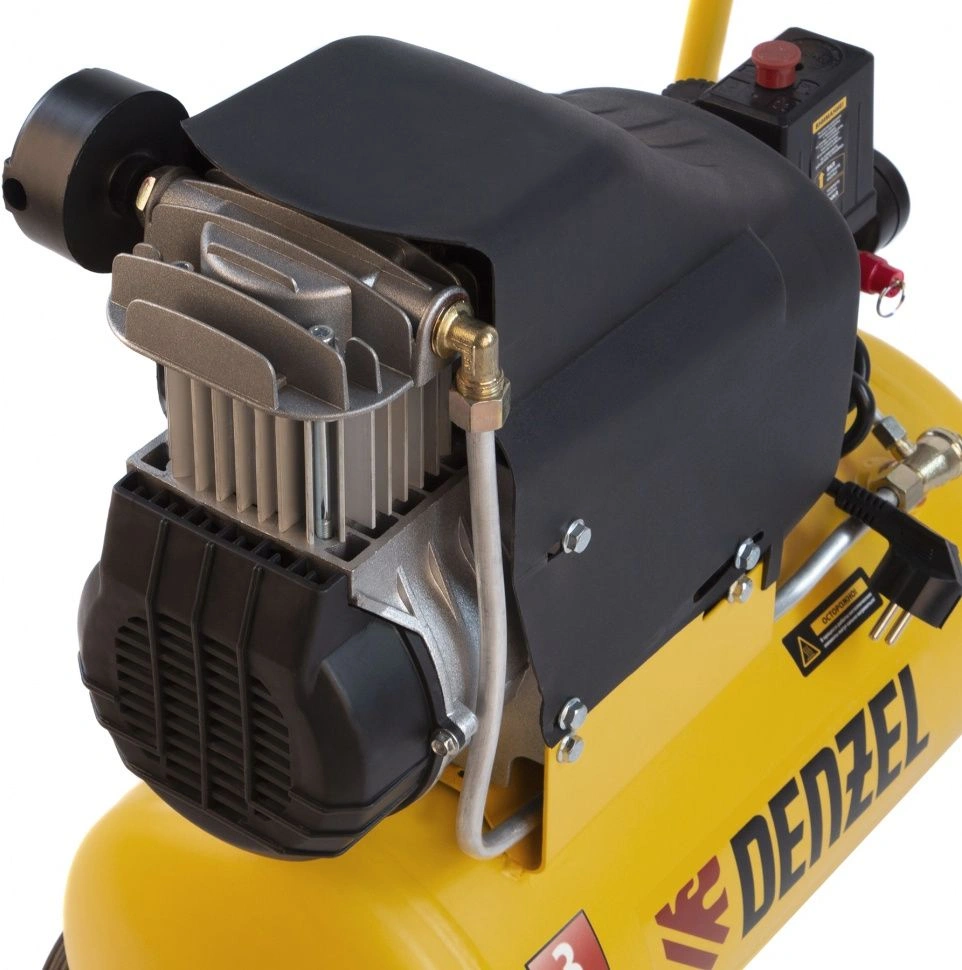 Компрессор Denzel DLC1300/24 с производительностью на входе 206 л/мин обеспечивает на выходе чистый сжатый воздух без примесей масла, что позволяет использовать его при окрашивании, креплении паркета и вагонки, продувке электронной техники, накачке шин.