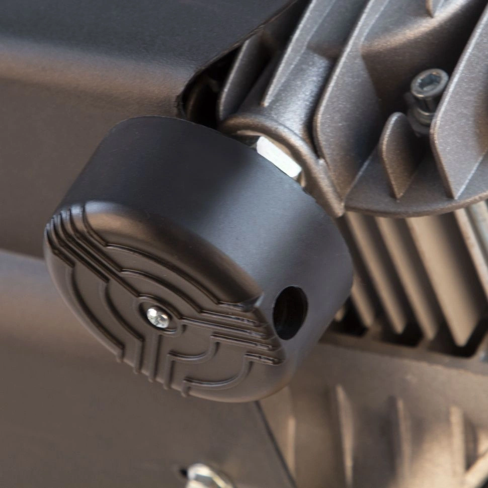 Антивибрационные опоры, колеса для перемещения, кожух полностью закрывает цилиндр. Защита от перегрева, производимый воздух без примесей масла, цилиндр из чугуна и с антифрикционным покрытием, не требуется масло для смазки.